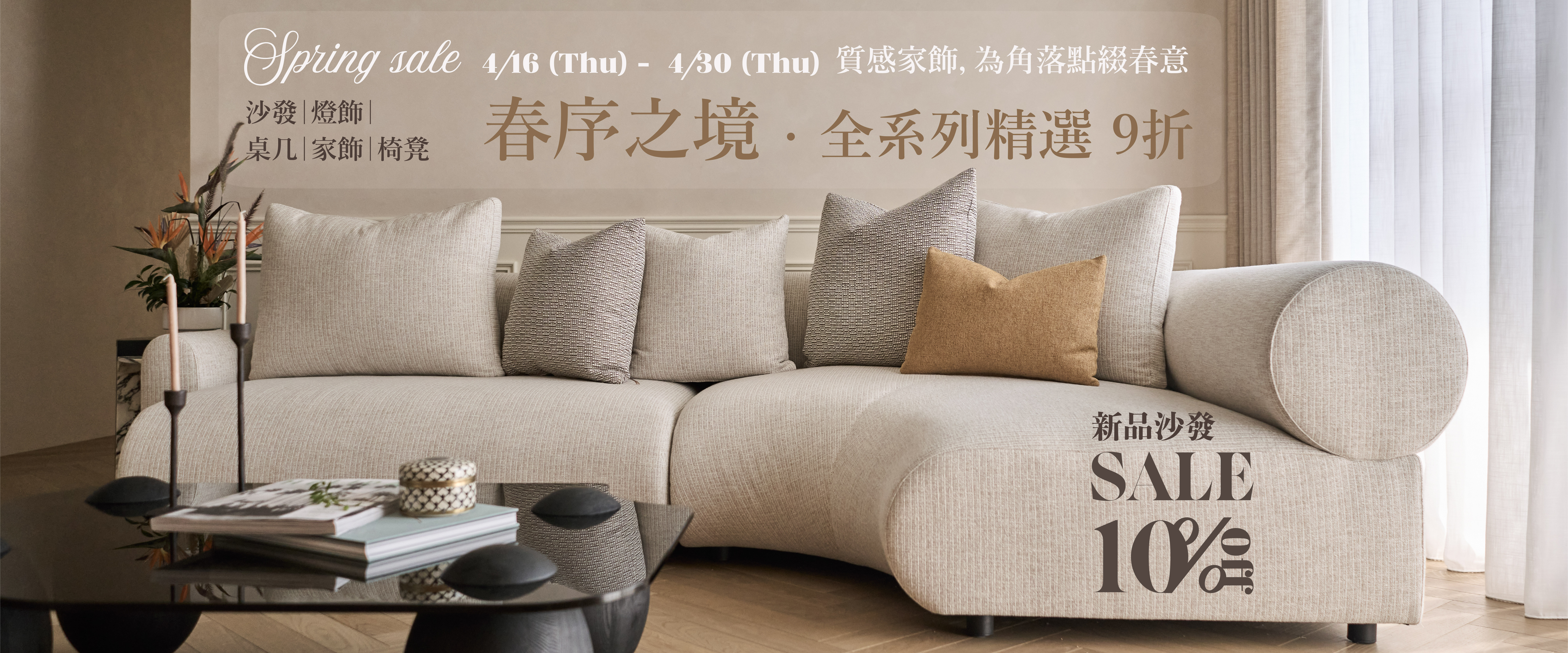 4/16(四)-4/30(四),凡指定品項椅凳、沙發、桌几、燈飾、家飾類商品,下單即享9折優惠!