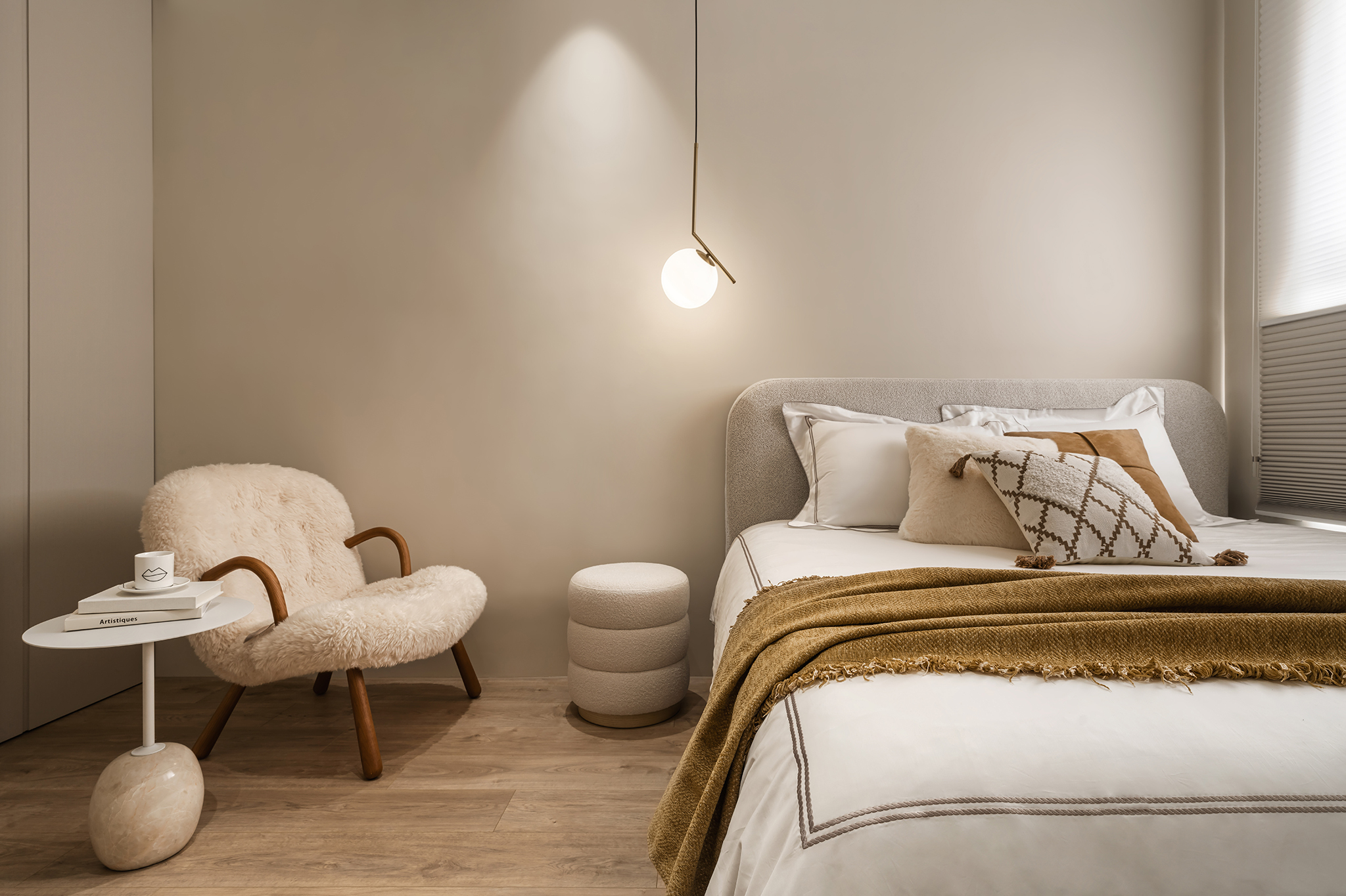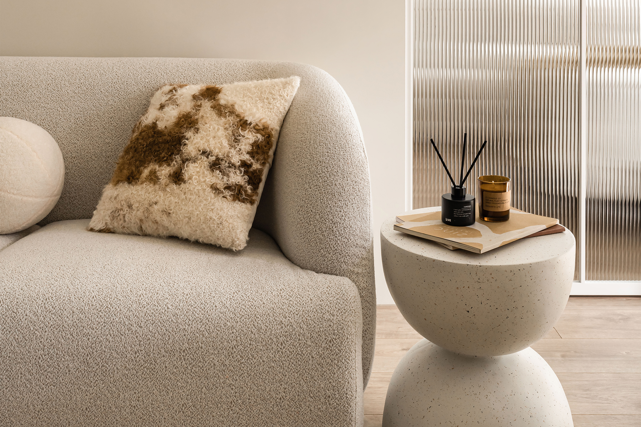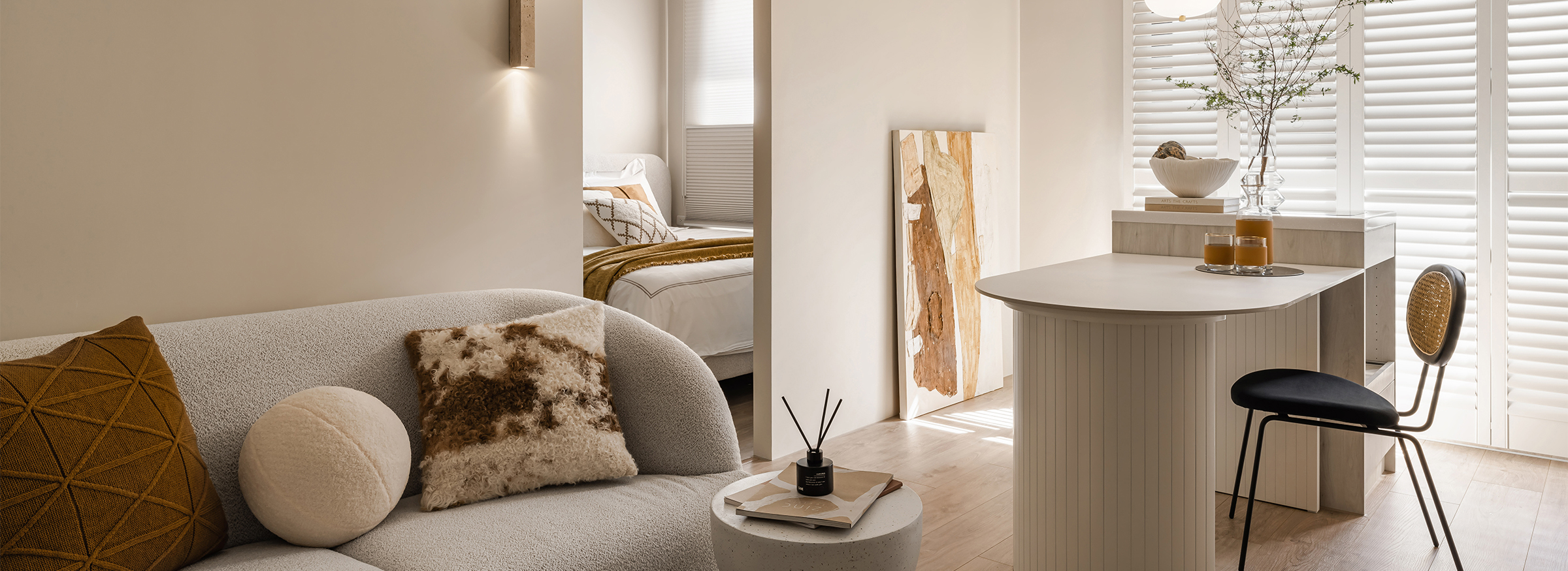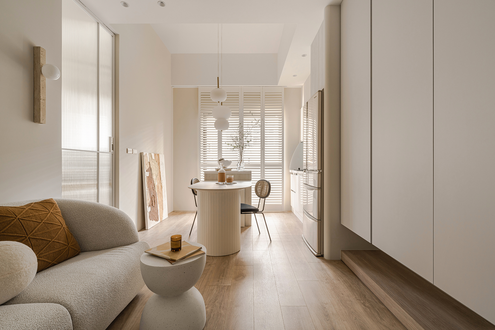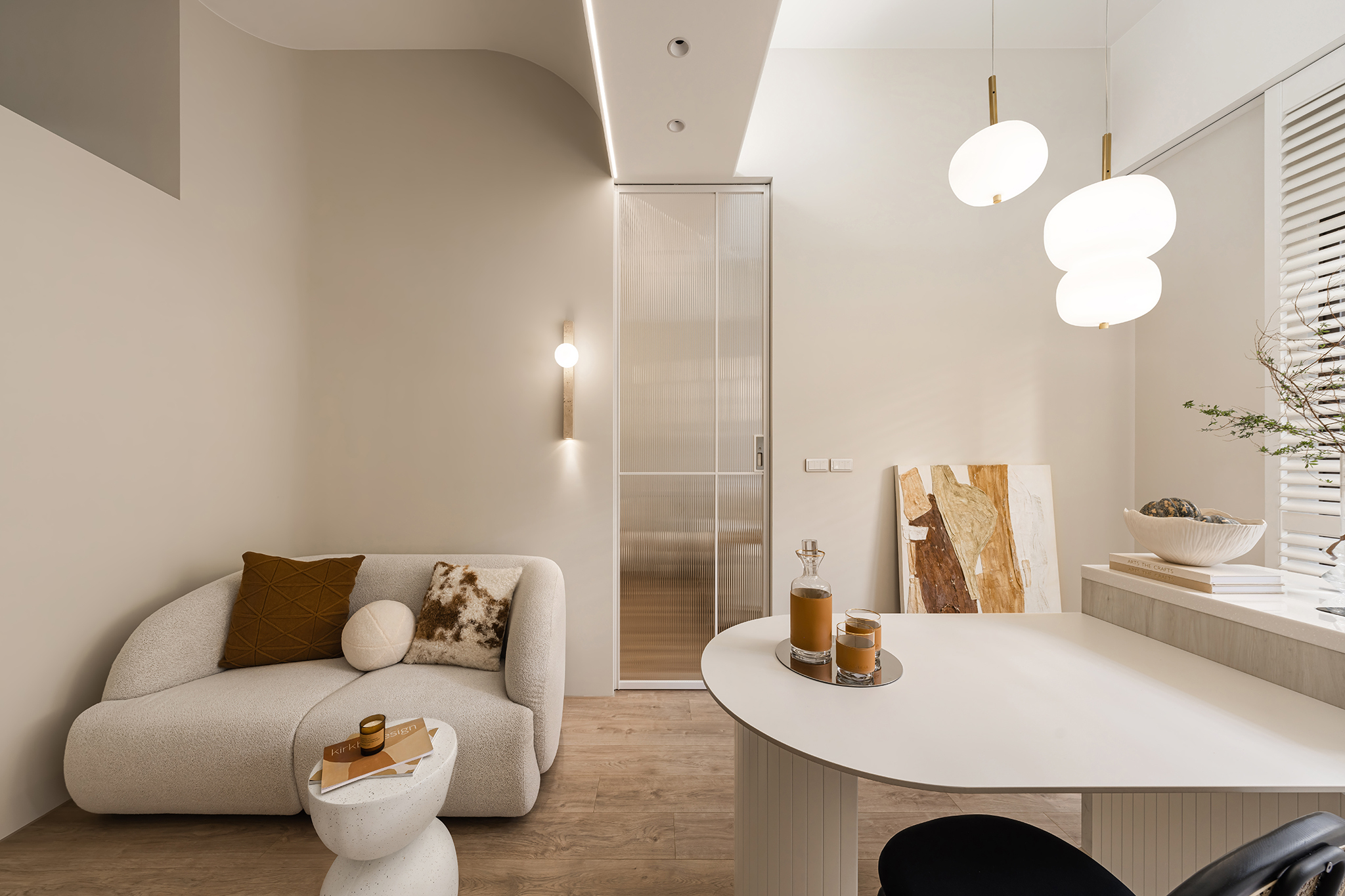 沙發背牆延續玄關的圓弧設計;軟裝選用造型小巧的雙人沙發搭配水磨石小茶几,打造線條柔和的空間,讓新生兒的日常生活也不怕碰撞。