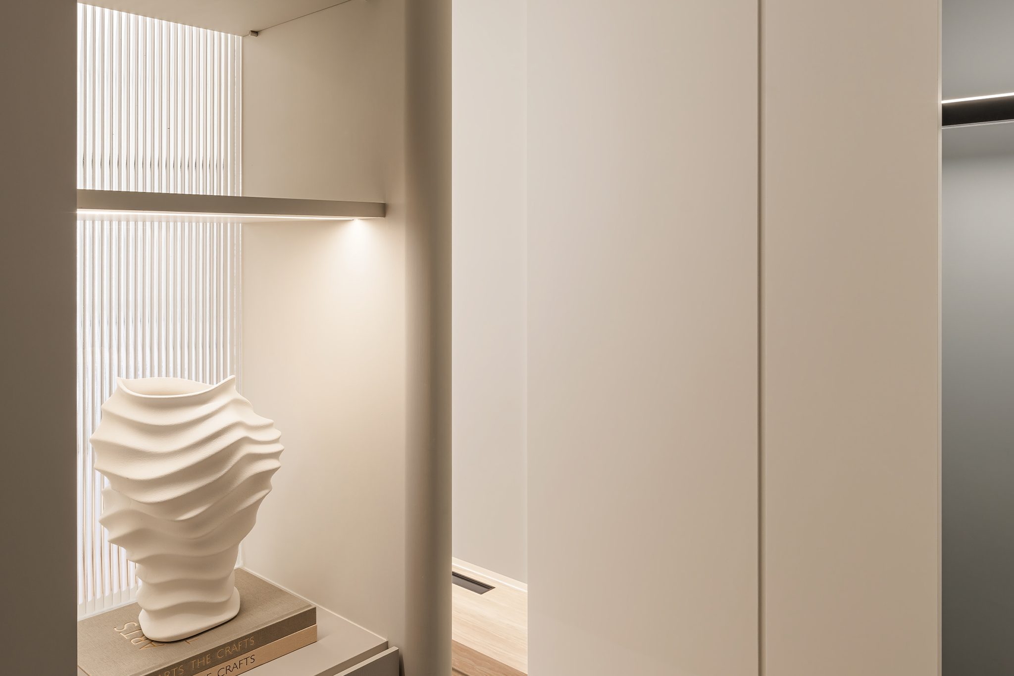 以挑高鞋櫃作為屏風,兼顧收納與風水,並加入長虹玻璃保持空間通透感。