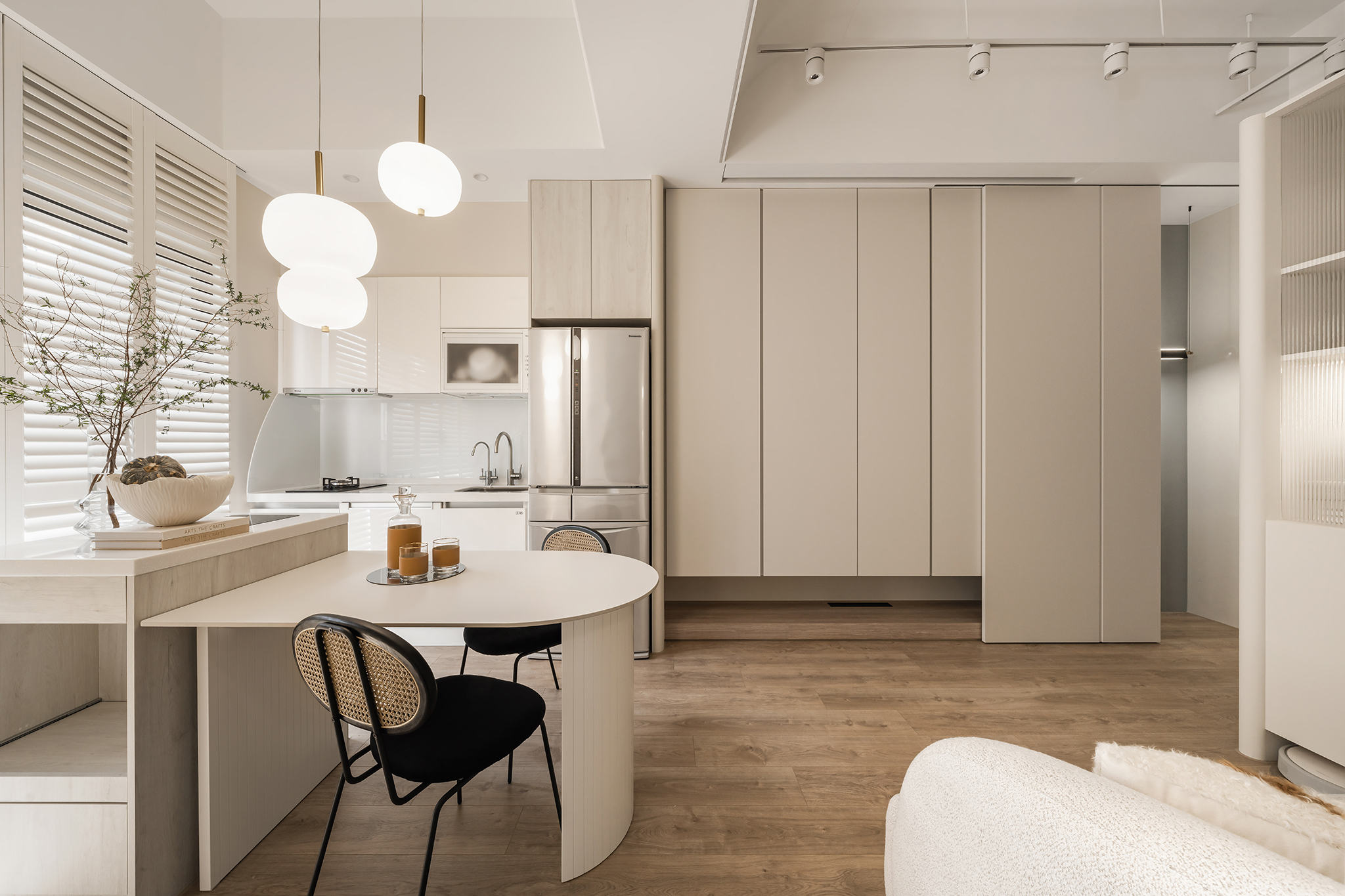 保留建商原有廚具,搭配馬蹄形薄板餐桌及附有IH爐的中島,搖身一變成為廚房與餐廳兼用的複合式空間。