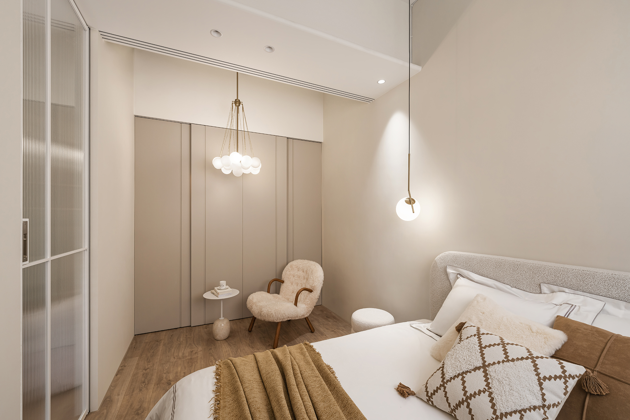 以長虹玻璃作為主臥的房門,讓光線也能進入不同空間