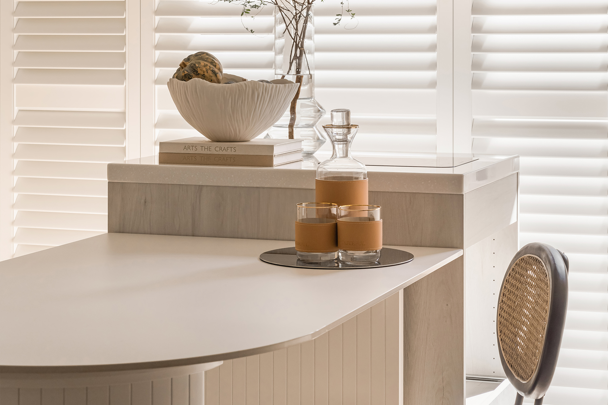一氣呵成的牆面除了大面積收納外,還兼具投影幕功能,同時也是隱藏式的書桌區,滿足居家辦公的需求。