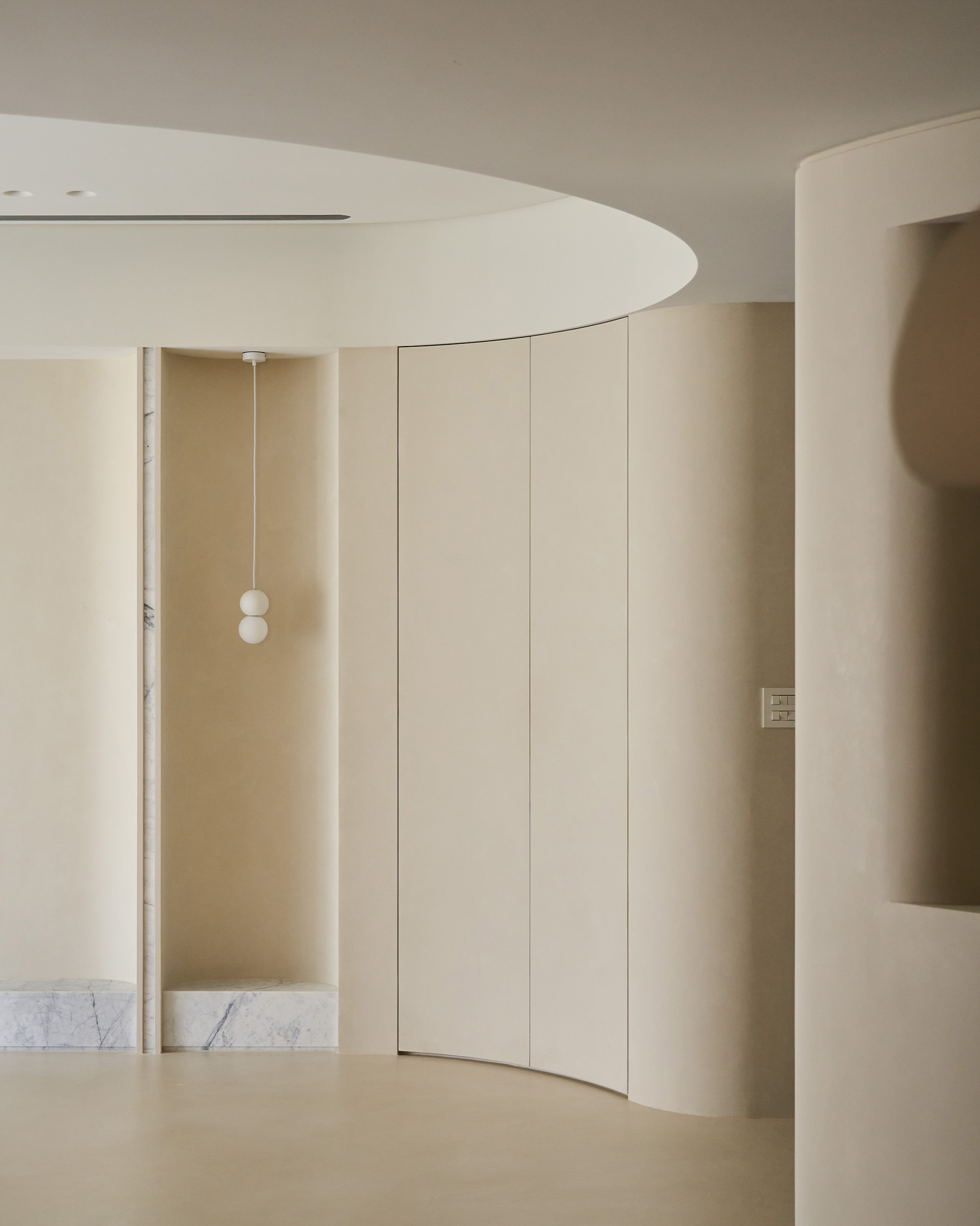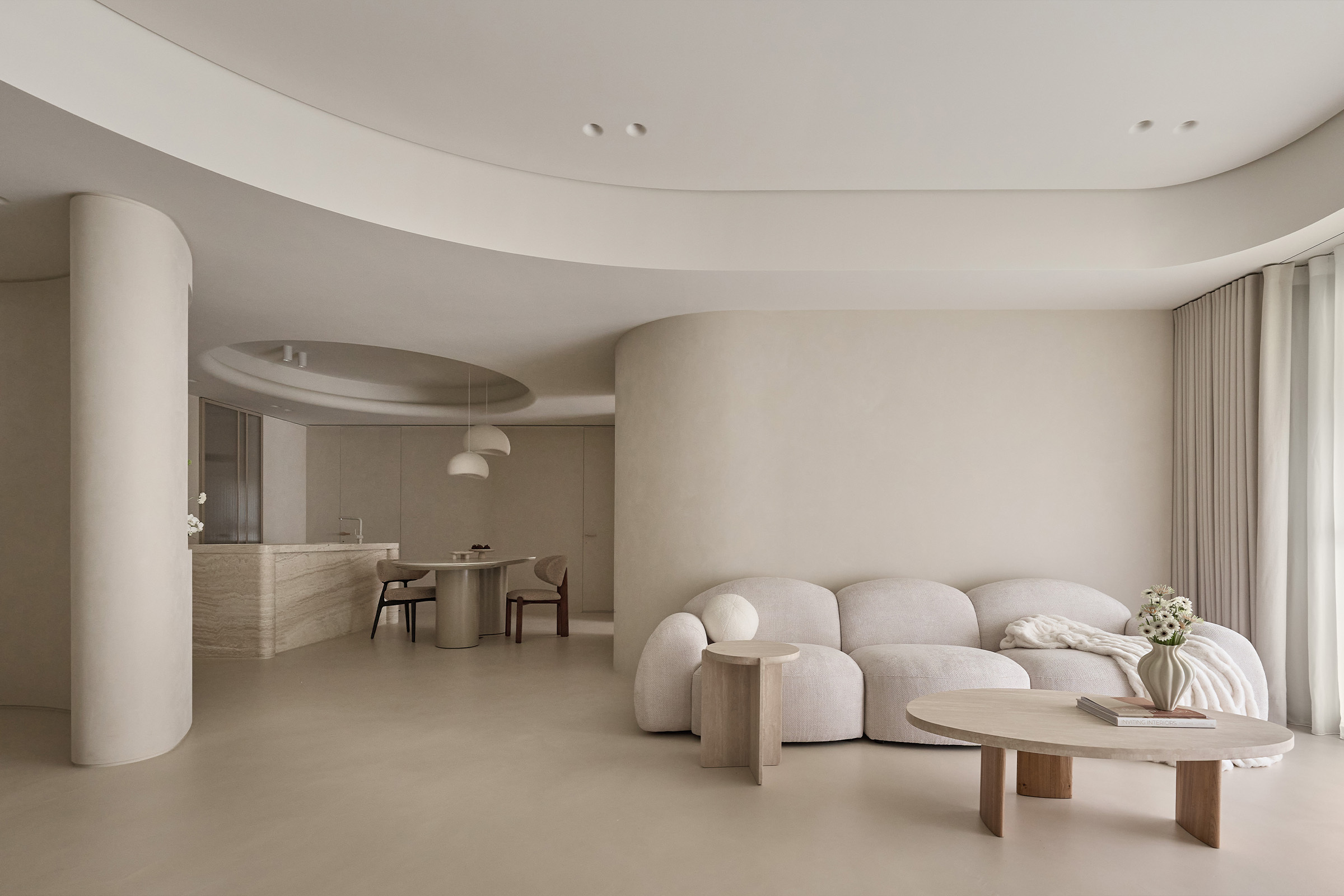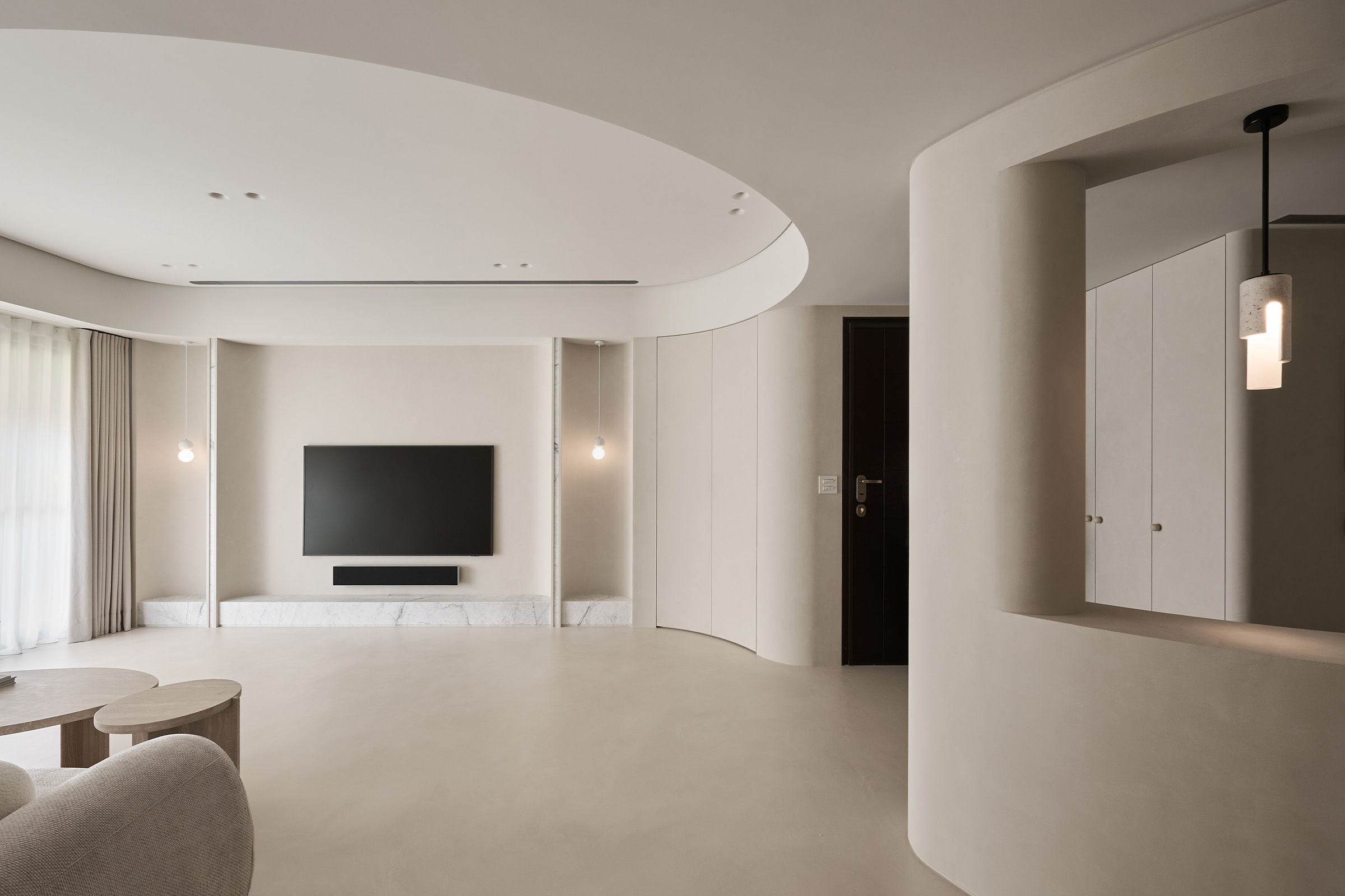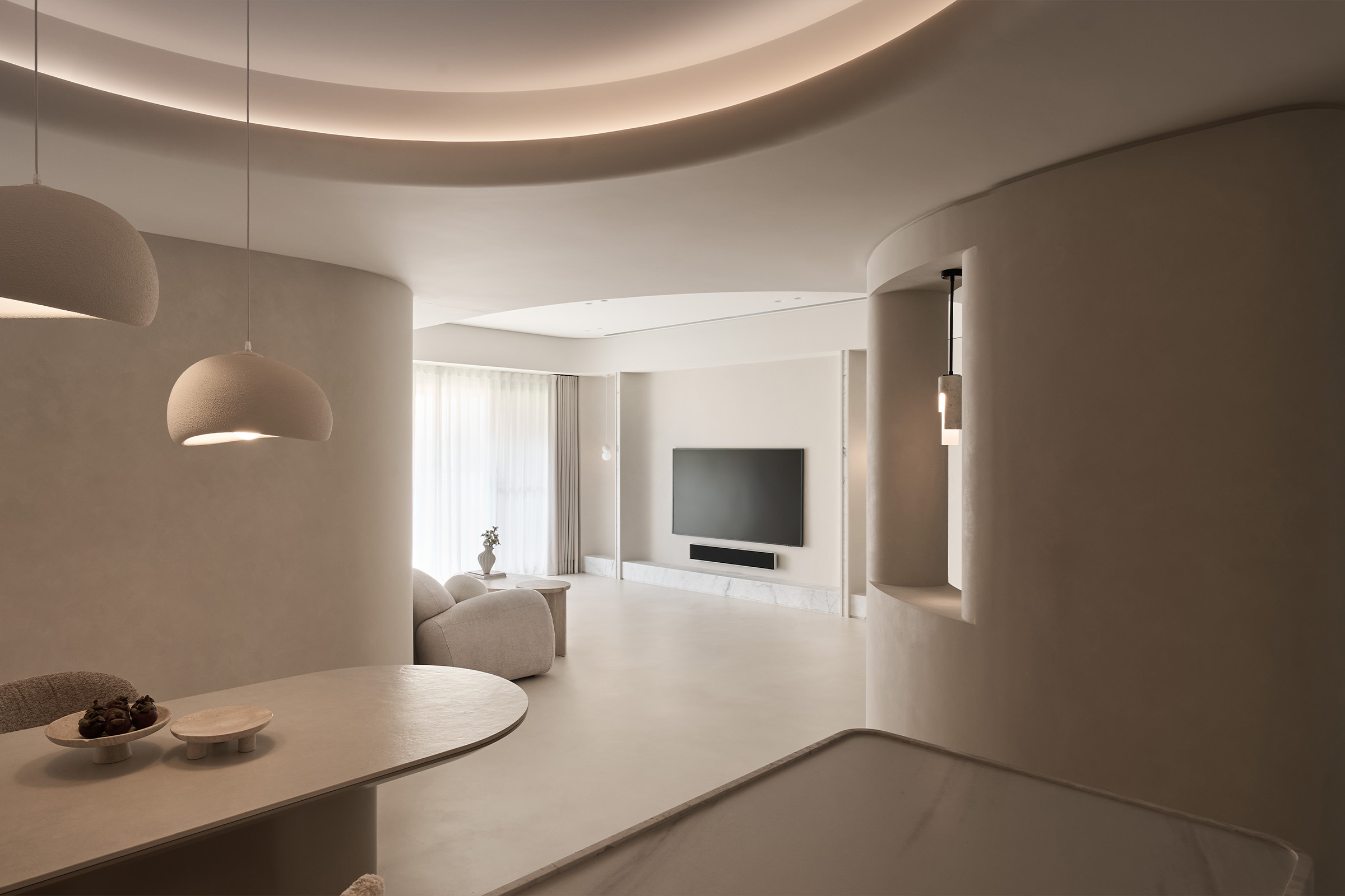 弧形天花的延伸,它柔化了界線,也牽引出空間的律動。