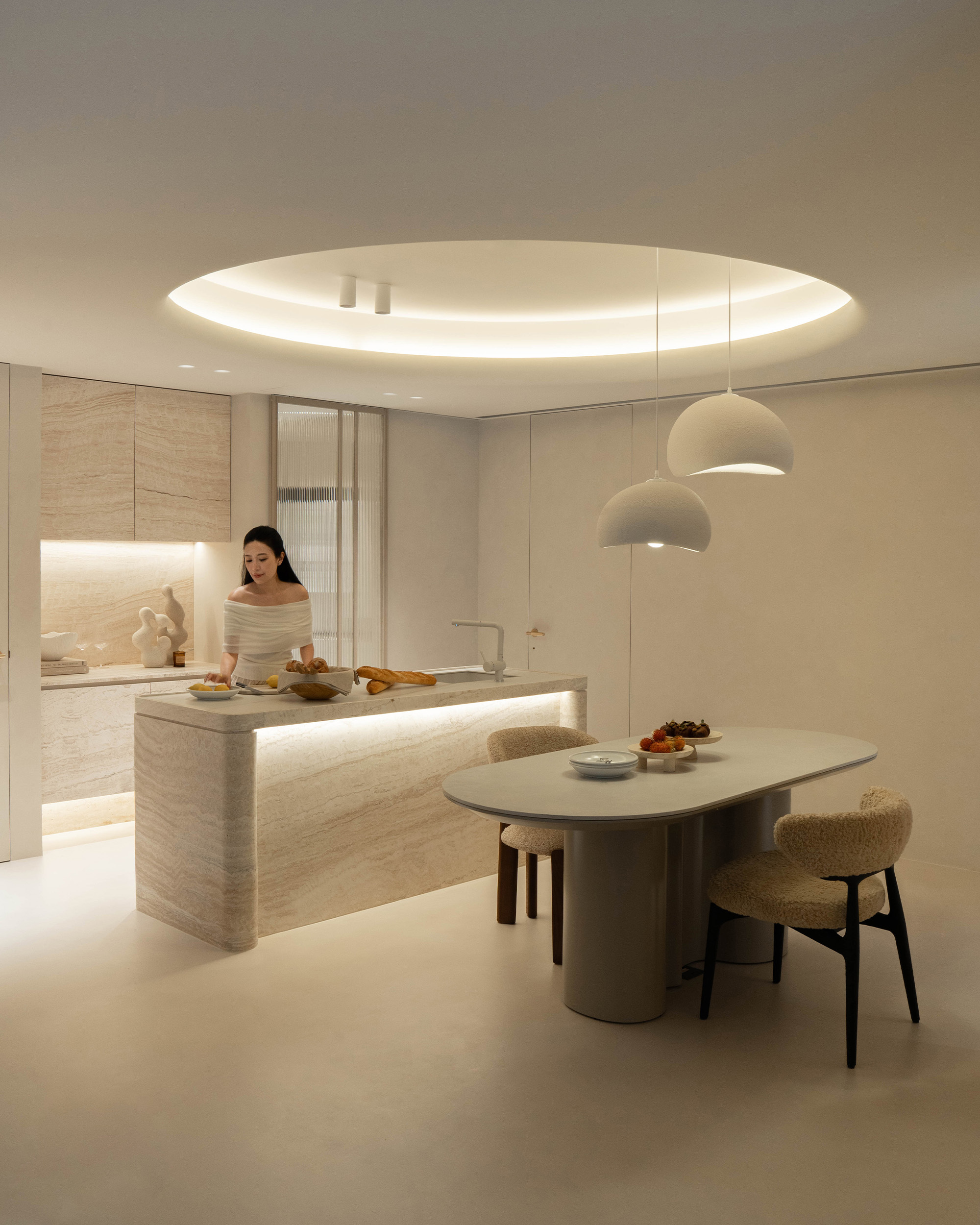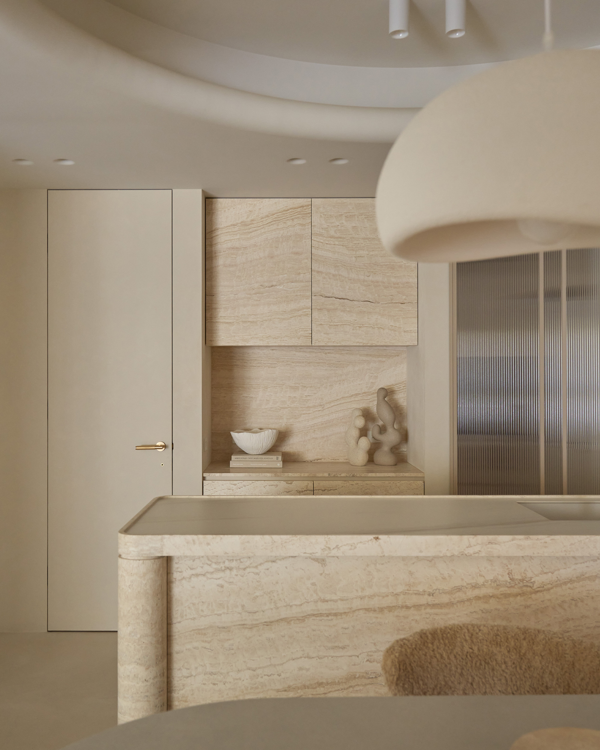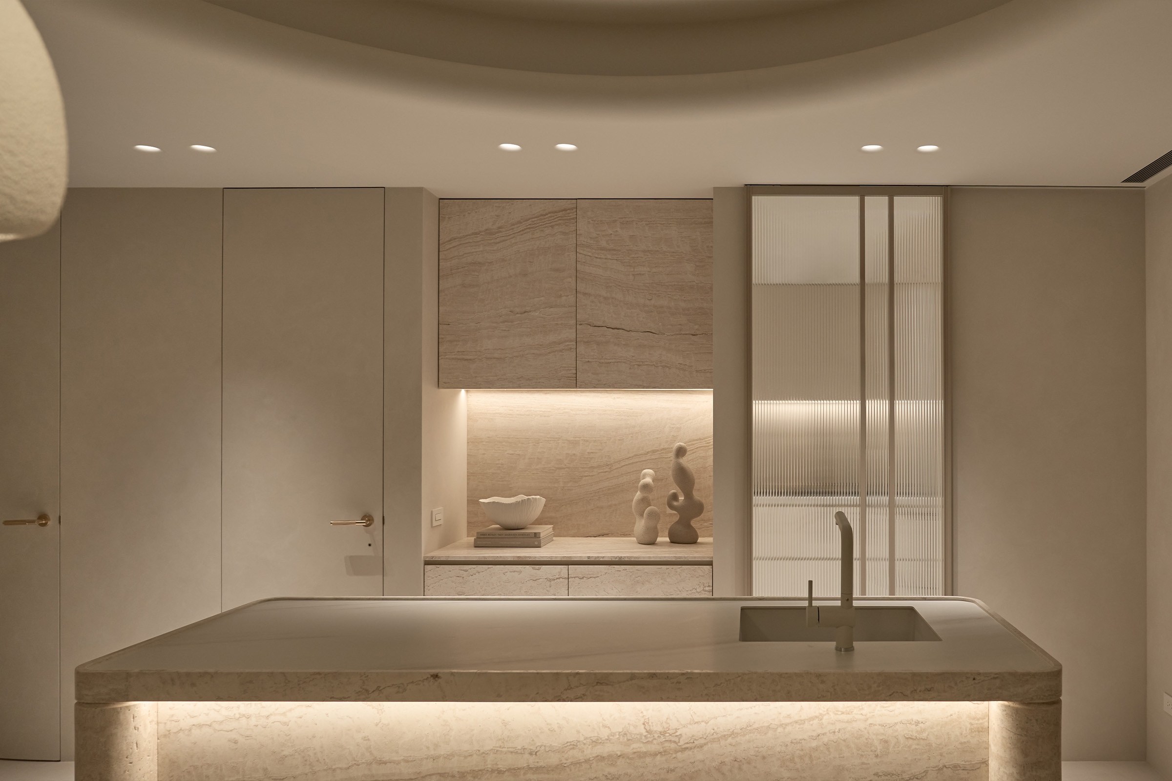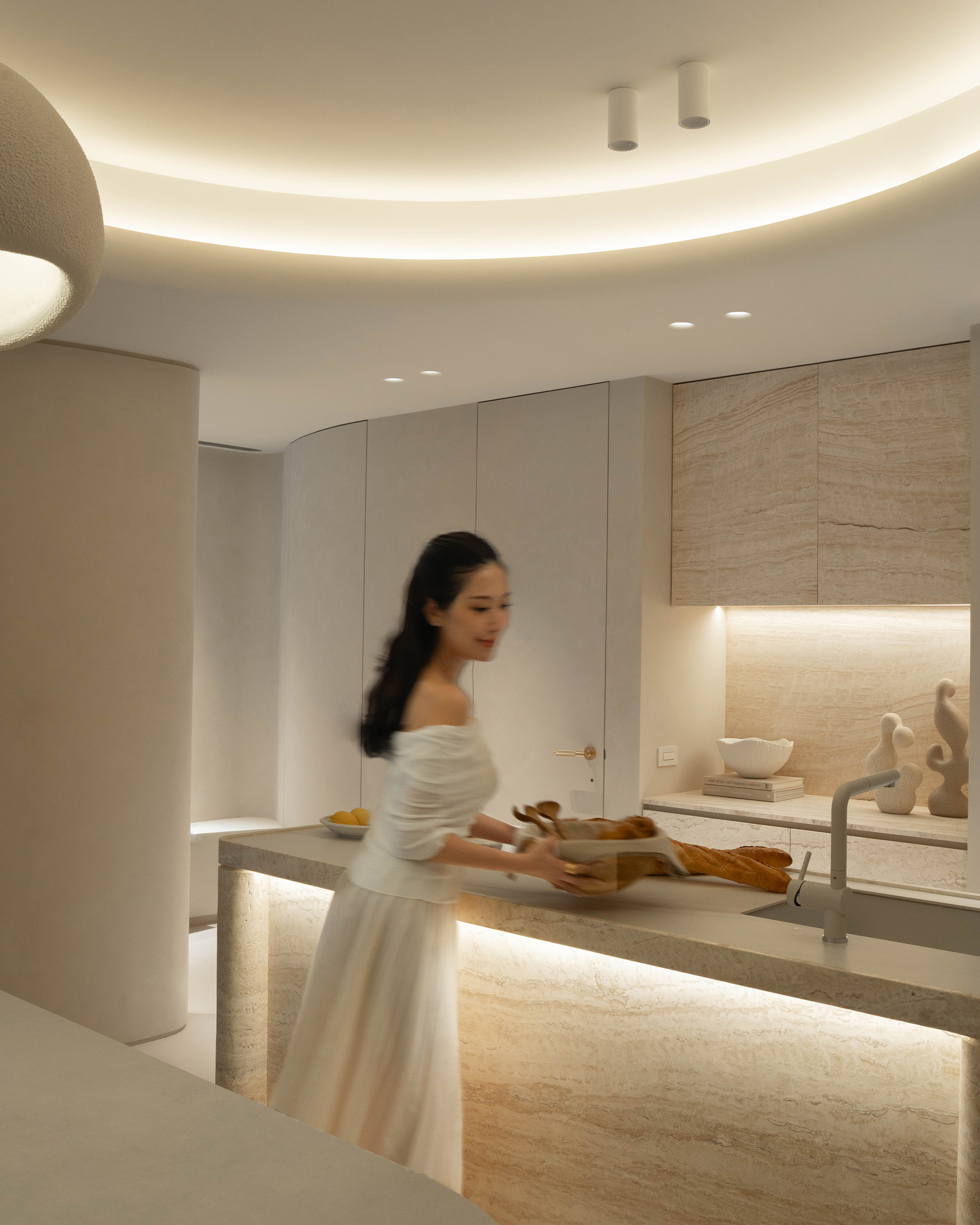 中島以洞石延續整體材質語彙, 圓柱造型的收邊在四角落悄然現身, 與天花弧形燈帶相互呼應, 線條與光影一同構築出柔和的節奏。