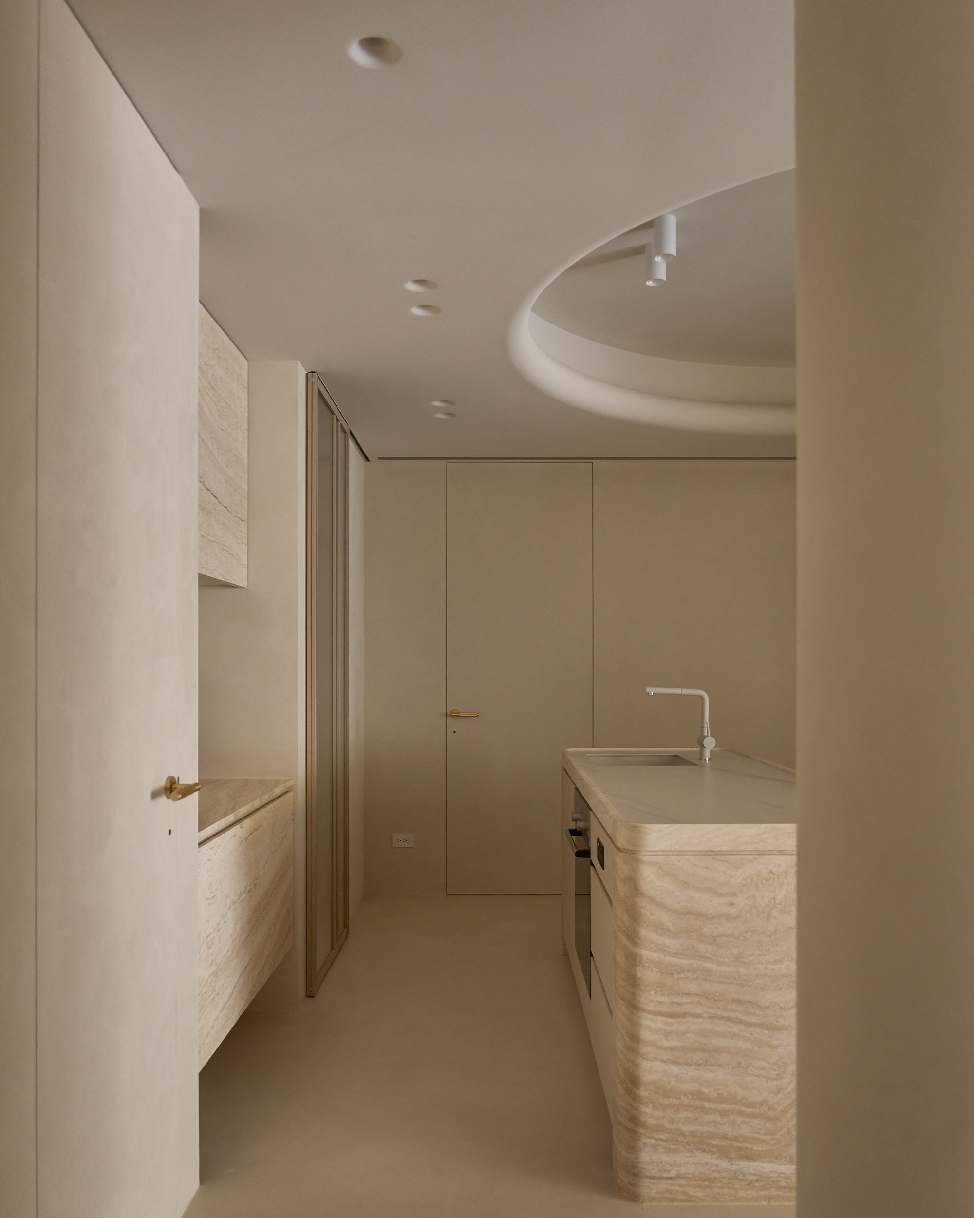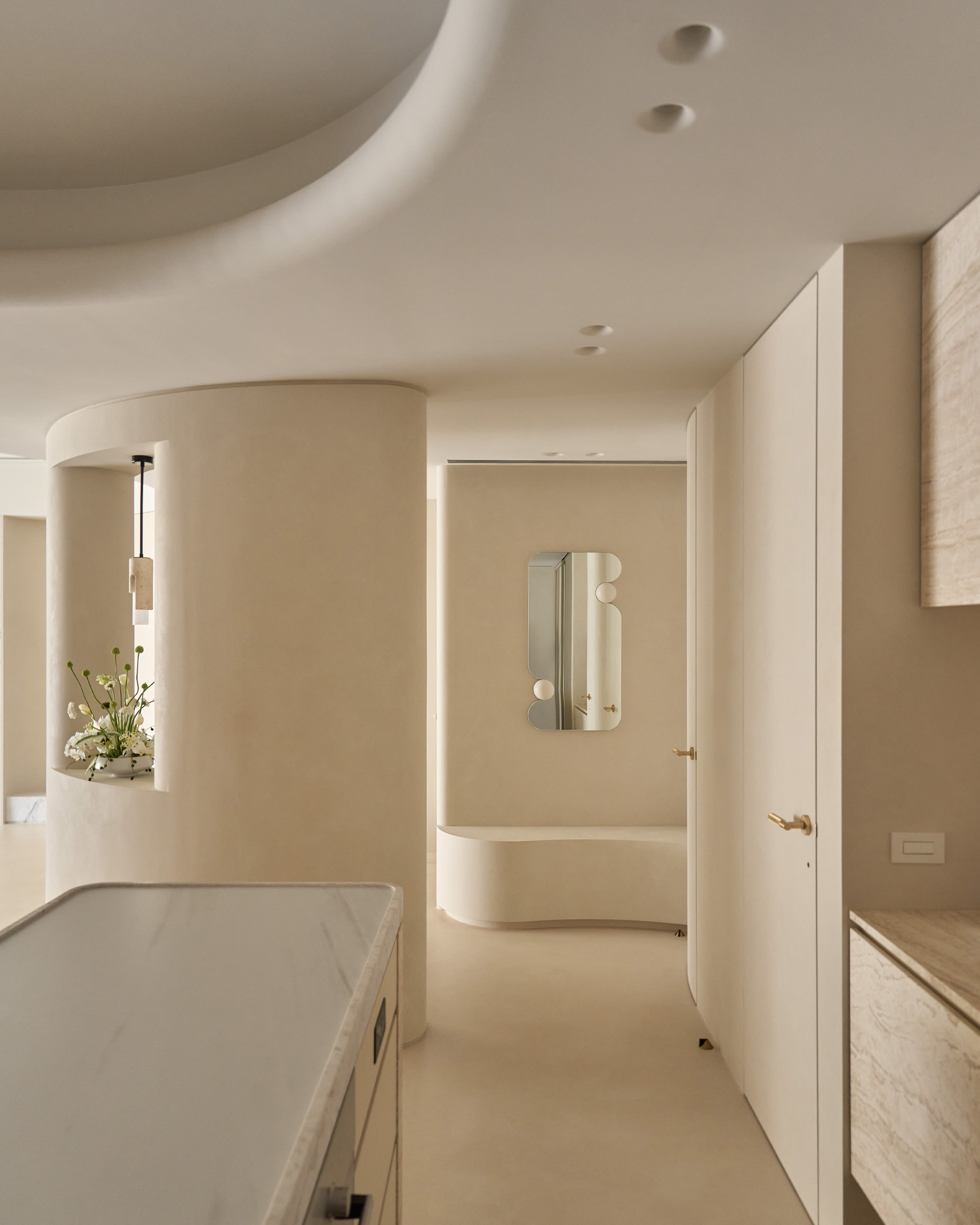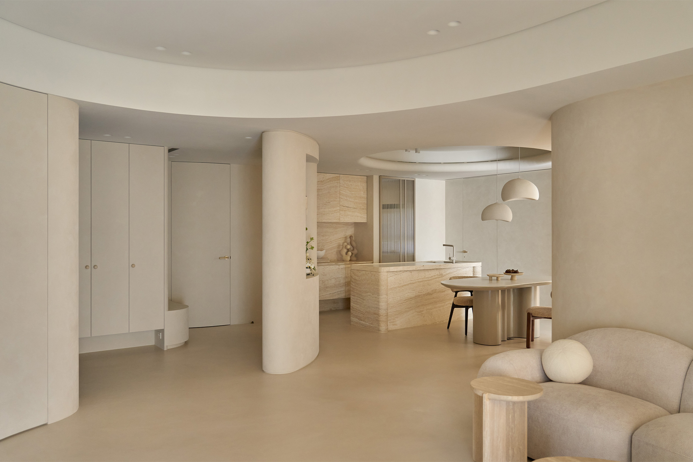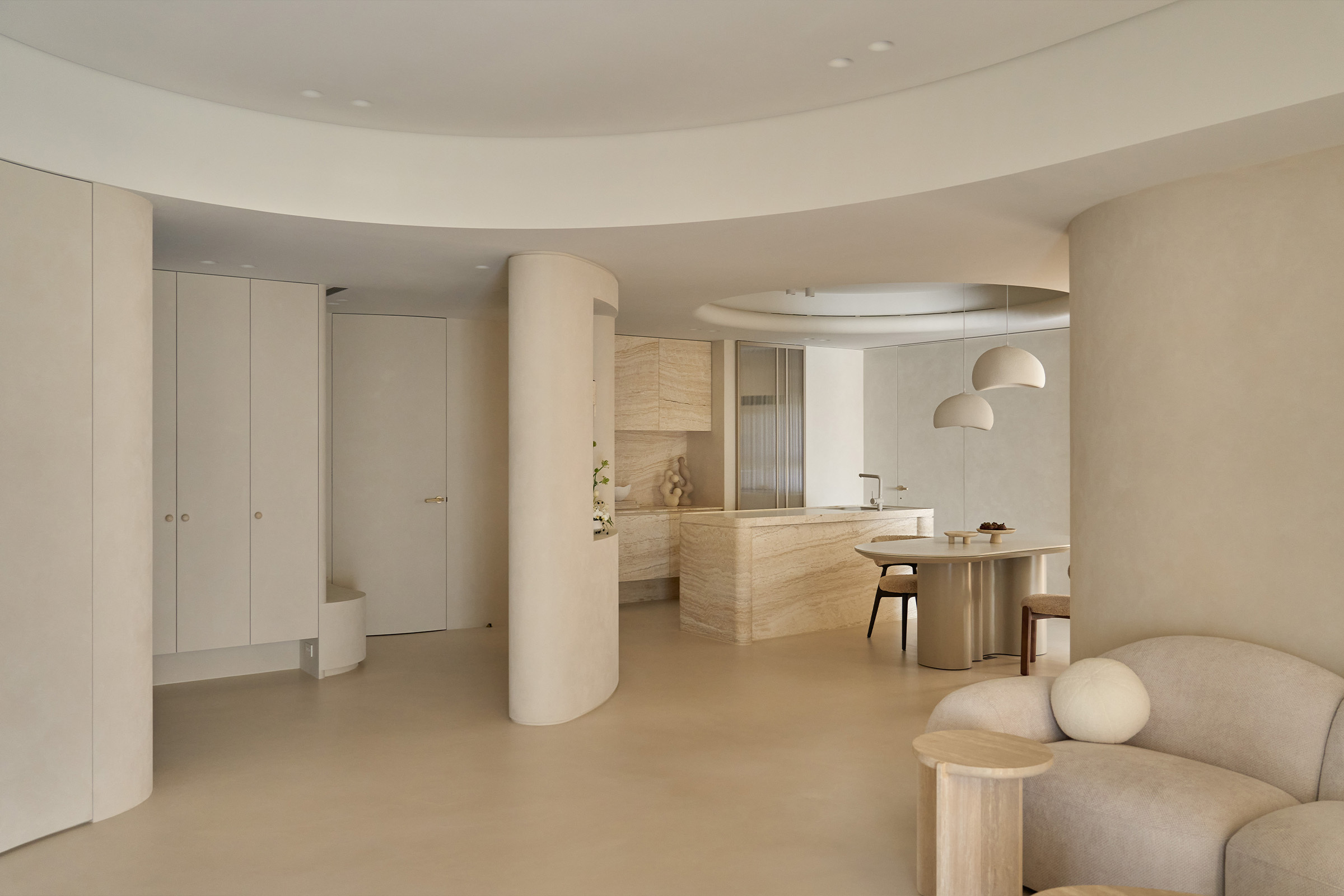 中島以洞石延續整體材質語彙, 圓柱造型的收邊在四角落悄然現身, 與天花弧形燈帶相互呼應, 線條與光影一同構築出柔和的節奏。