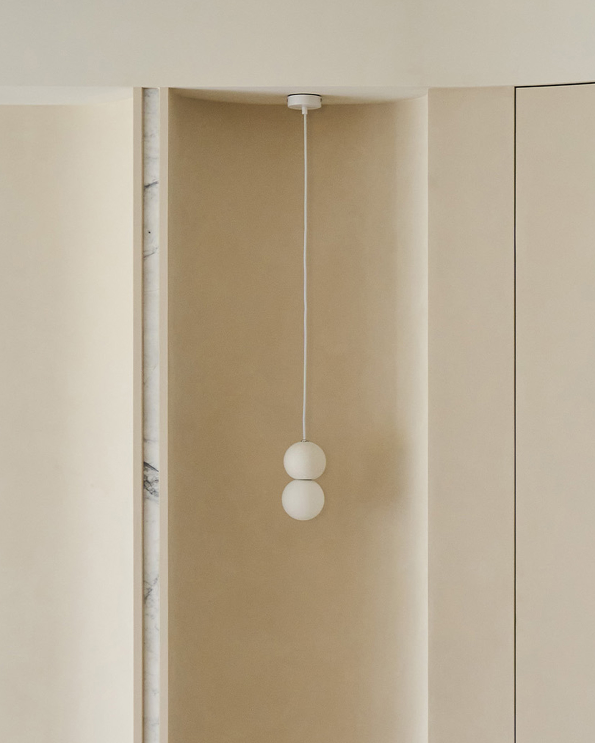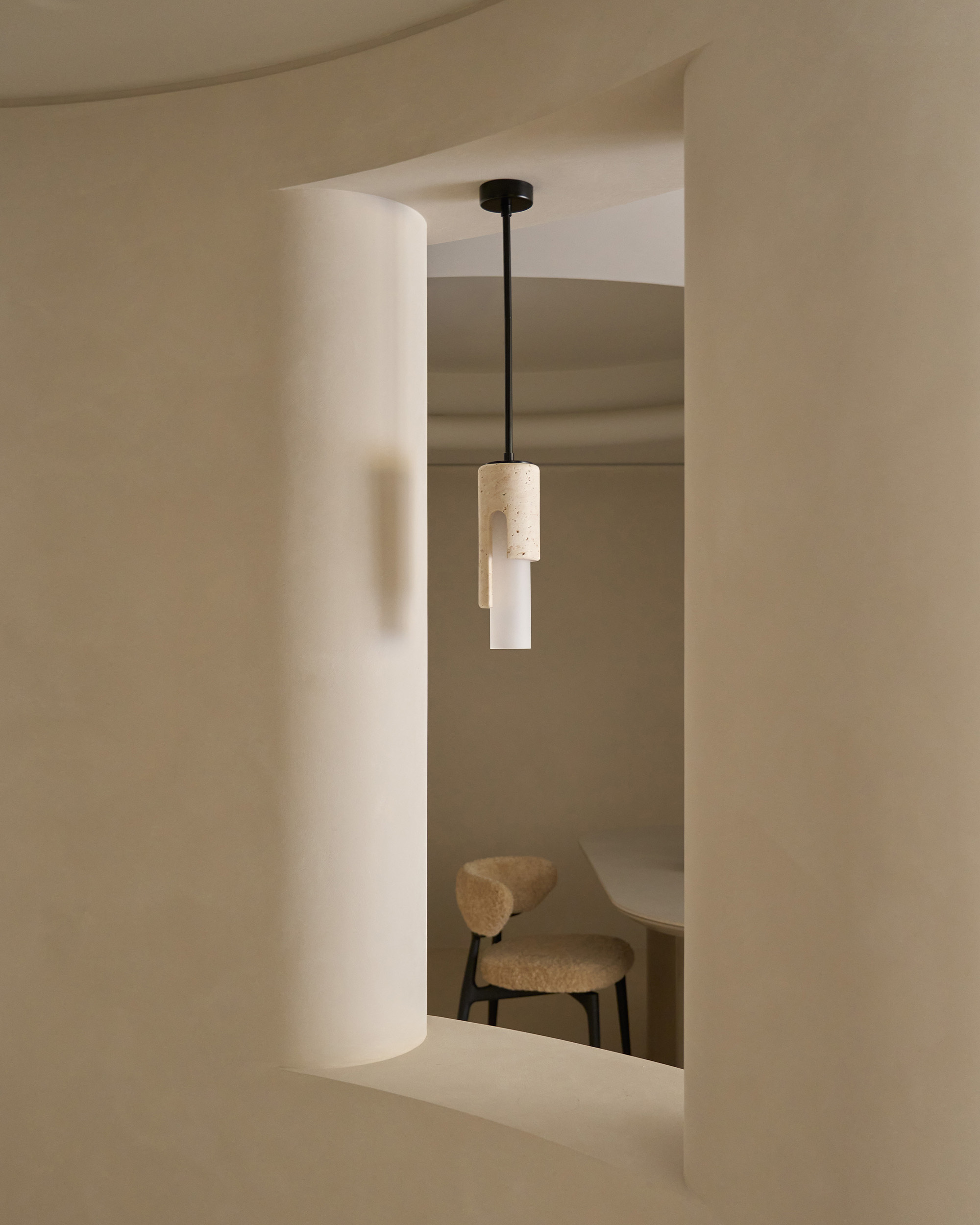 洞石吊燈像是浮在半空中的溫柔星光,與圓弧櫃體、穿鞋椅一起構成柔和的節奏。