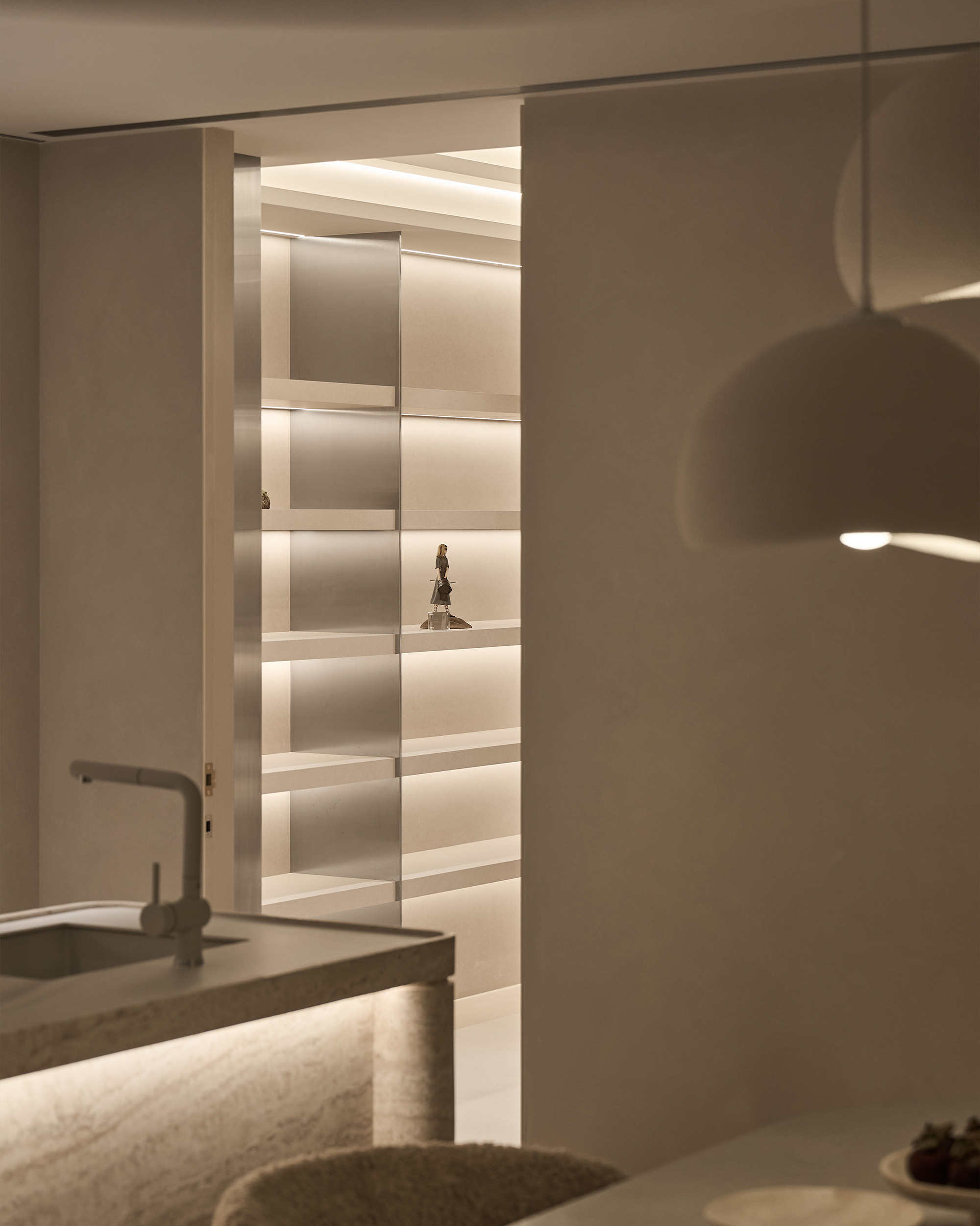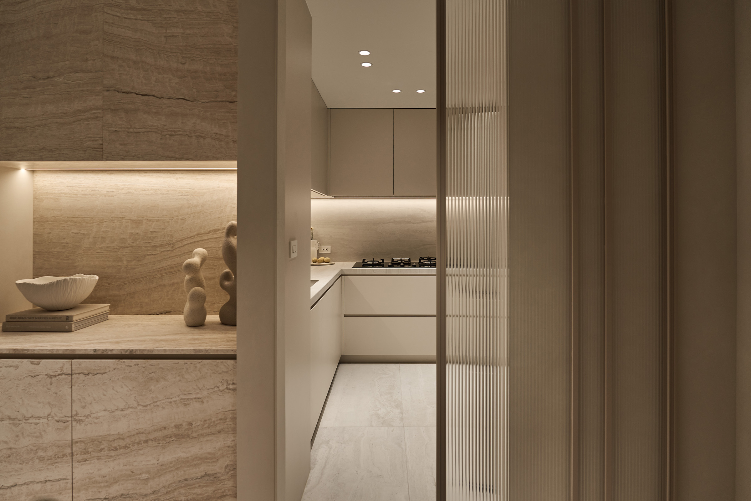 櫃體門板以洞石飾面延伸整體感, 讓空間的視覺溫潤沉靜。