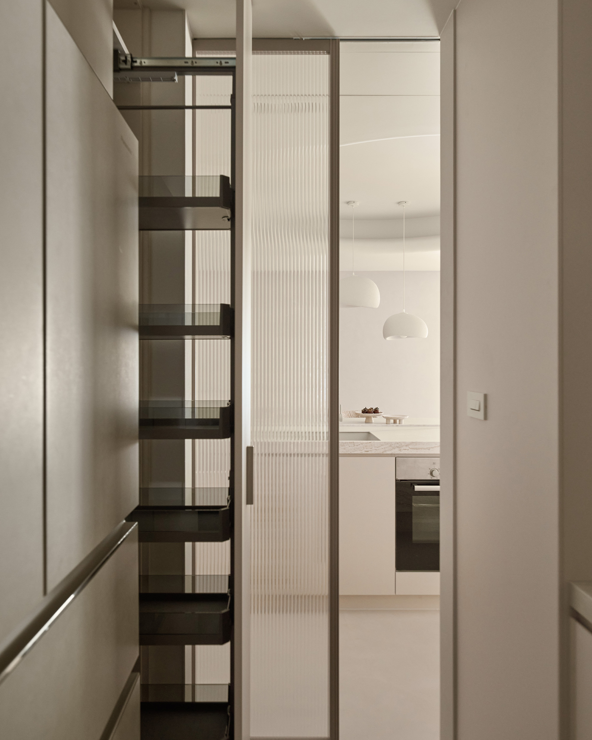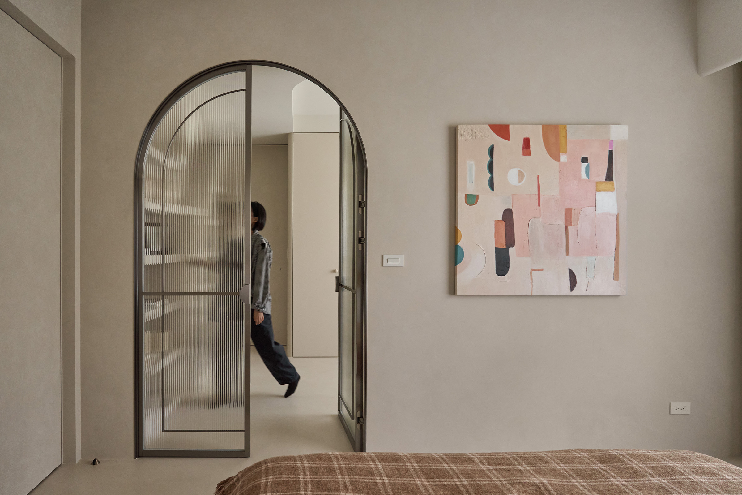 連接主臥的更衣室,以雙開拱門作為視覺起點,鍍鈦金屬框搭配長虹玻璃,在光線穿透與隱私保護之間取得剛好的平衡。