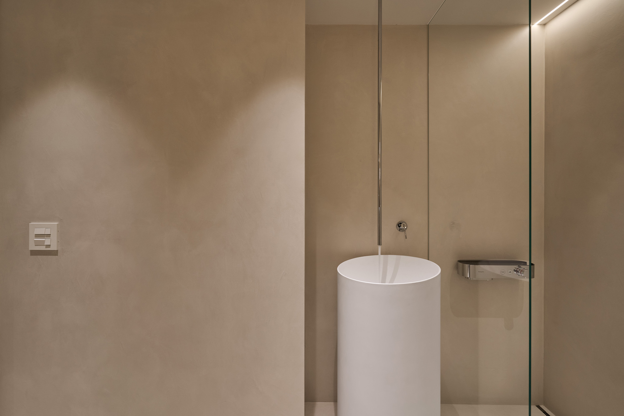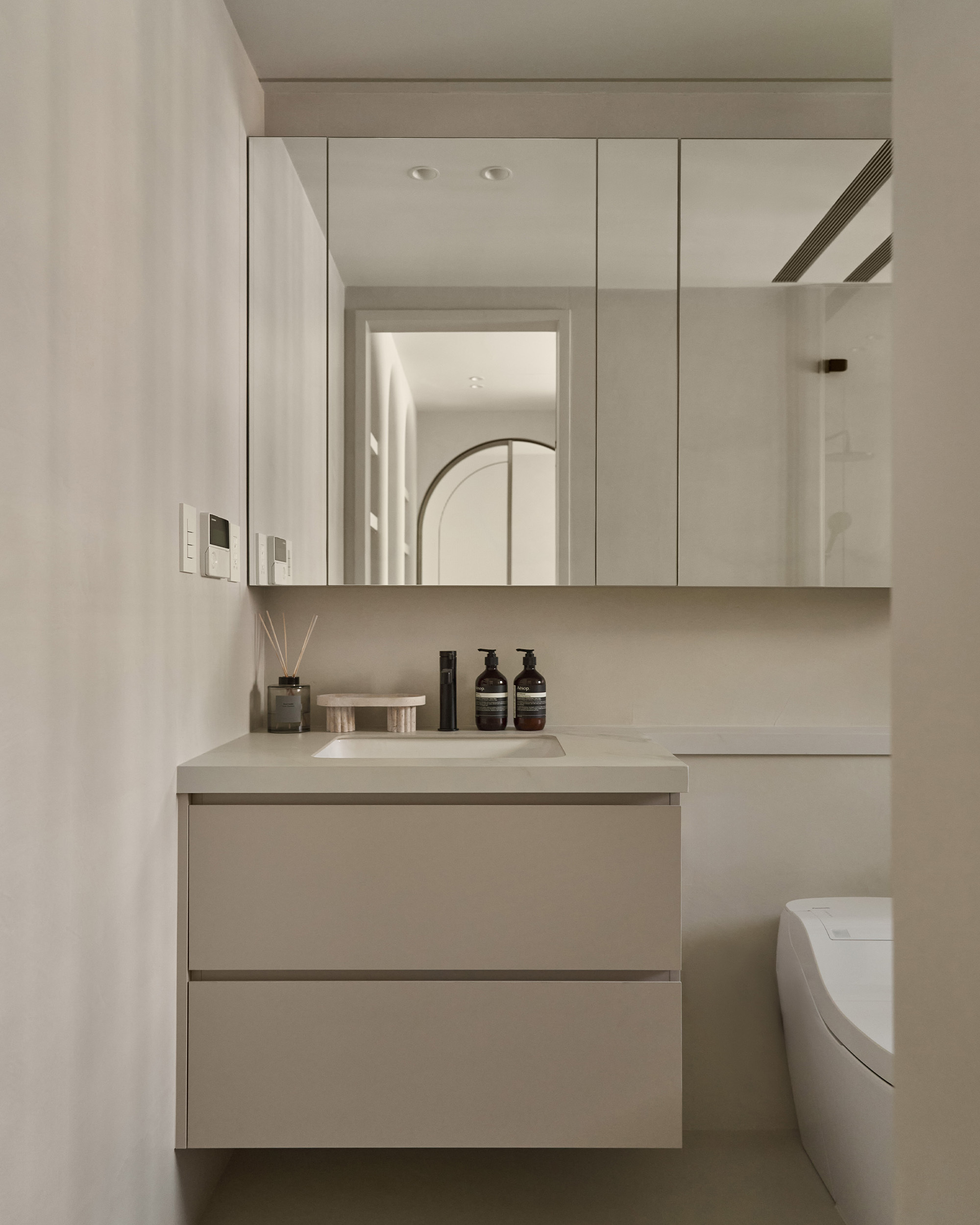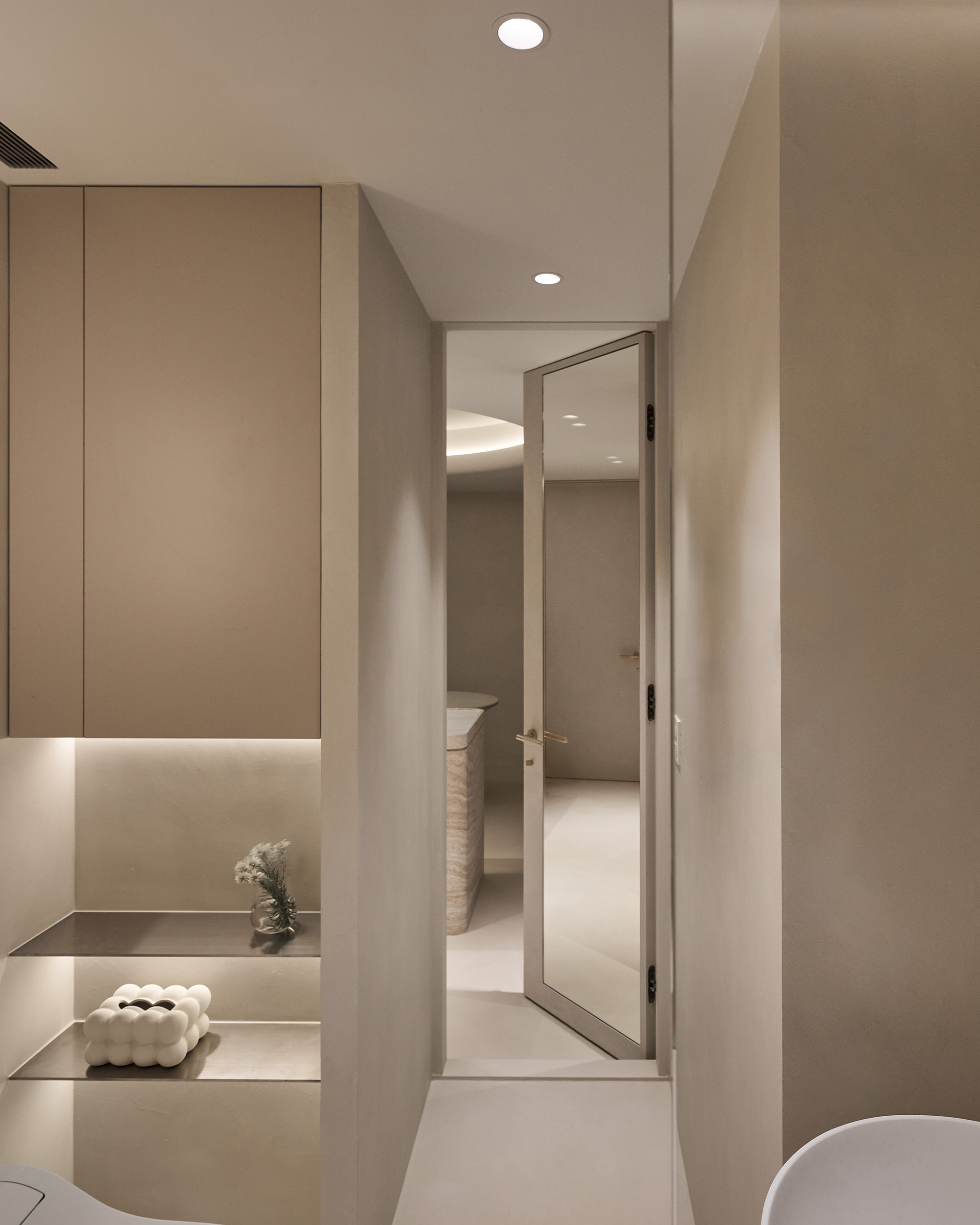 特殊塗料延伸進濕區,以細膩的工法與精準的洩水坡度, 讓牆面在實用與美感之間取得平衡。利用門後空間設置的全身鏡,不僅放大了空間感, 更便利日常,留下一個從容的瞬間。