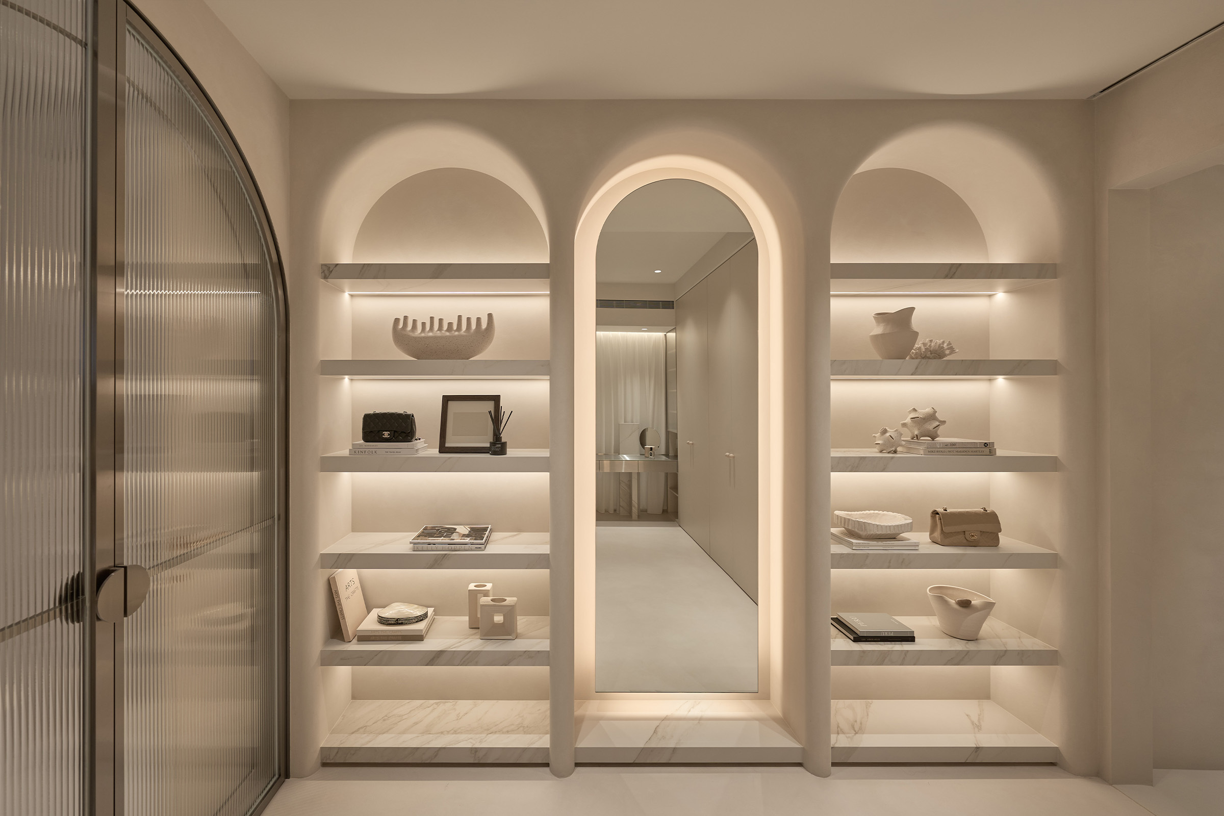 開放式包包櫃與穿衣鏡以圓弧造型呈現,呼應主臥與外部動線的柔和弧線,讓整體空間的節奏延續。
