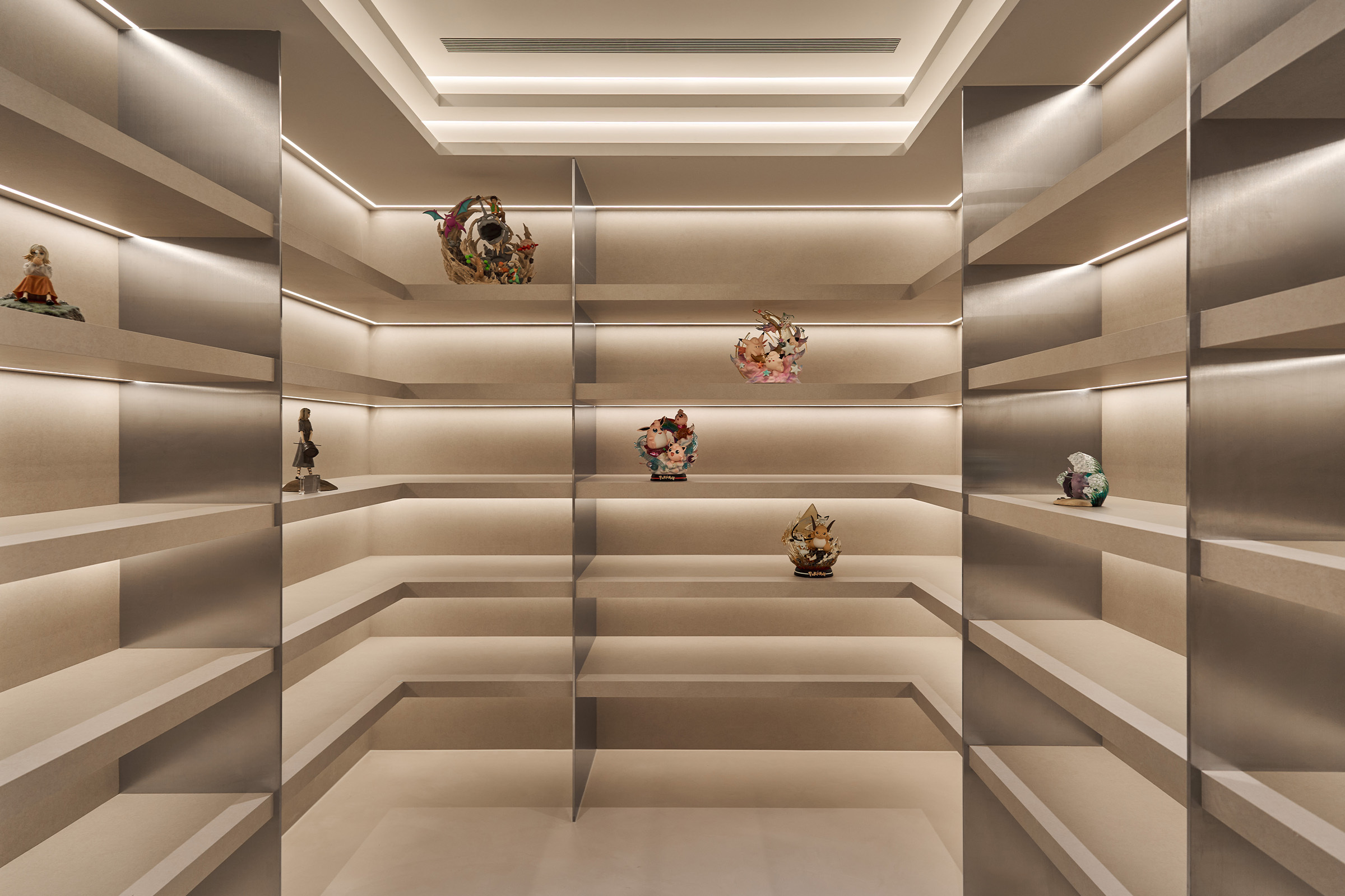 在這座家中,男女主人擁有各自的夢想空間,男主人將對收藏的熱愛安放在公仔展示室裡,以不鏽鋼與木質層架堆疊,構築出理性與熱情共存的小宇宙。