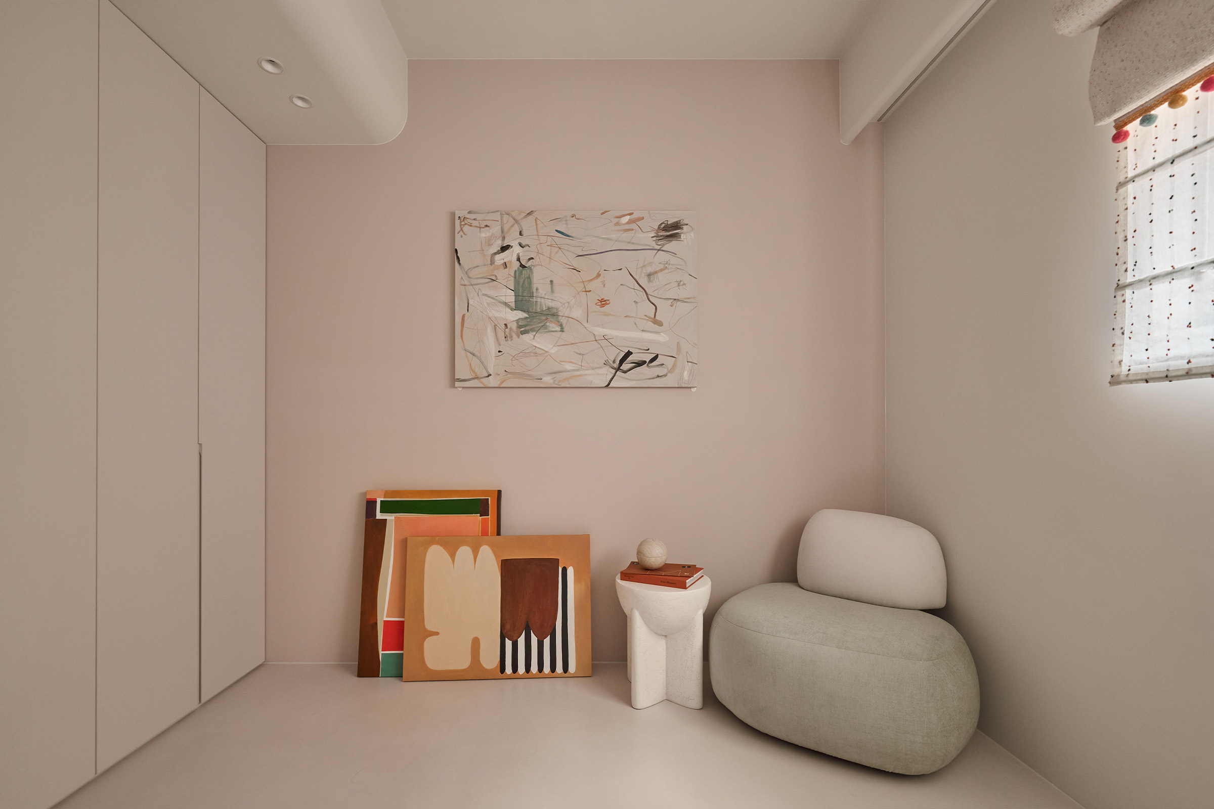 粉色的牆面,柔軟而溫暖, 像晨光一樣輕輕落在房裡。