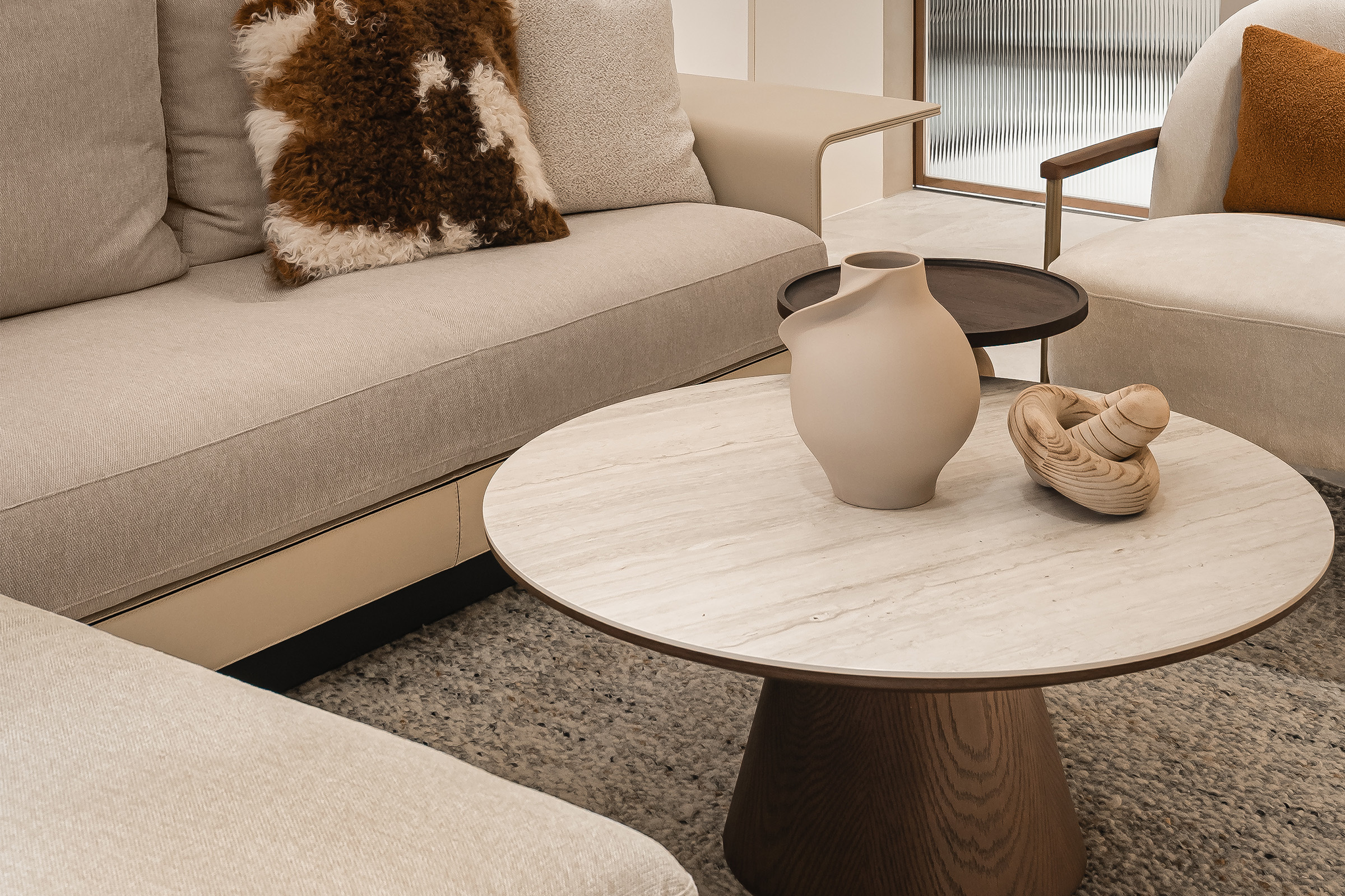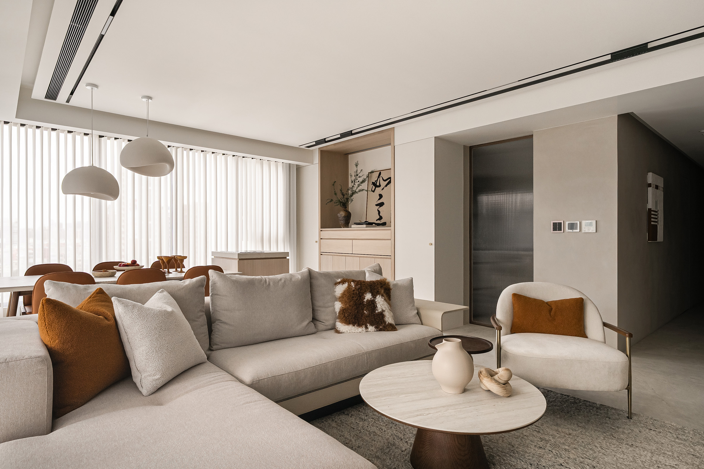 家具配置以 L 型大沙發為核心,搭配單椅與高低錯落的圓形茶几,在舒適之中保留彈性,讓空間能隨著生活情境自由轉換。