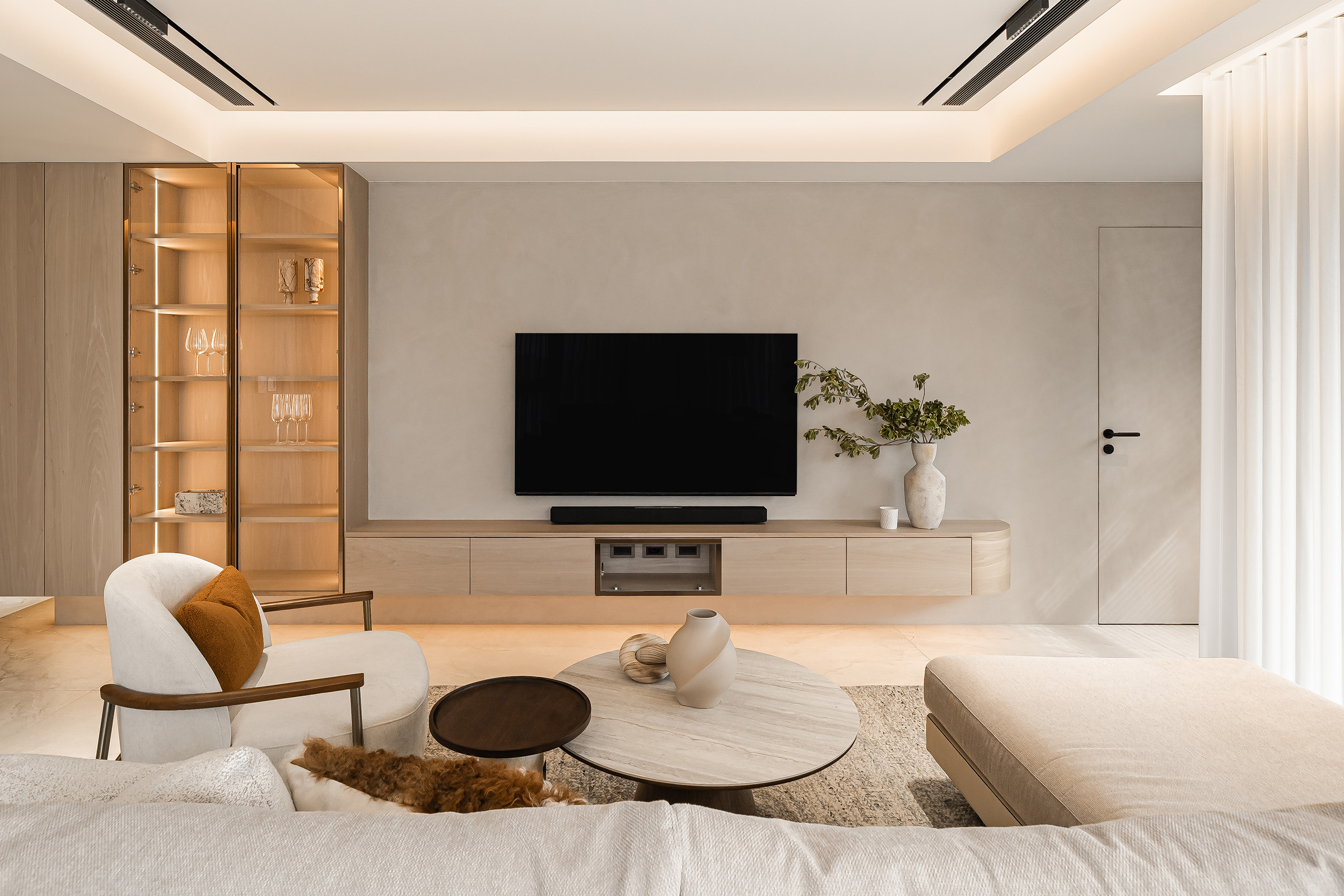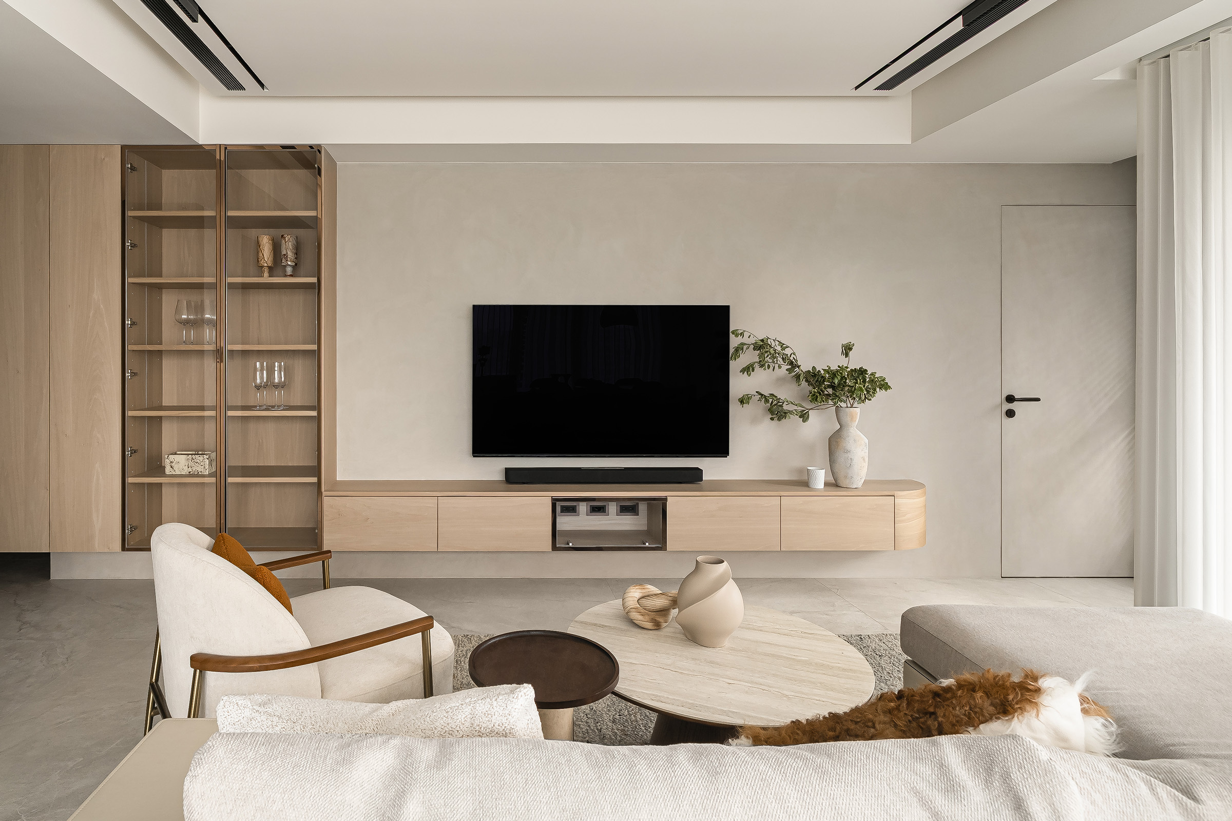 木質調櫃體搭配圓弧線條櫃體,柔化了結構的銳利感,回家的第一刻,空間便以溫和而安定的姿態迎接,讓人不自覺地,把一天的重量輕輕放下。