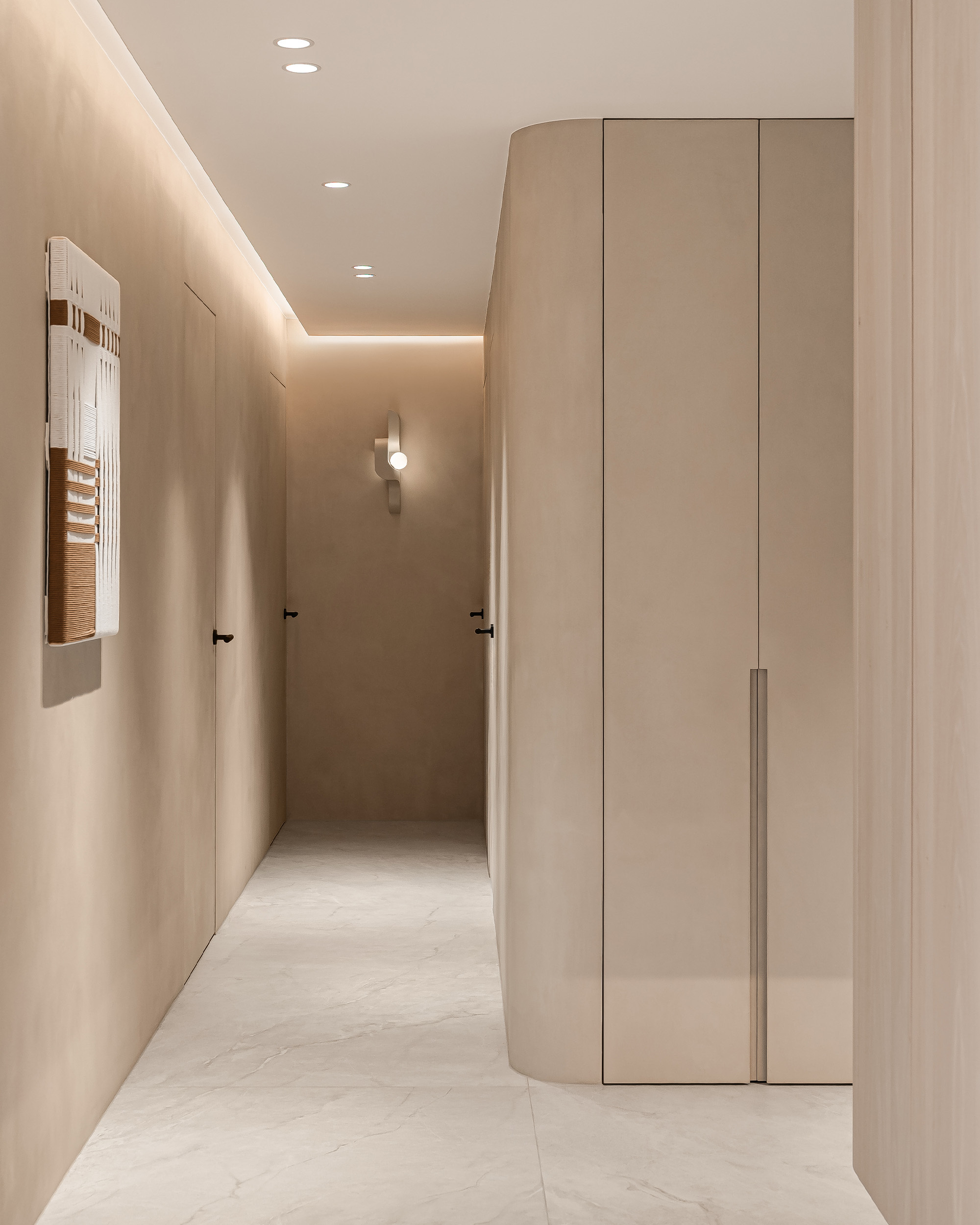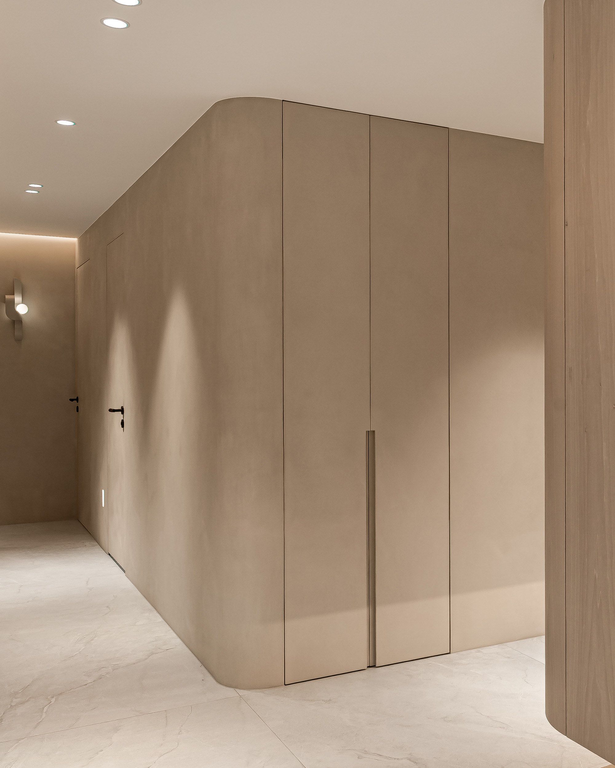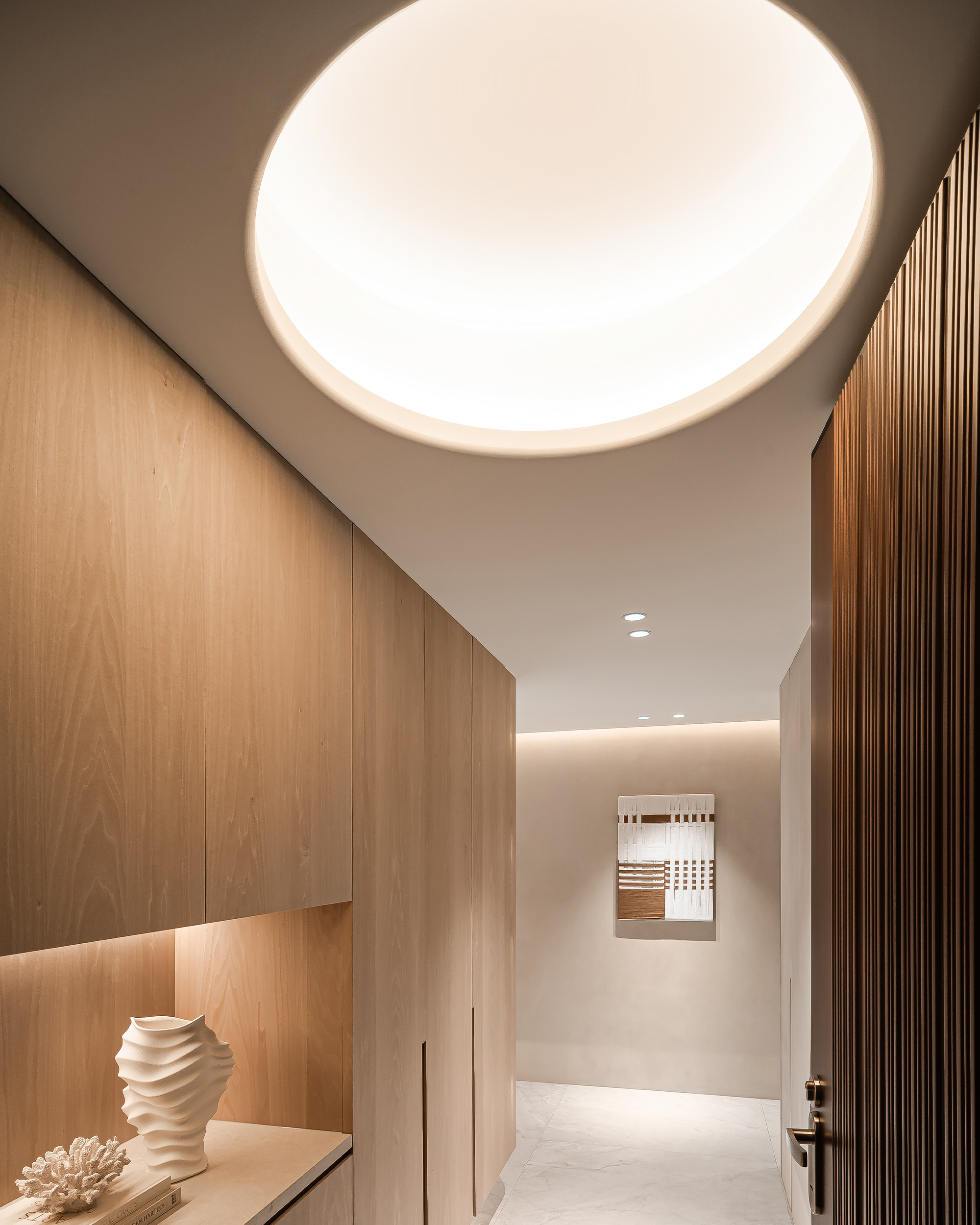 在入口轉角處,以圓弧櫃體取代銳利直角,不僅消弭左右皆為櫃體所帶來的壓迫感,也悄悄為玄關多留下一處實用、卻不張揚的收納空間。