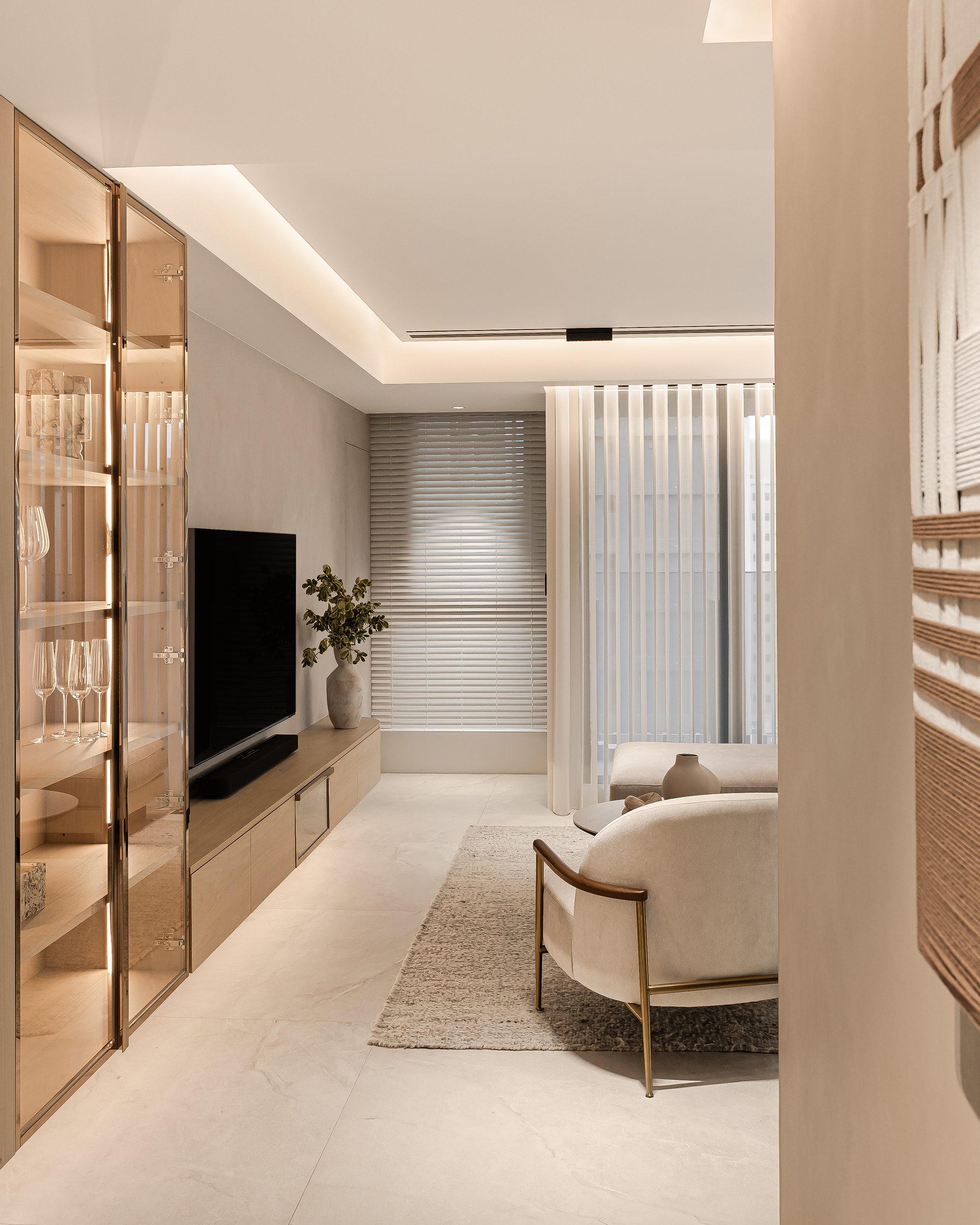 客廳電視牆面選用特殊塗料呈現霧面肌理,搭配鍍鈦細節與玻璃展示櫃,在輕與重之間拉出層次感。