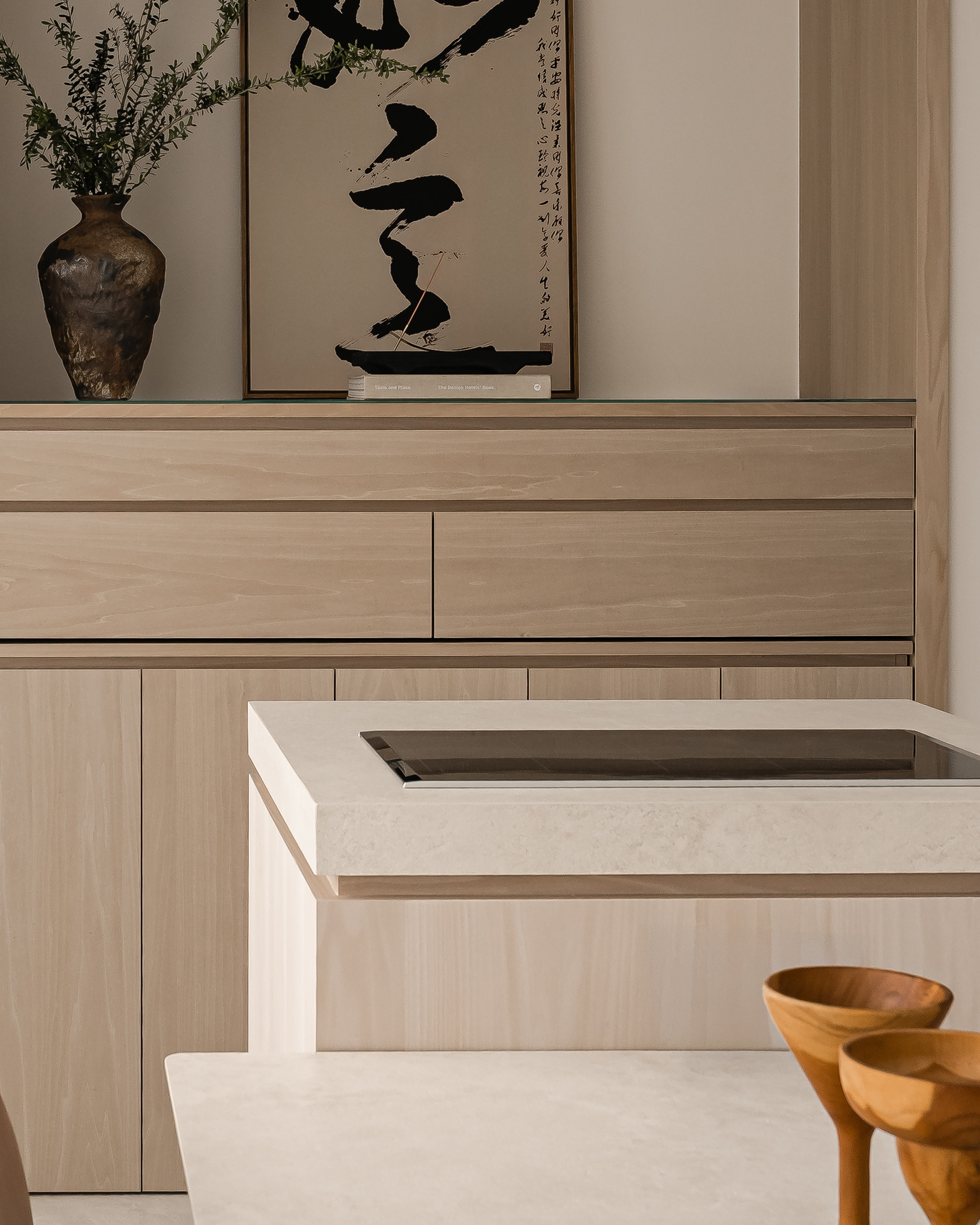 桌邊的島台整合 IH 爐與餐具收納,無論是備餐、輕食料理,或泡一壺茶,都能讓家人在動線之中自然交流。