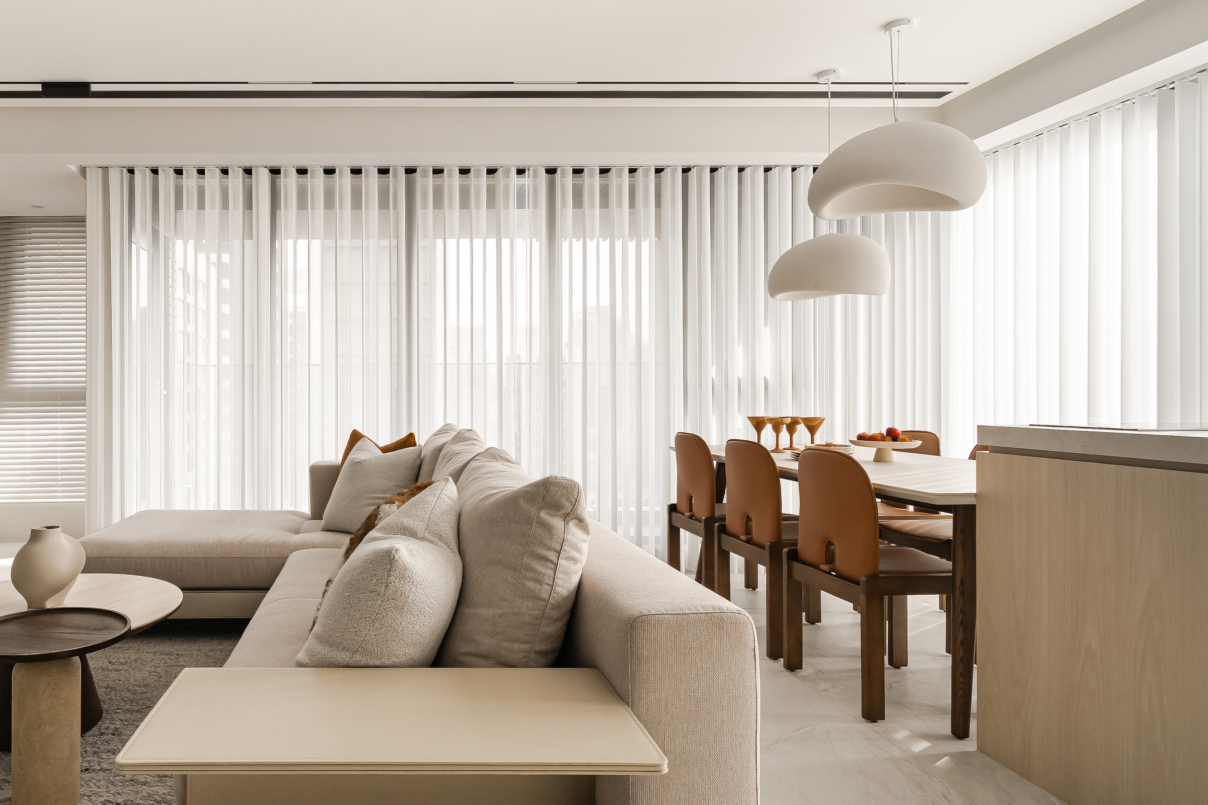 陽光順著落地窗灑入,直立式柔紗簾輕輕濾去銳利,光影在牆面、材質與人之間緩緩流動,
