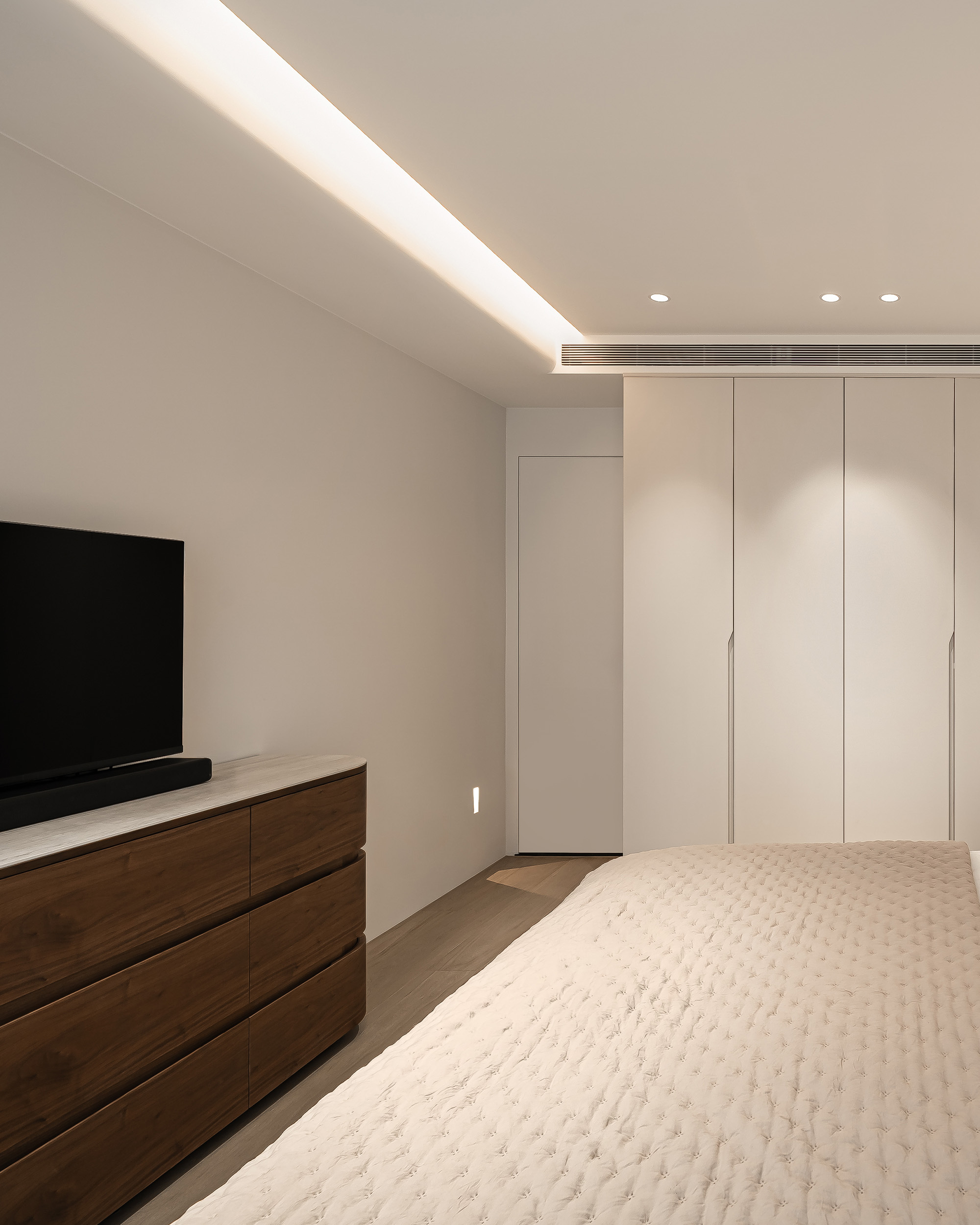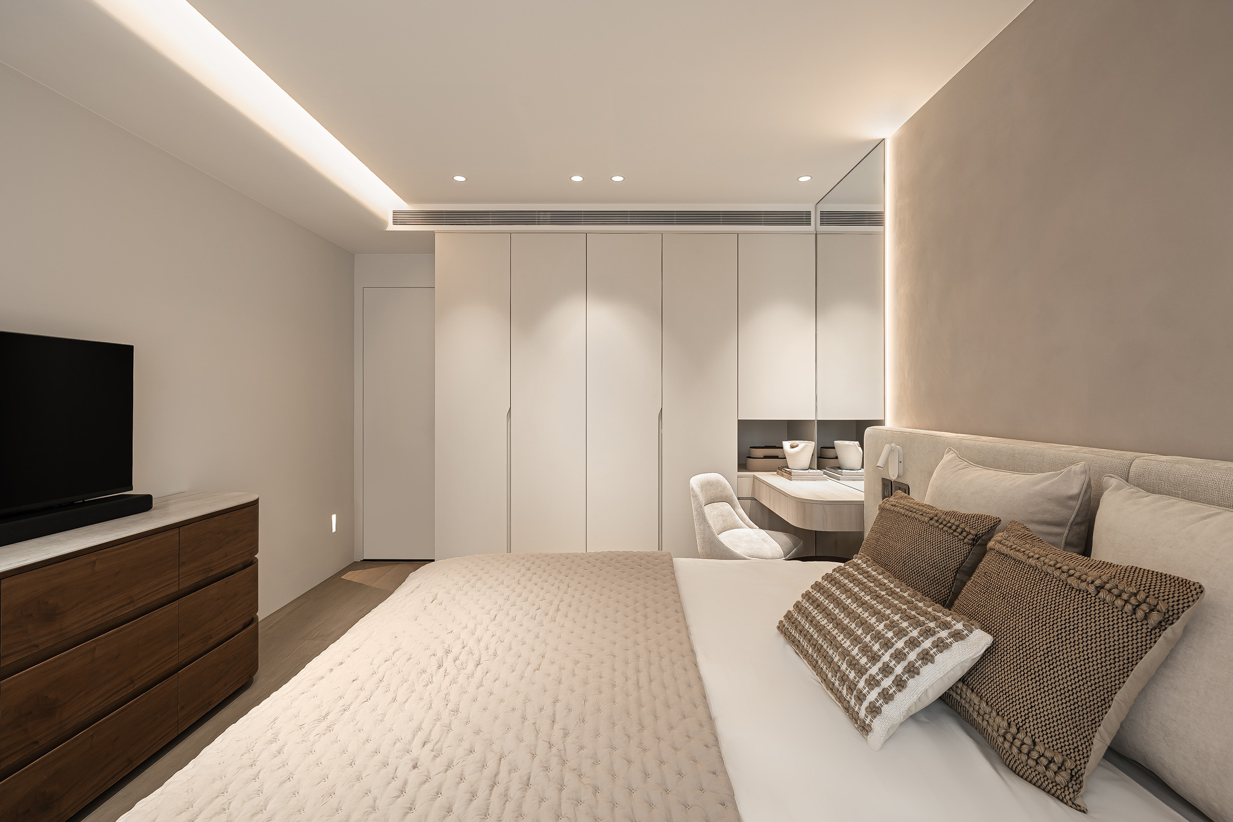收納設計同樣維持低調,衣櫃與櫃體以減少多餘線條,讓牆面回歸乾淨的背景角色。