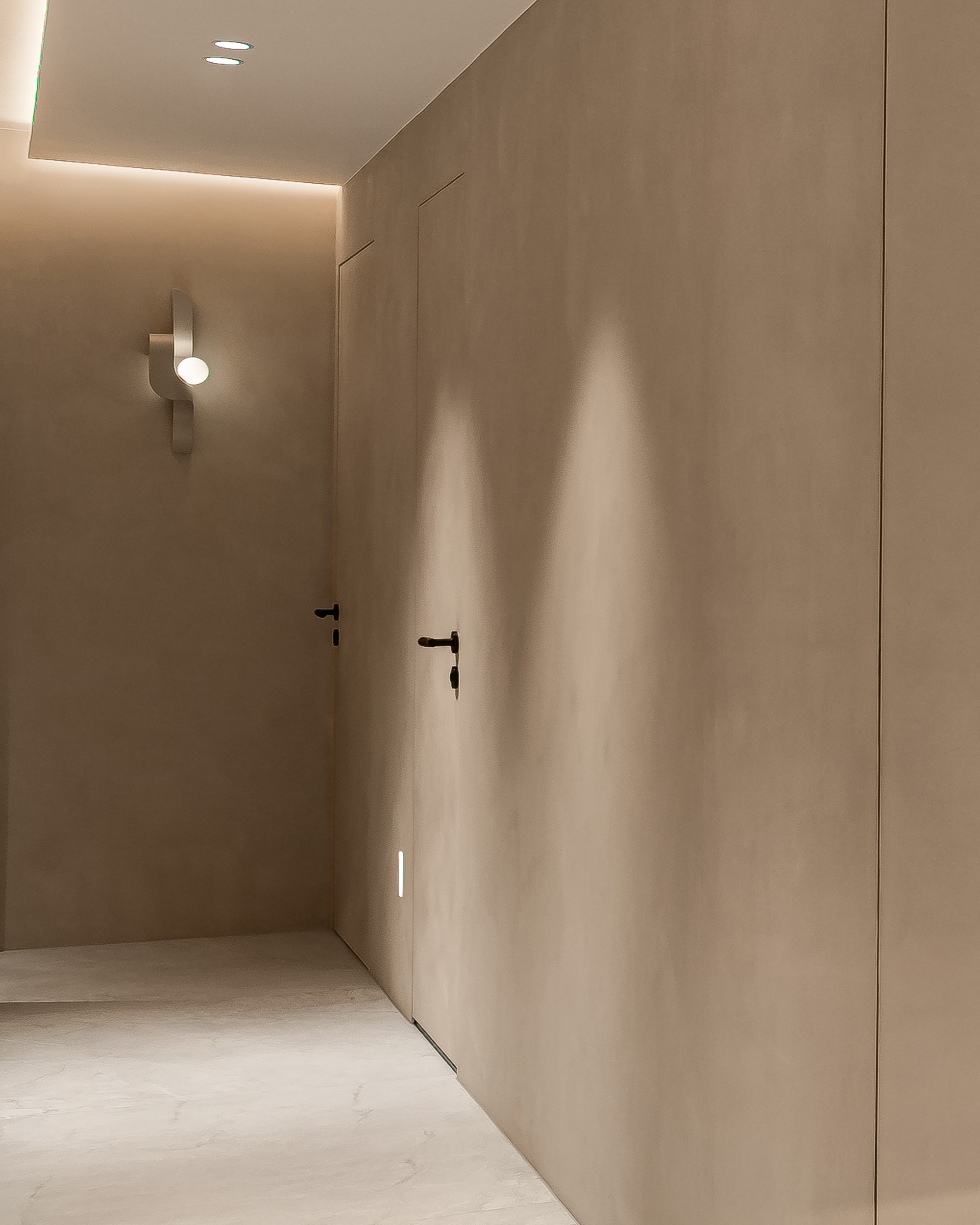 廊道以間接照明與嵌燈組合,夜間柔光引導視線,衛浴外也增設足下燈,減少夜晚行走的不便。