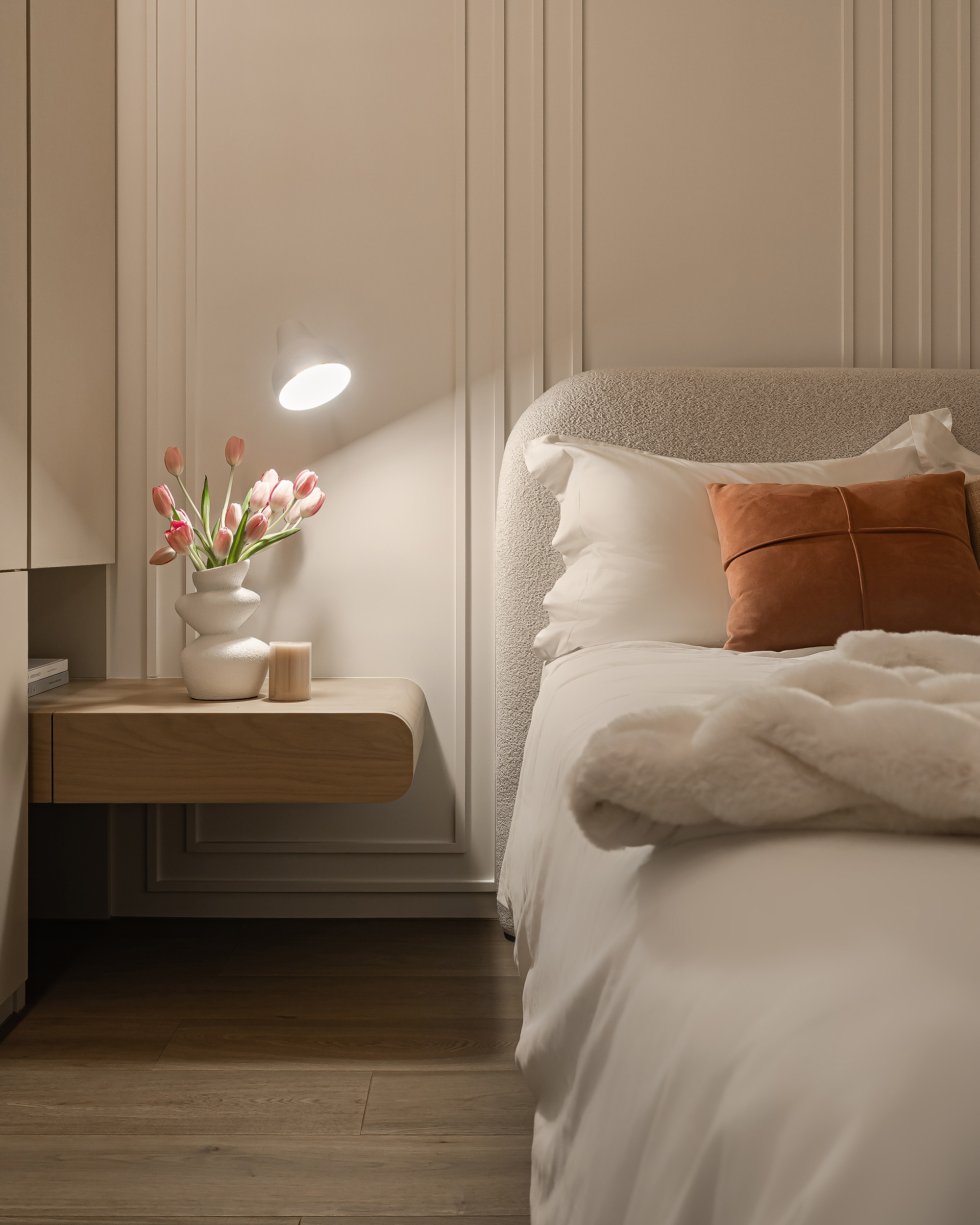 床頭板為訂製造型,整合閱讀燈於其中,不佔空間、操作直覺,無論夜間起身或閱讀時,都能有一盞溫和、不打擾的光陪伴。