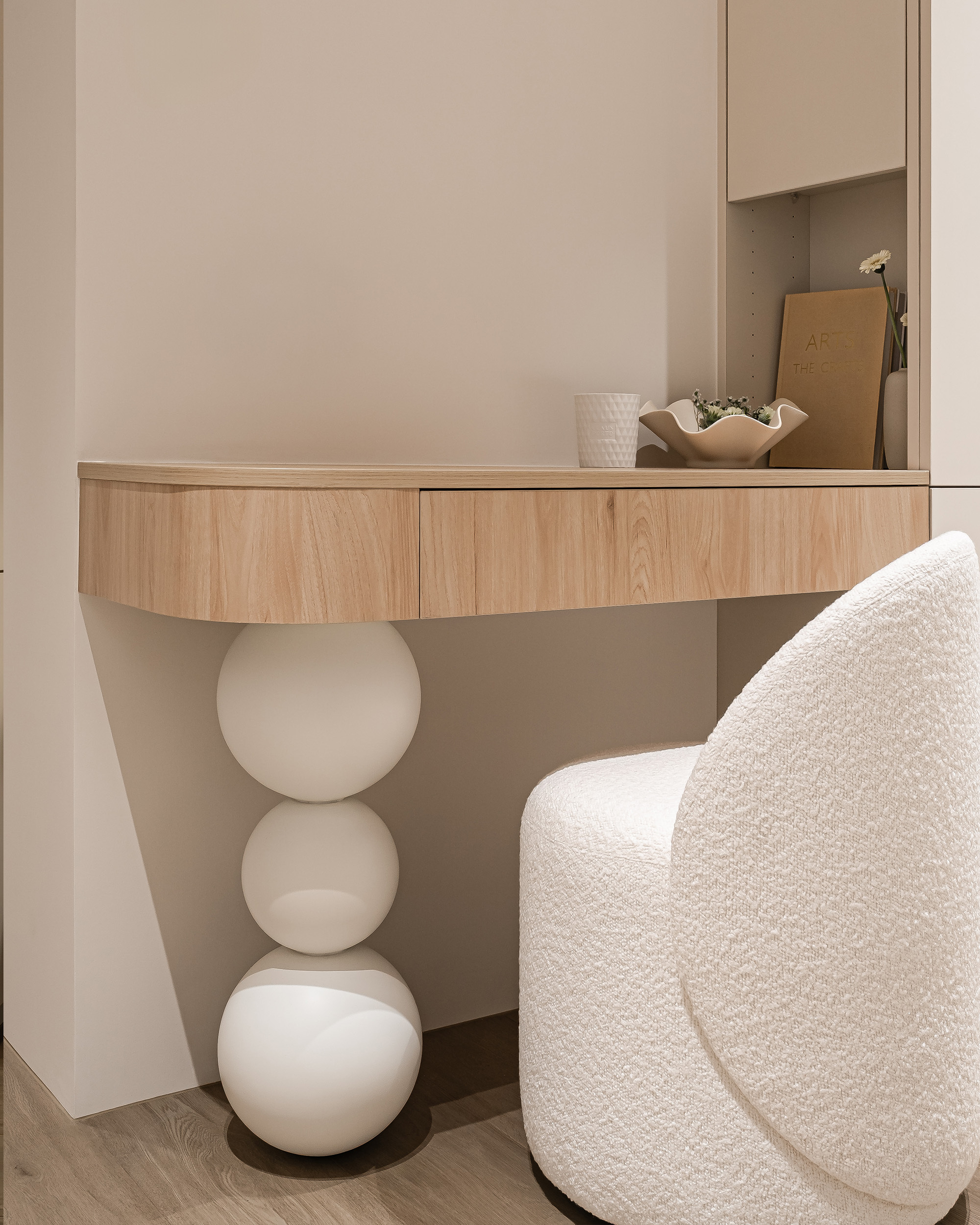 木質地板延續了公領域溫潤的基底,搭配著粉色系軟裝與浪漫羅馬簾如晨光般落下,化妝桌以圓球堆疊造型作為桌腳設計,在簡潔的線條中加入細膩的變化,不刻意張揚,卻自然成為視覺的焦點。圓形元素的運用,讓空間在原有的溫暖之外,多了一份精緻而富有層次的質感。