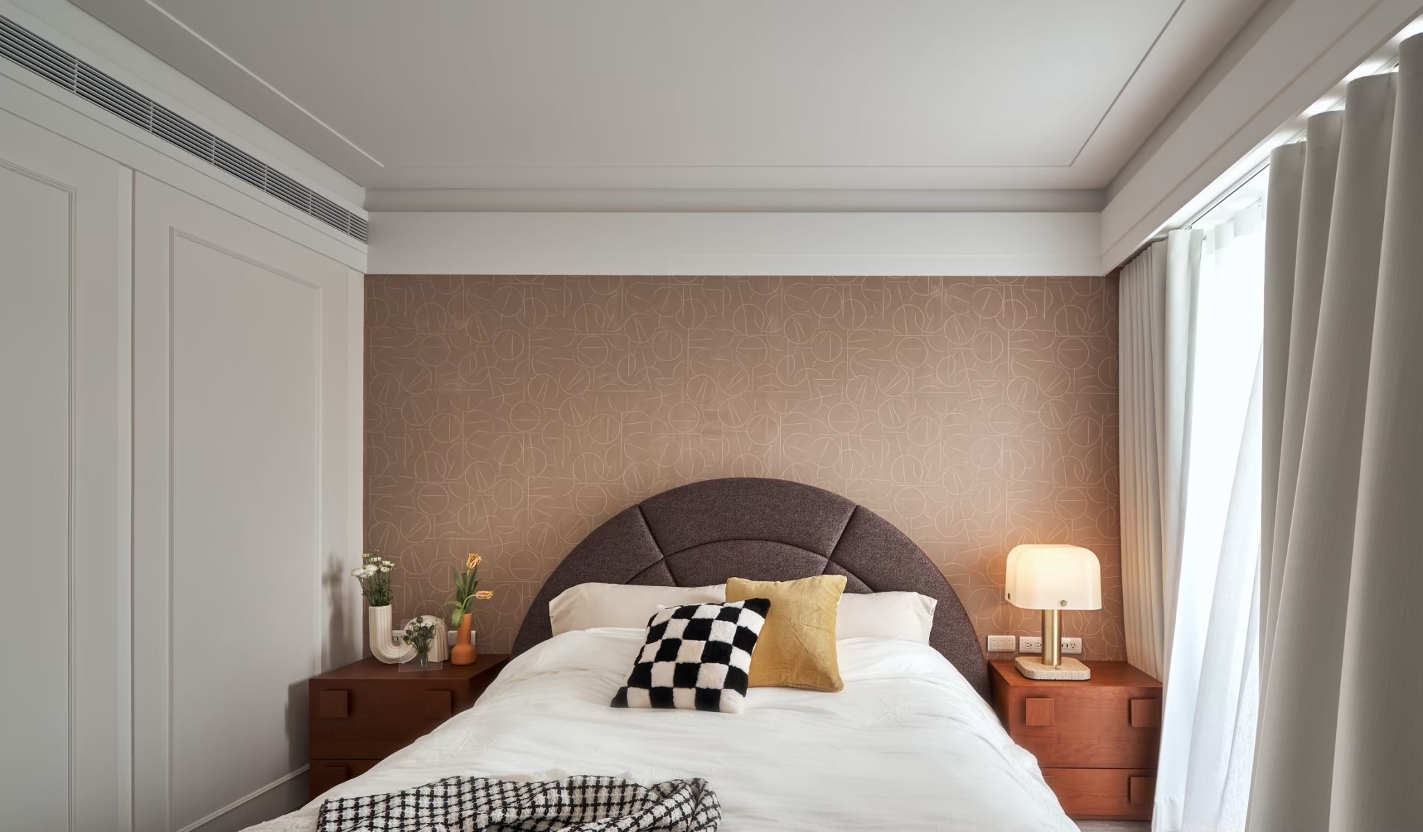 特別訂製的圓弧布藝床板與床架,揉入新潮與復古之美,在暖色系床頭櫃與牆面櫃體白棕配色間,達效果和諧又兼具實用的舒適