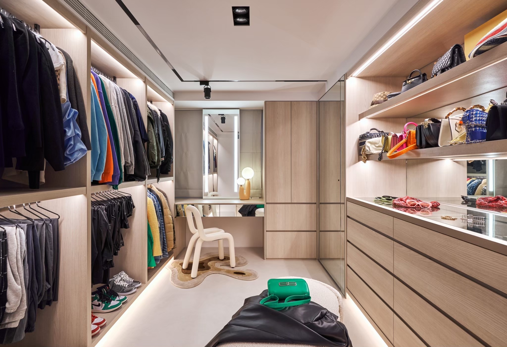 開放式木色更衣室,以多功能儲物規劃,讓衣物、包包和飾品放置地井然有序