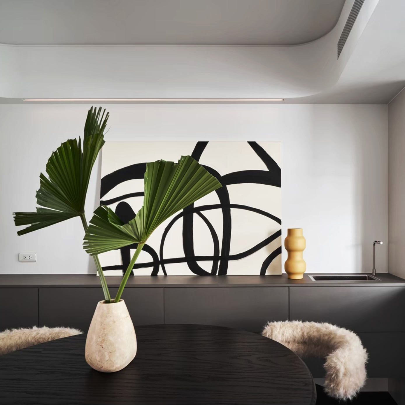 牆面大幅抽象掛畫搭一抹棕梠葉綠意,不同材質形成反差張力,完美融合空間佈置風格中,低調卻又令人難以忽視。