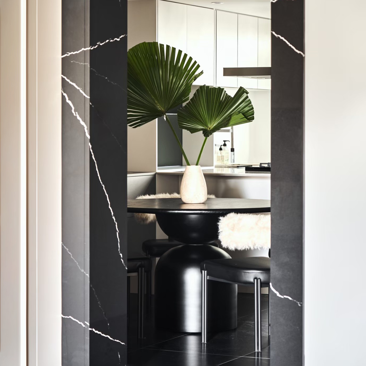穿過黑白門框來到餐廳,同樣延續一貫的黑白調,回應簡約的現代主義輪廓