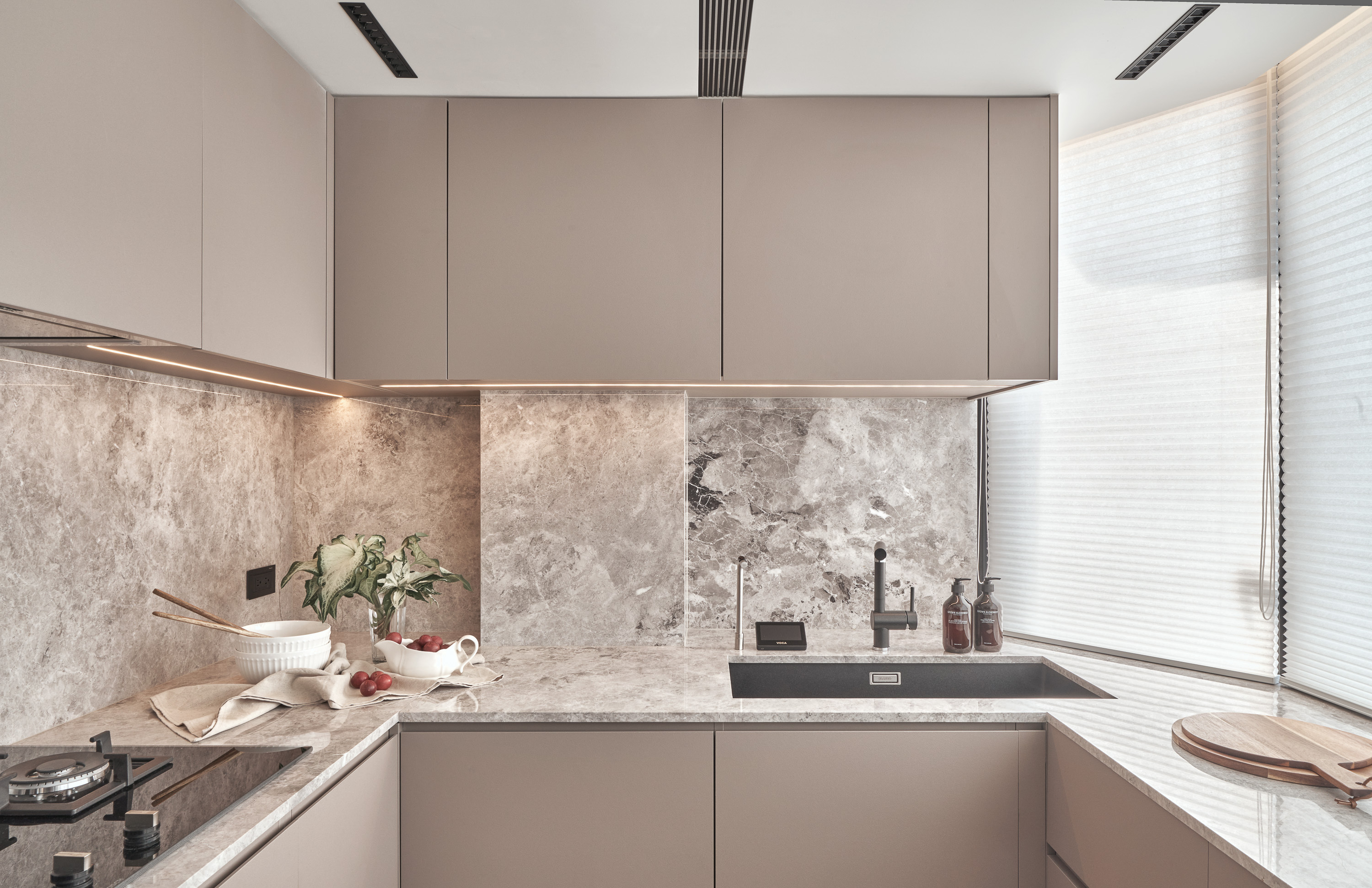同樣選用天然大理石紋鋪貼檯面跟牆面,與暖棕色上下櫥櫃相襯出高雅頂級廚房質感,而隱約中所帶的深淺變化,讓廚房更加耐看。