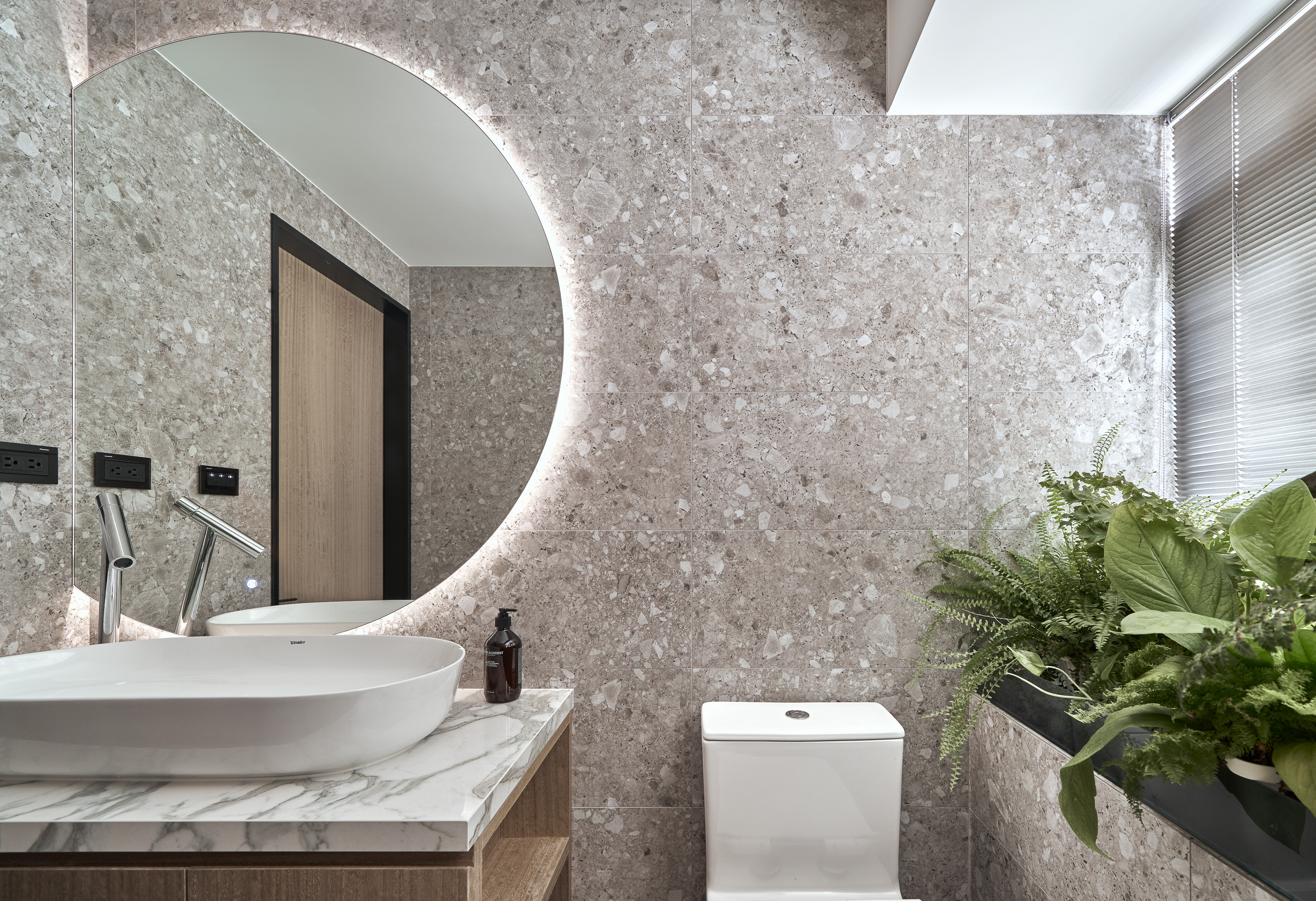 鋪設略帶懷舊磨石磚質感的客用衛浴,搭配上切割圓型鏡,為空間營造符合現代的設計元素。