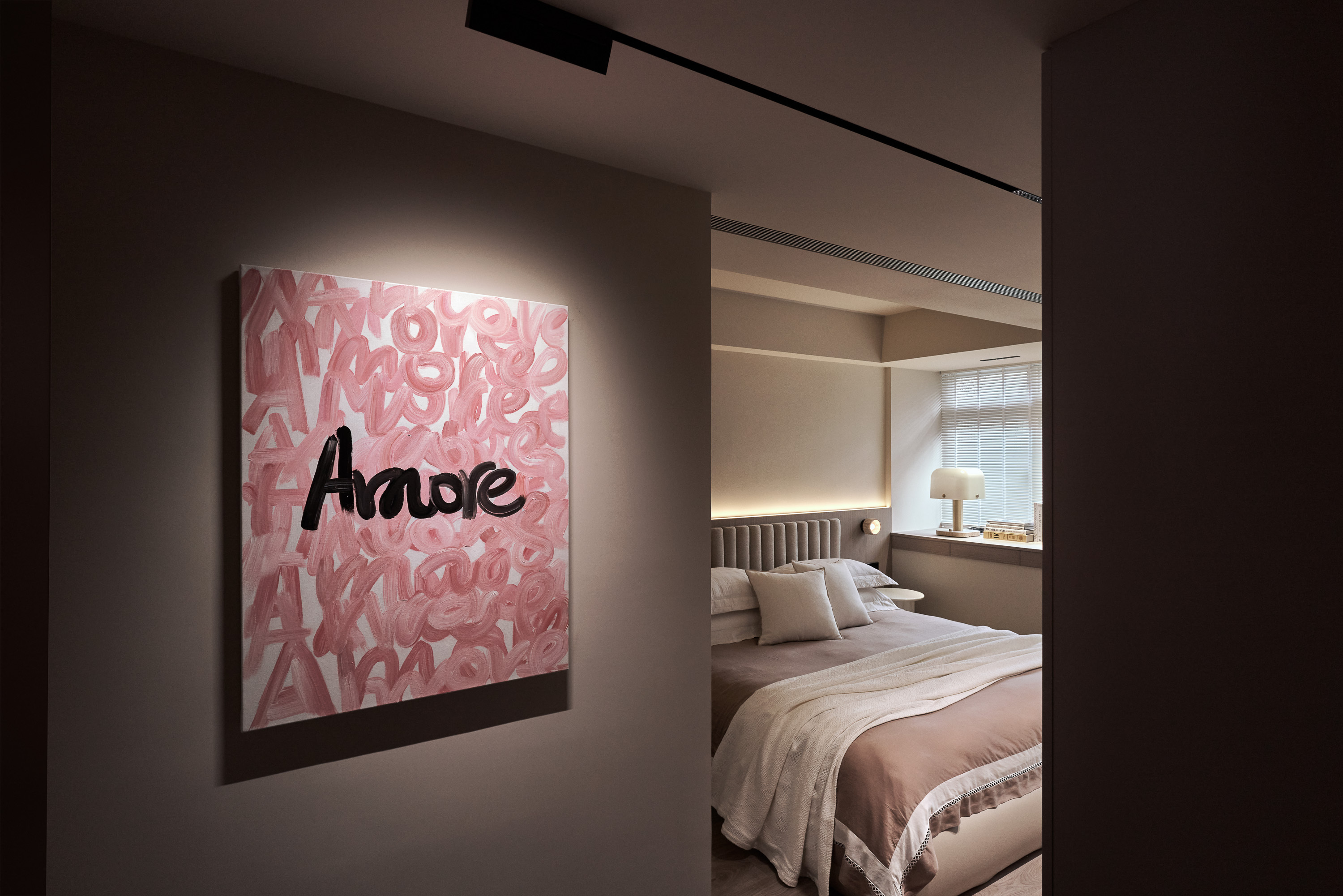 另外,選了與空間同色系的洞石床頭壁燈,及配置兩座床白色造型邊几,更兼具機能和設計感。