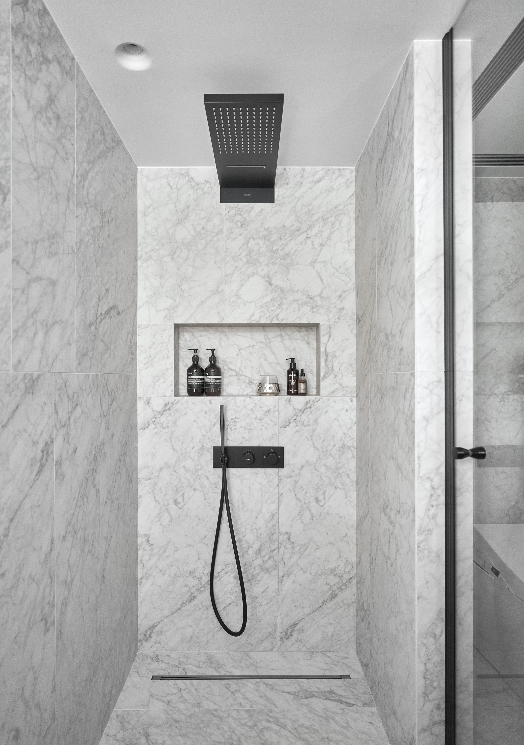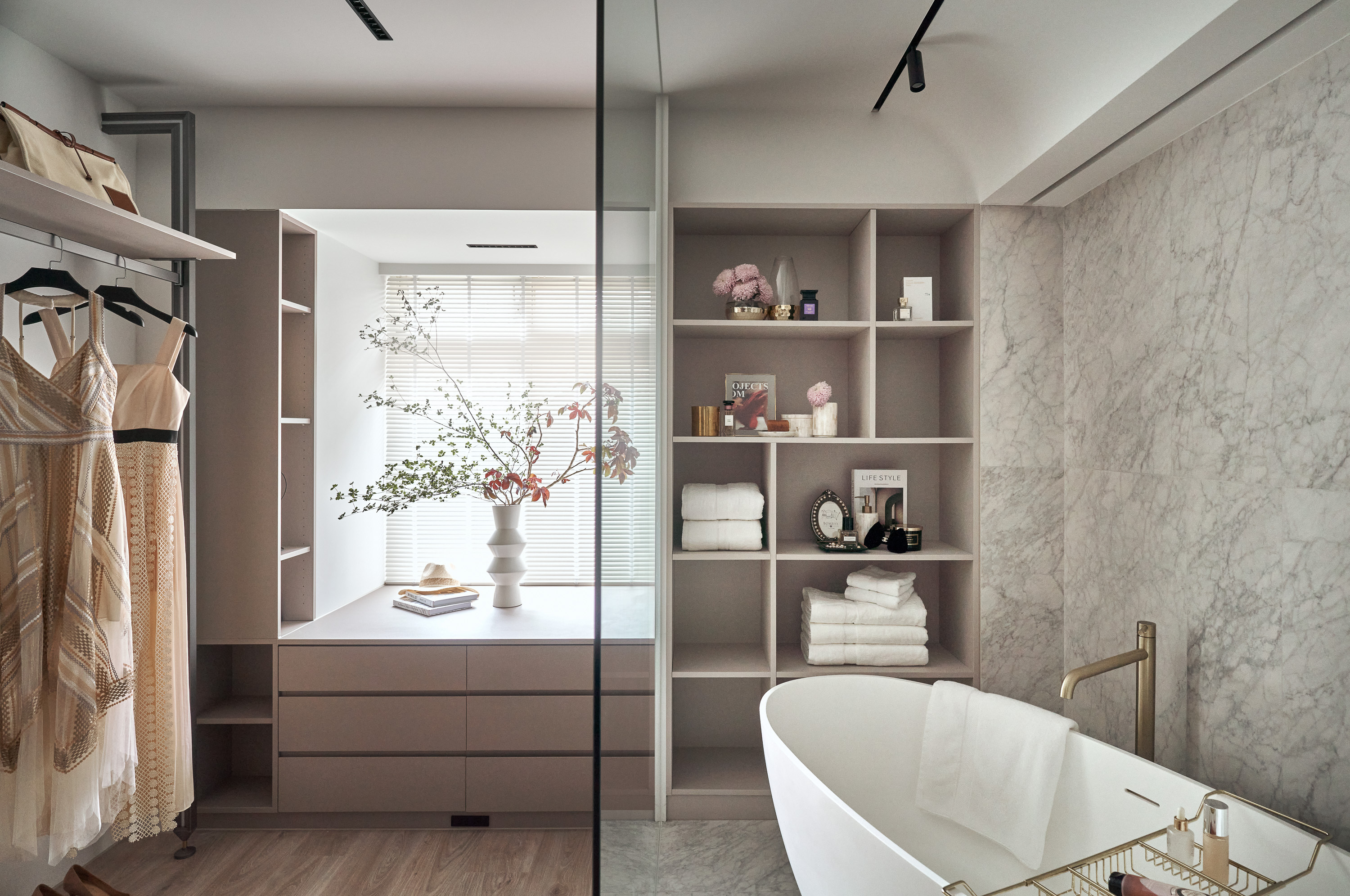 也是現在室內設計不常見的空間配置,設計師大膽的設計將更衣室和衛浴空間比鄰而立,隔間採用透明玻璃,讓空間更開闊及視覺效果。
