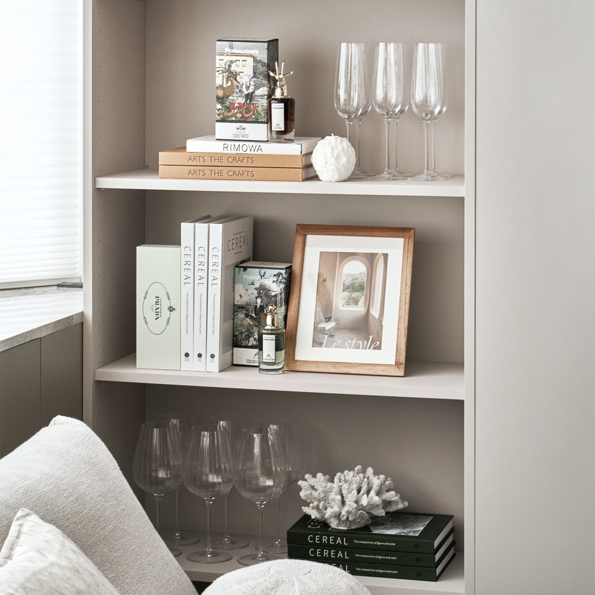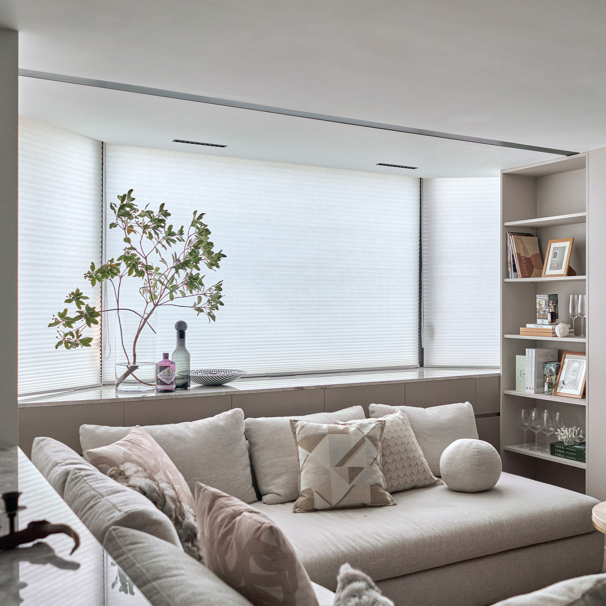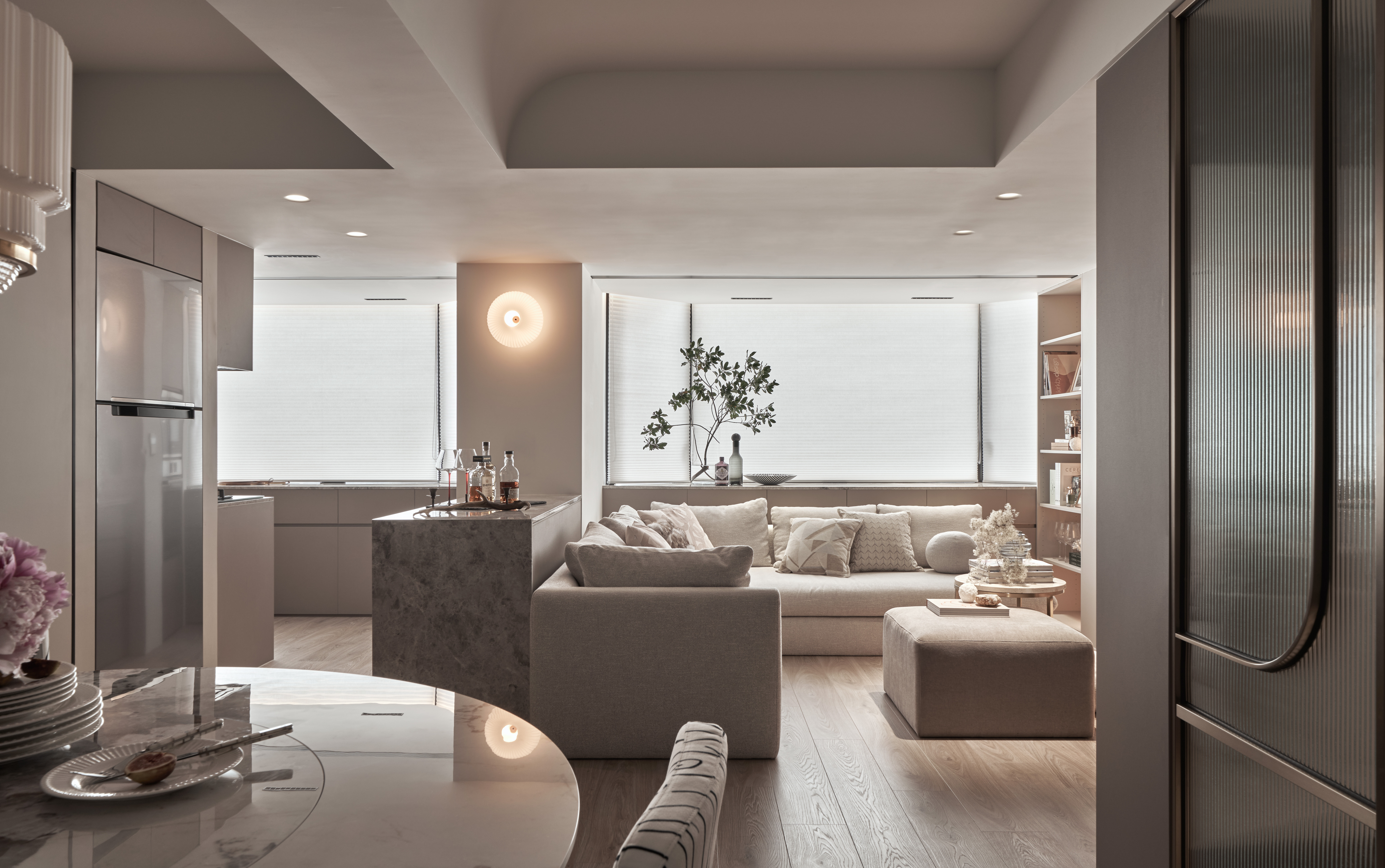因應屋主需求,以開放式手法規劃公領域,中性色調為客廳勾勒出質感與典雅,輕盈光感自在遊走,切換不同居家情境的光氛表情,大量運用窗邊的空間做收納櫃及陳列展示櫃,我們選用訂製的米白慵懶多人座沙發,客製化的沙發尺寸,在愜意午後輕倚沙發就能自喧擾紛擾的外界歸返入內。