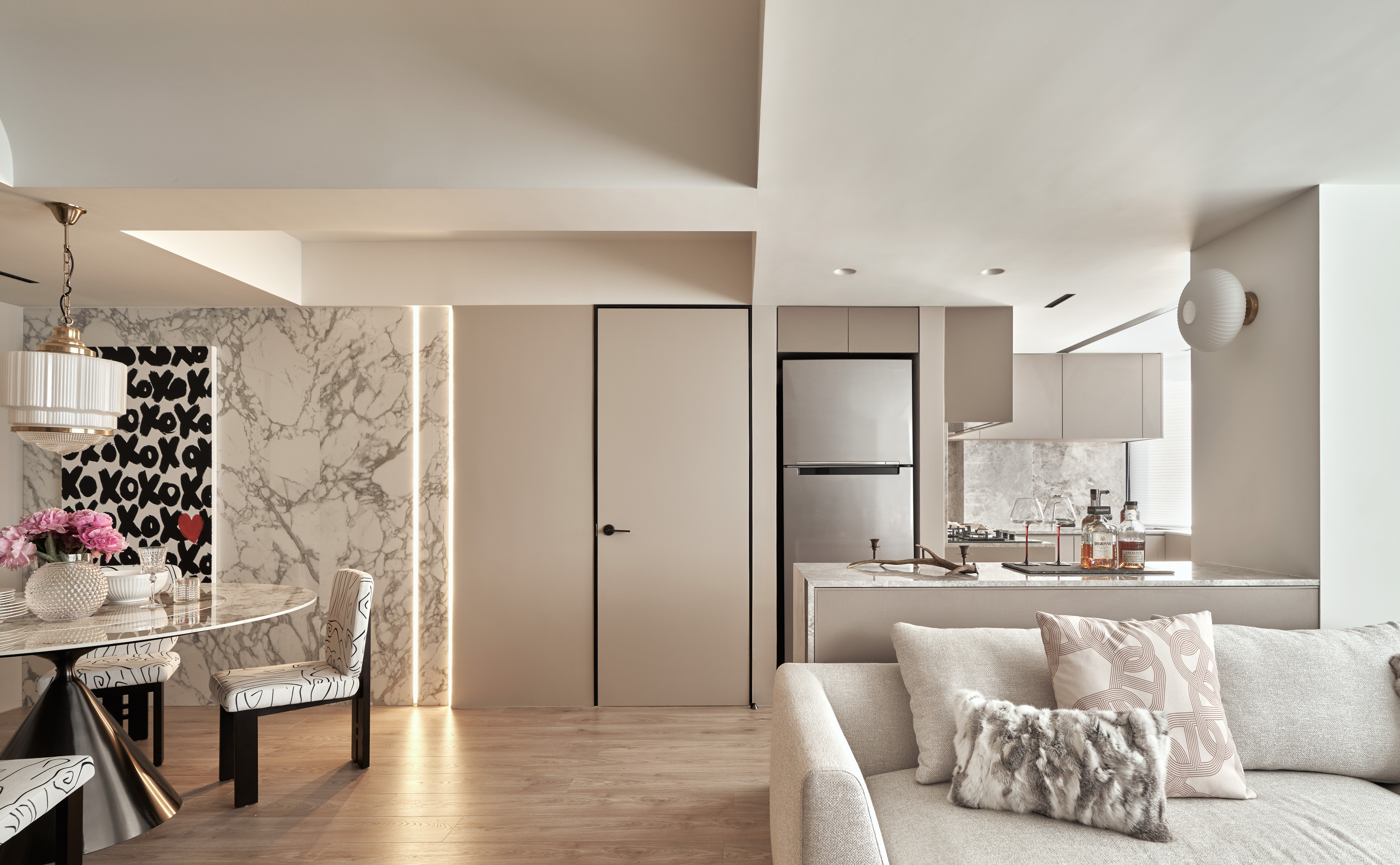 阿拉伯白石紋薄板造型牆成為入室後一眼所及的別緻主牆面,搭配燈條設計銜接異材質牆面,完美的劃分出不同公共空間。