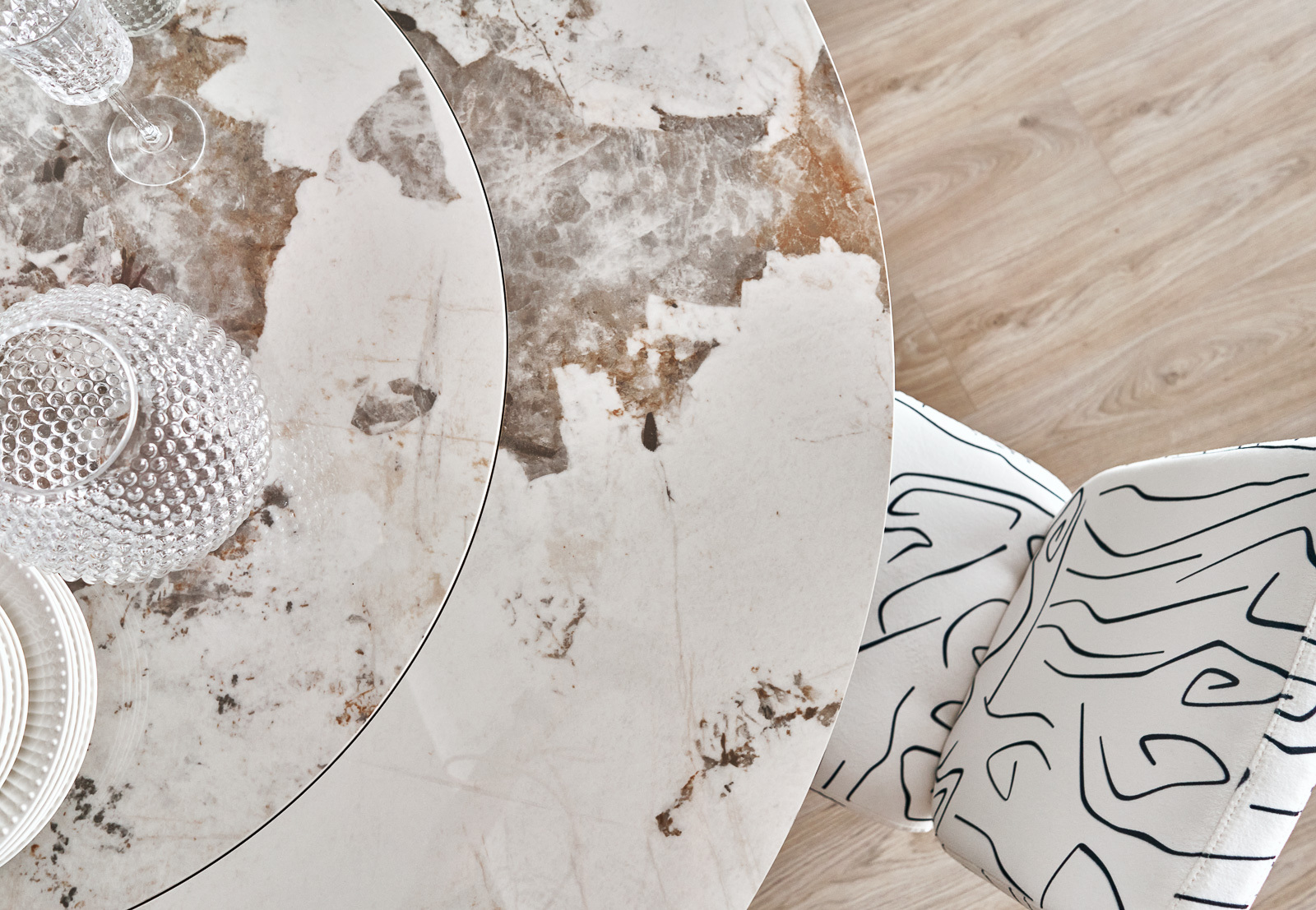 餐桌的設計上呼應了牆面設計,我們以訂製薄板石紋圓型餐桌,搭配80's法式復古吊燈,在時尚的黑白色調勾勒下,細膩地為這餐廳空間增添時尚輕奢質感。