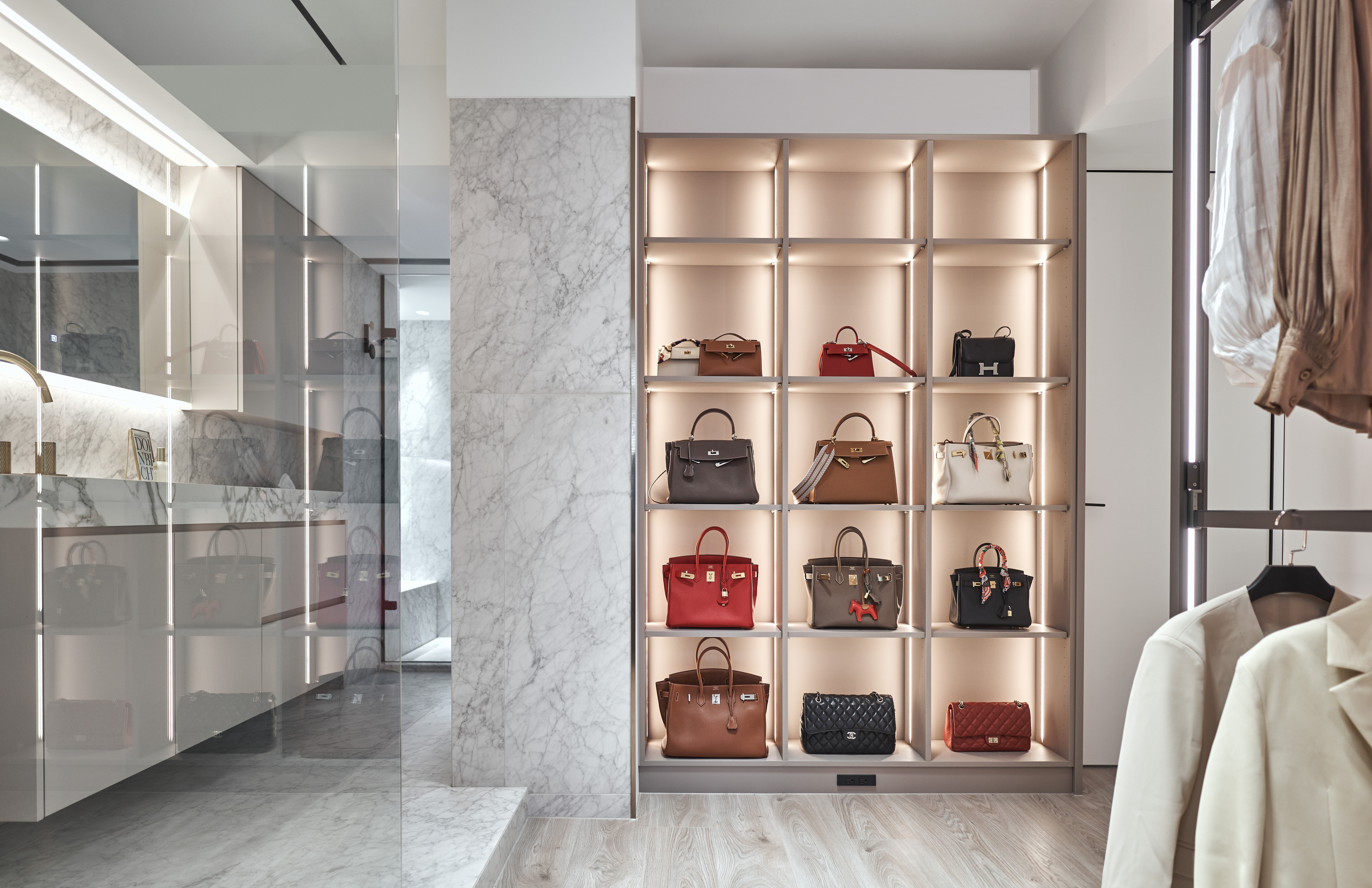 這個空間原有的窗戶通風條件較好,加上事先規劃好的全室系統做好空間的濕度控制,讓人不用擔心濕氣太重導致心愛的衣物或是包包發霉的問題,在更衣室區規劃精品包包櫃及開放式衣櫃,滿足屋主置放衣物、包包和飾品各種收納需求。