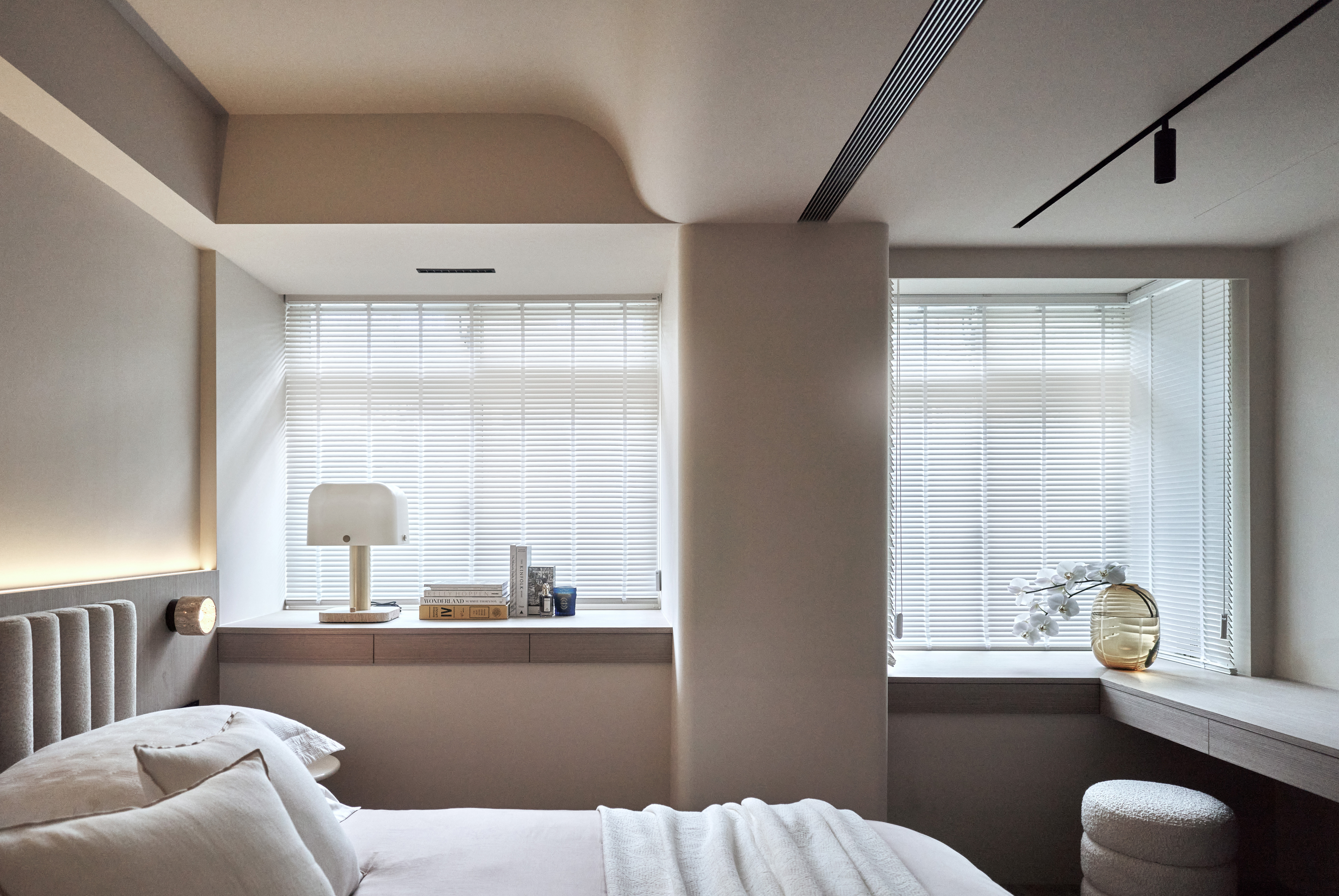 一進房門的半牆以不直接見床的隔局設計,專屬主人的私密空間保有隱私,天花在圓弧造型的修飾下弱化了頂上大樑的壓迫感,淺木床頭板搭配蓬鬆面料床頭造型設計,柔軟質地烘托舒眠意境。