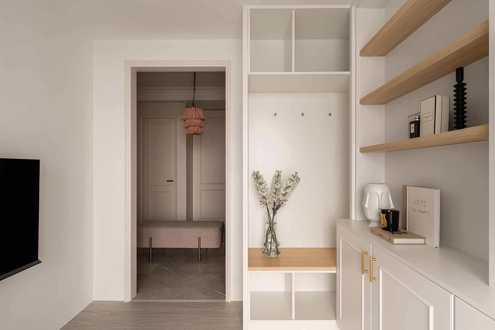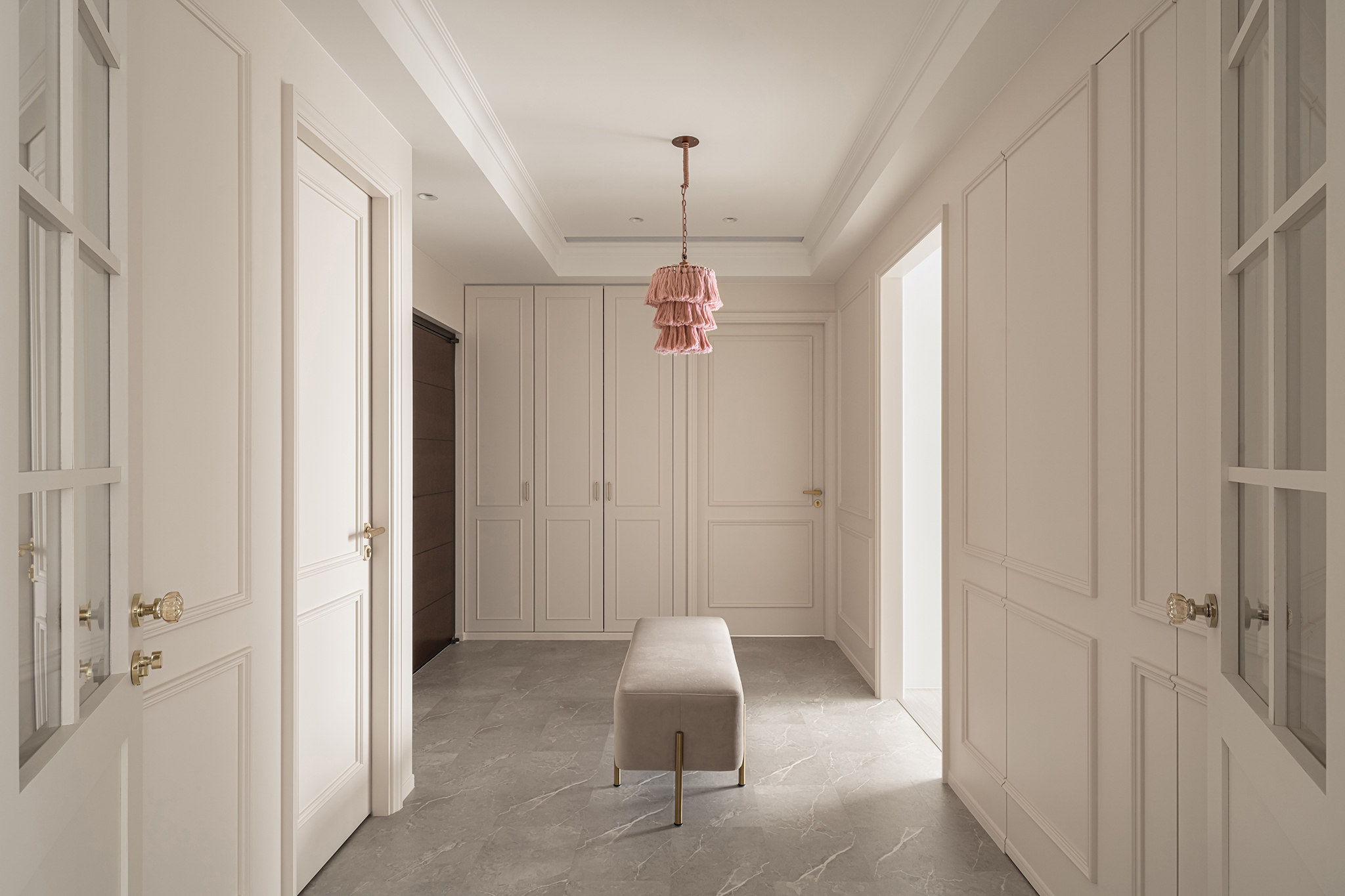 以法式風格為整體空間的主軸,大量採用線板元素貫穿整個公私領域,這個案子為兩戶打通,有別台灣常見的小範圍的玄關規劃,我們大膽將進門的玄關設計為一個迎賓的廊道,玄關延伸多功能室,並引光入室,營造不同以往的玄關場域,環顧四周整片收納櫃體,善用空間規劃充足收納,運用暗門修飾洗衣空間及儲藏室,並利用線板雙開門,作為公領域及私領域的區隔,兼顧視覺上華麗優雅的層次感,採光及功能上同時具有隔音的功能,追求空間美學及生活機能的互相加乘。