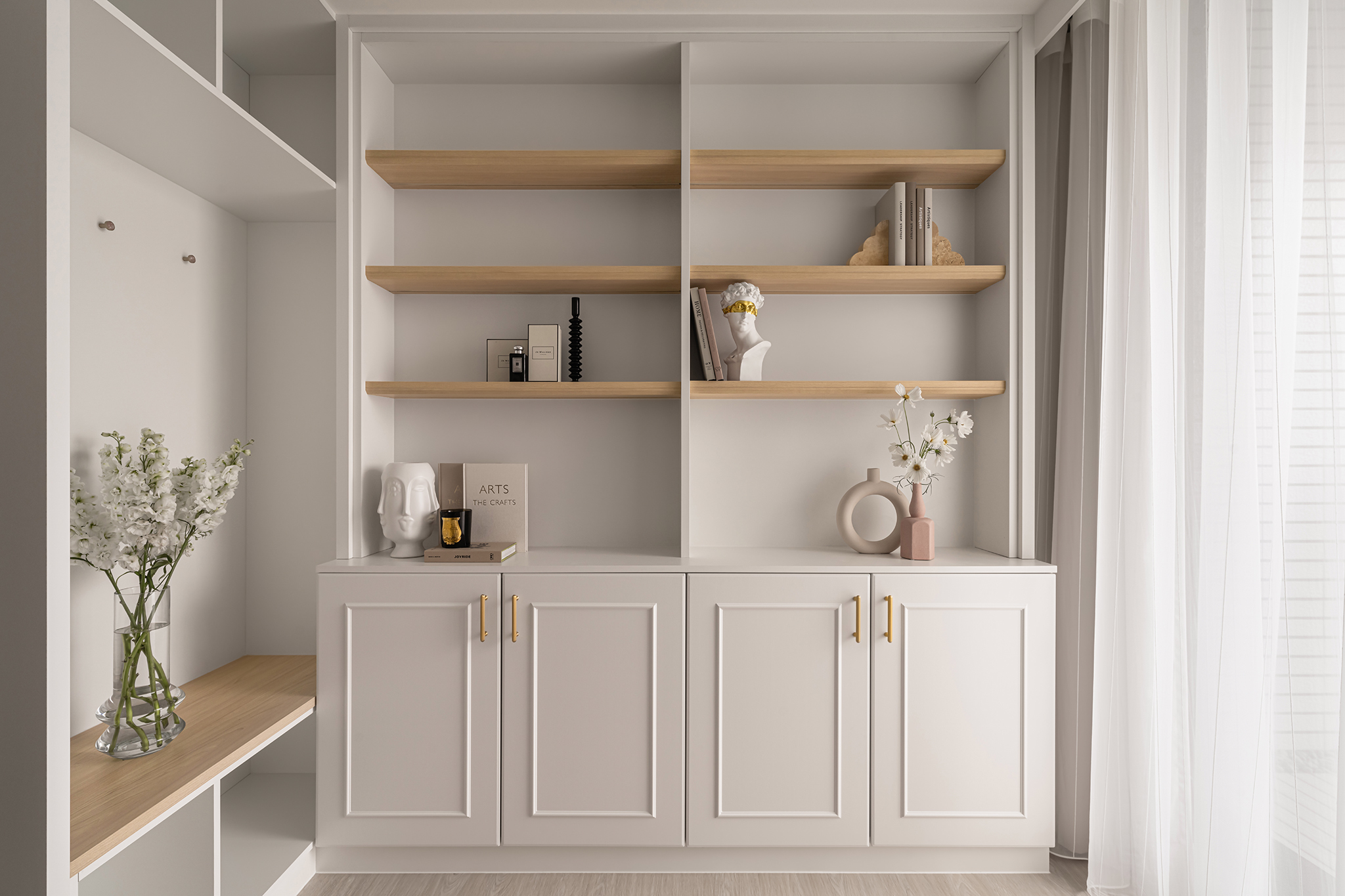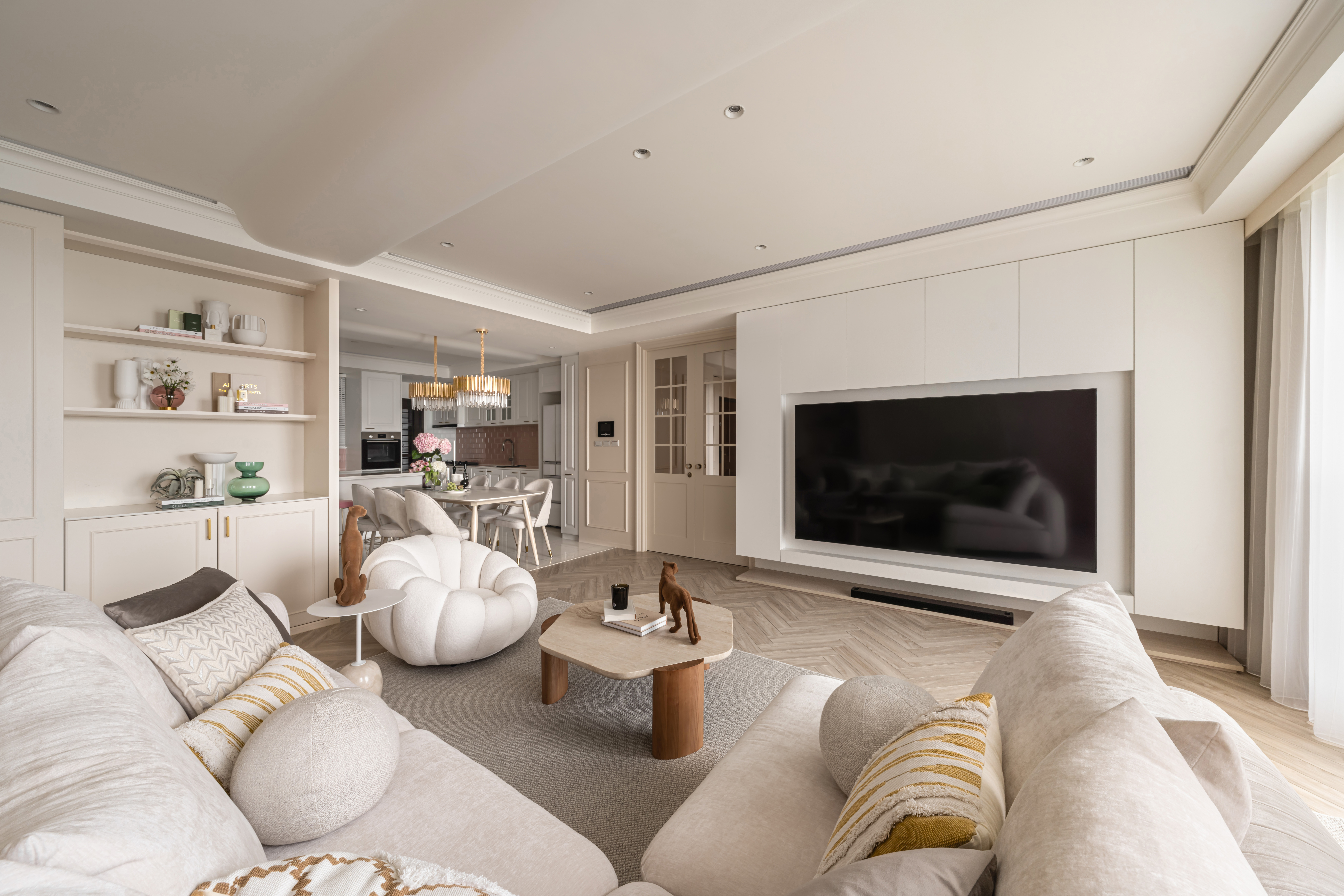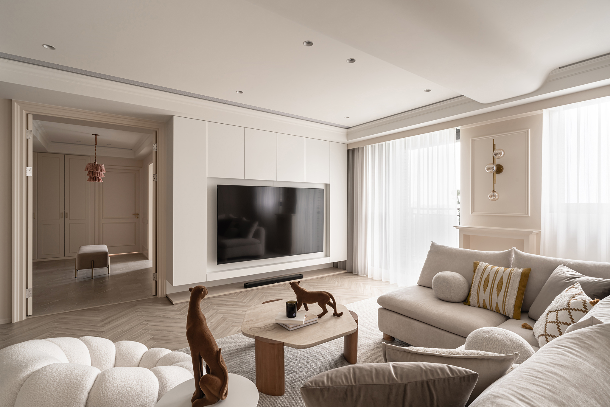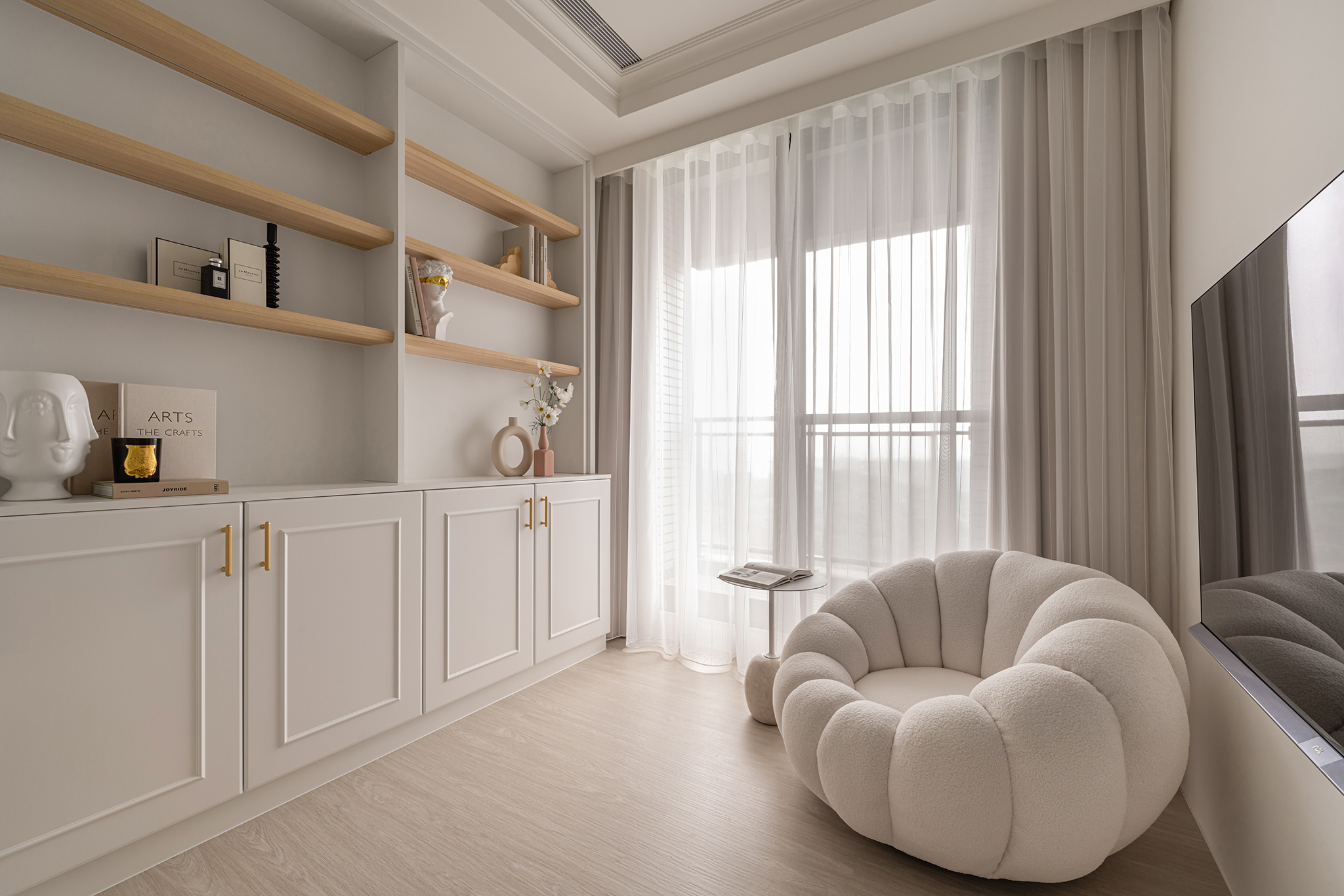 另外在軟裝傢俱選用米白色系,沙發使用波蘭進口布料,單椅選用羊羔毛,富含溫暖優雅的材質,提升空間溫馨氣氛,電視牆及沙發背牆暗藏大量的收納櫃,整排牆面的收納讓屋主能夠大量收納雜物,入住後依然能保持家裡的清爽整齊。