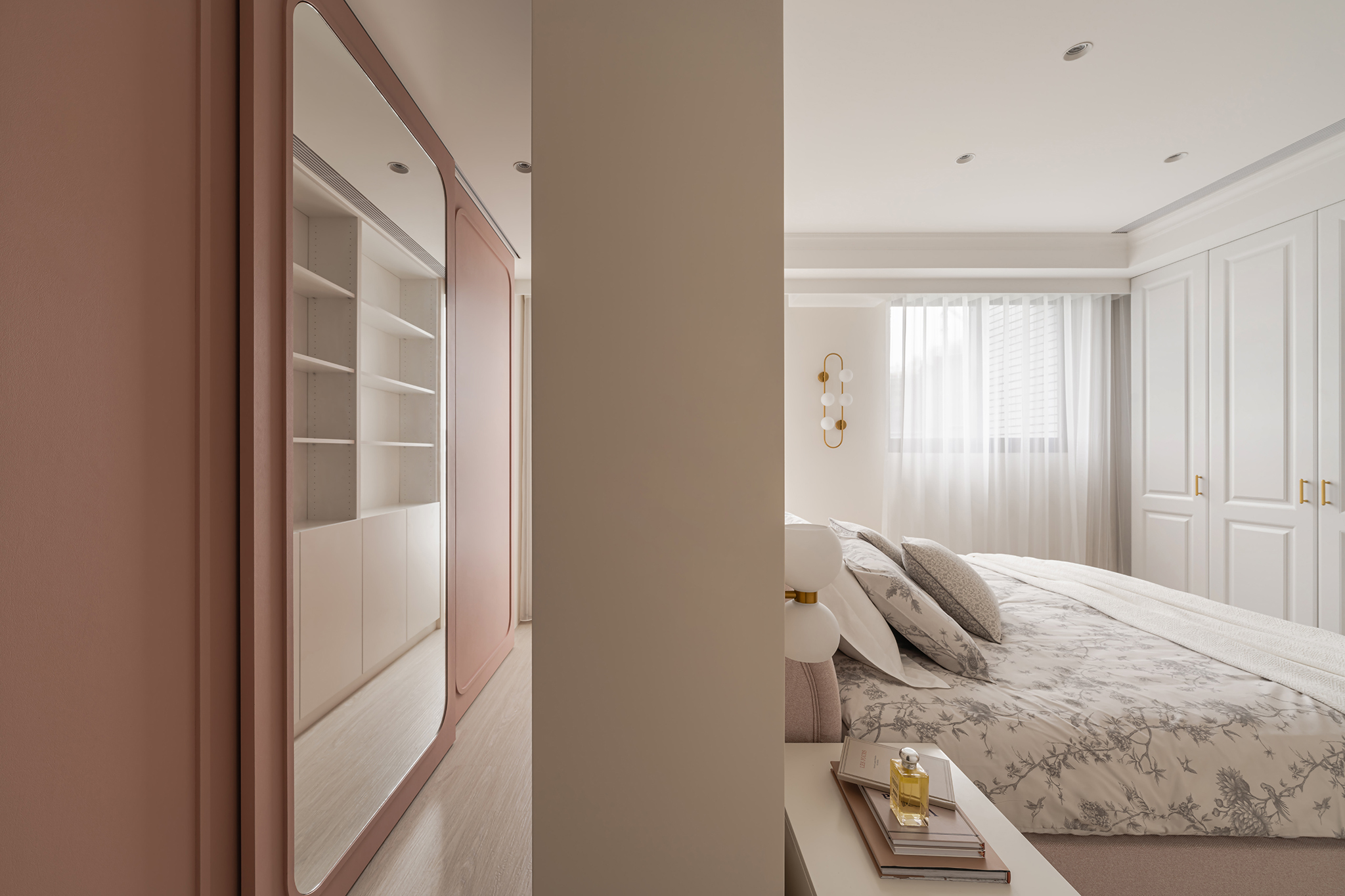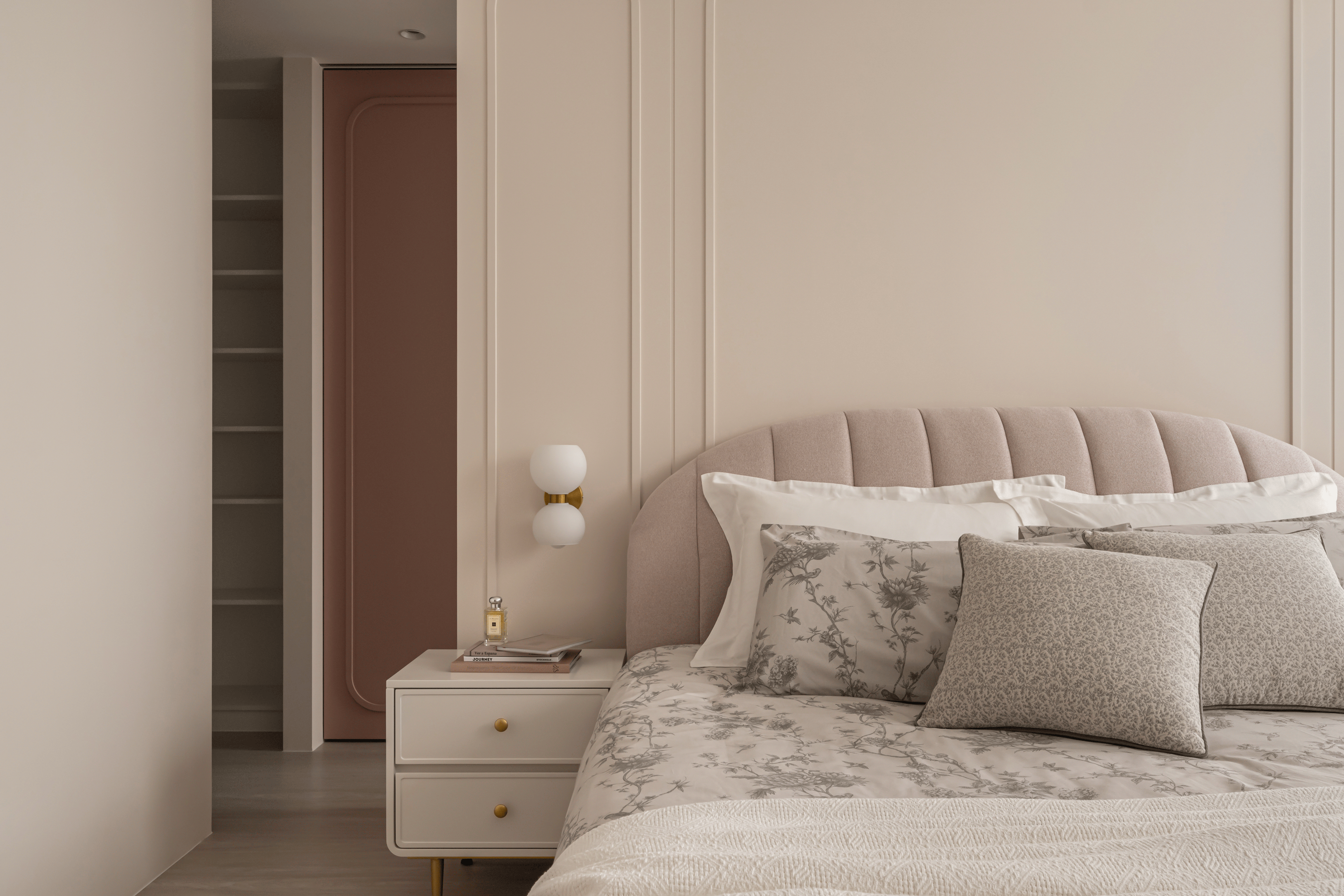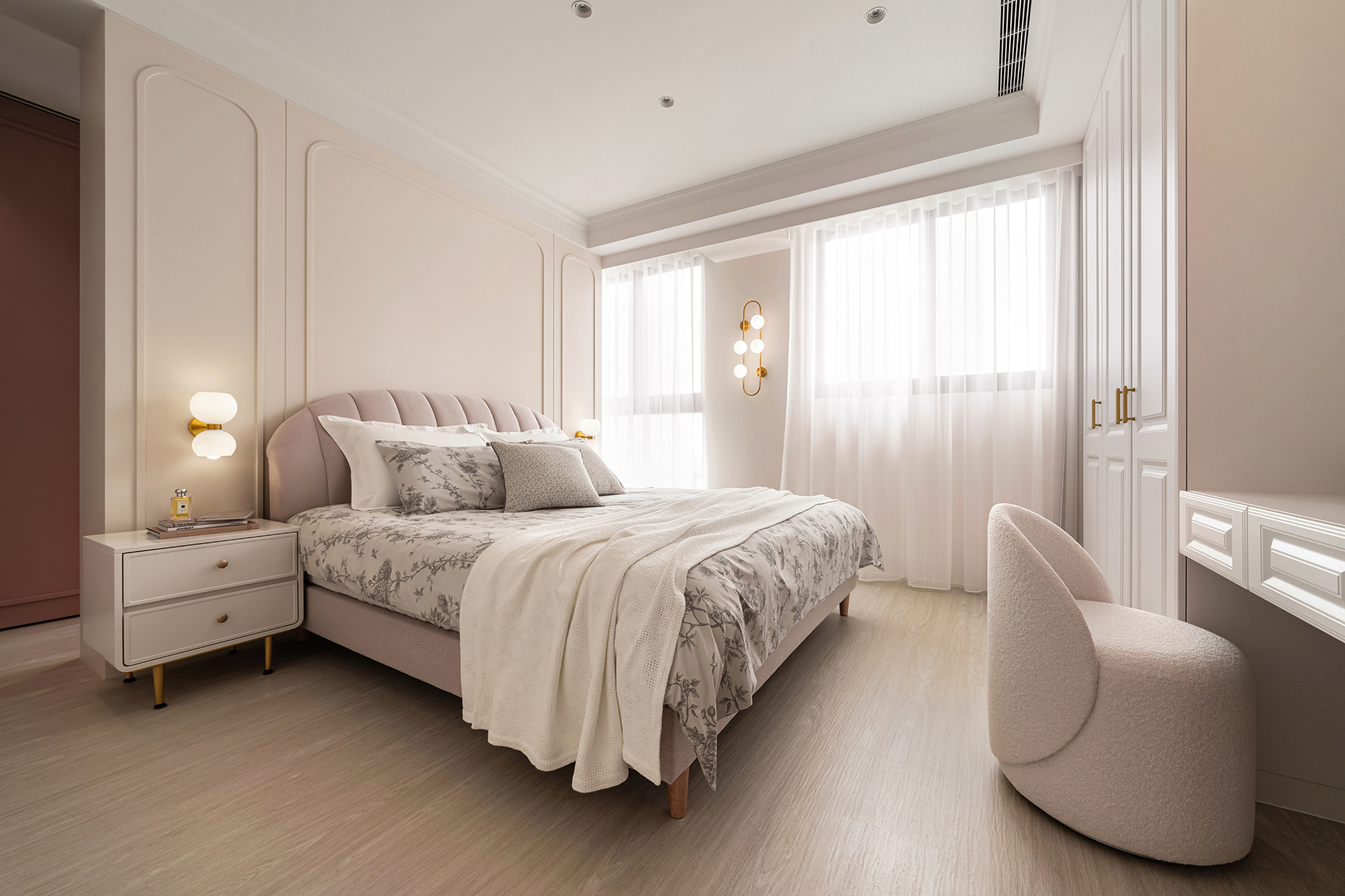 主臥延續法式風格的一致性,乾燥玫瑰粉及圓弧線板細節堆疊,