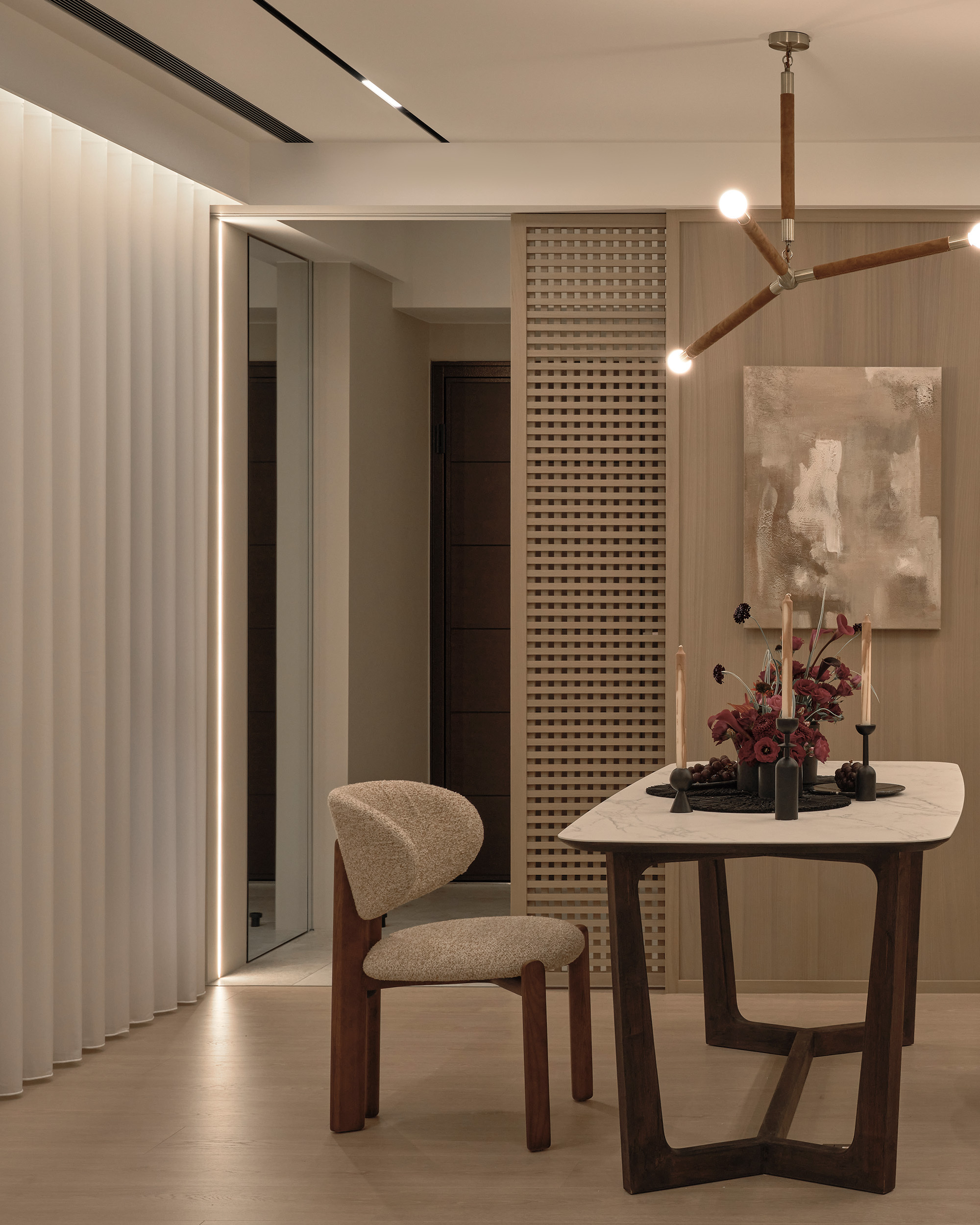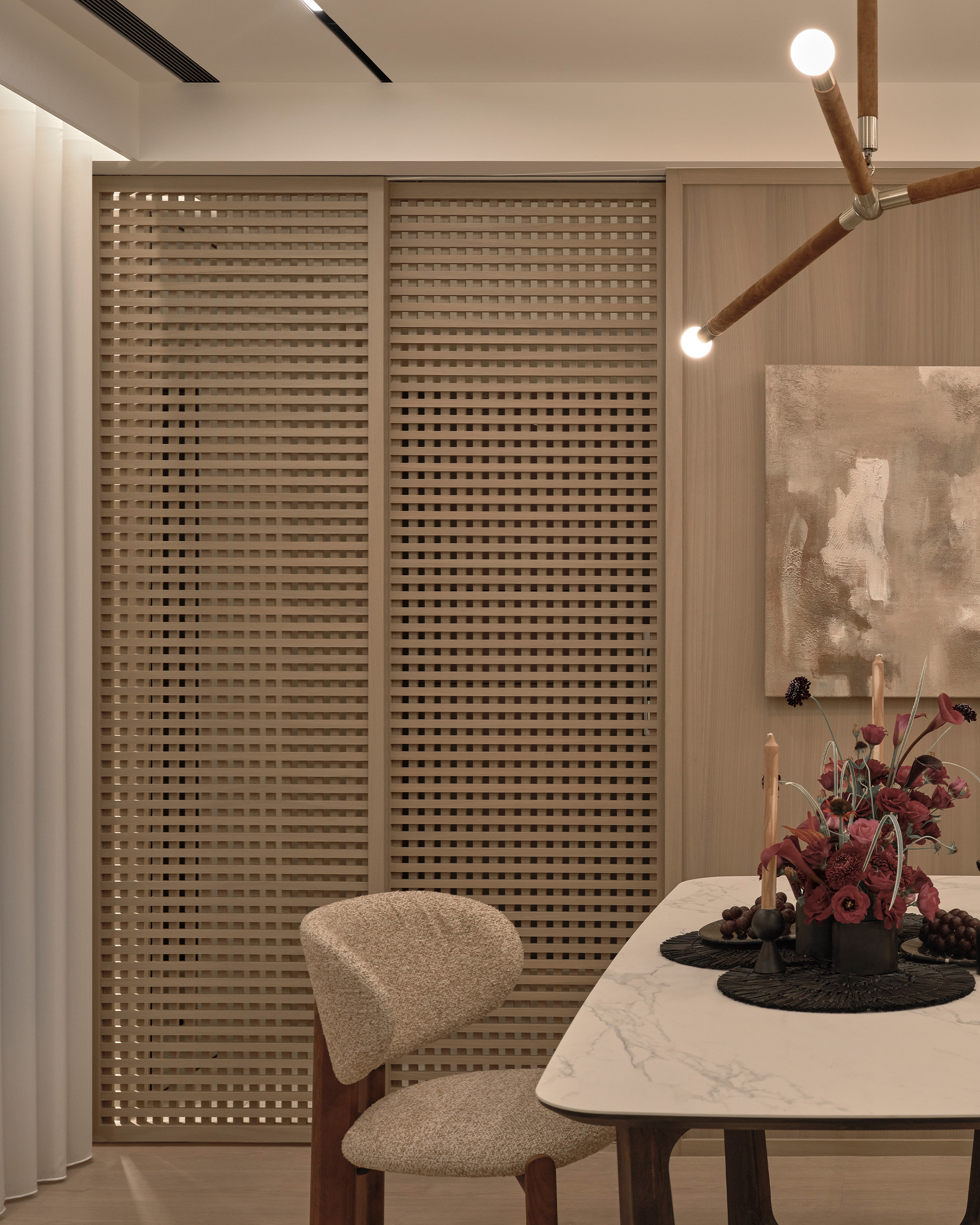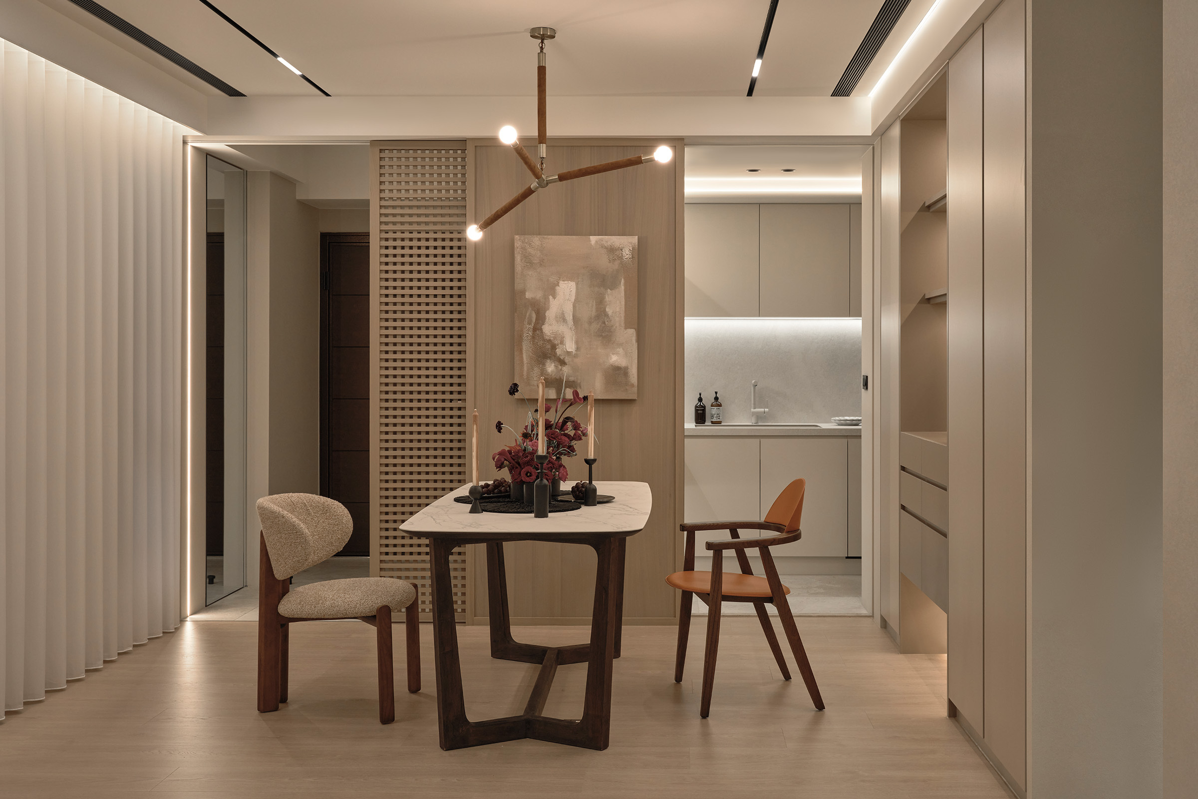 穿過玄關格柵門,開放式的客餐空間徐徐展開。