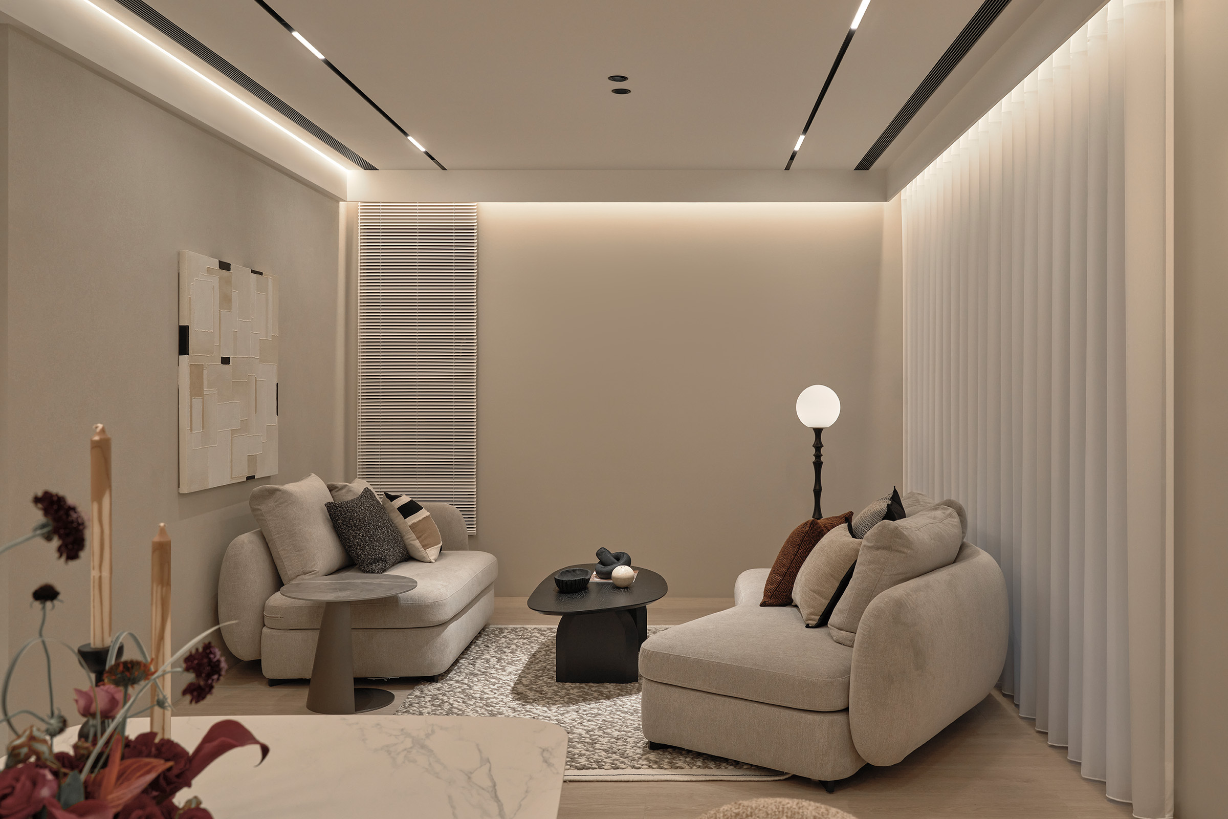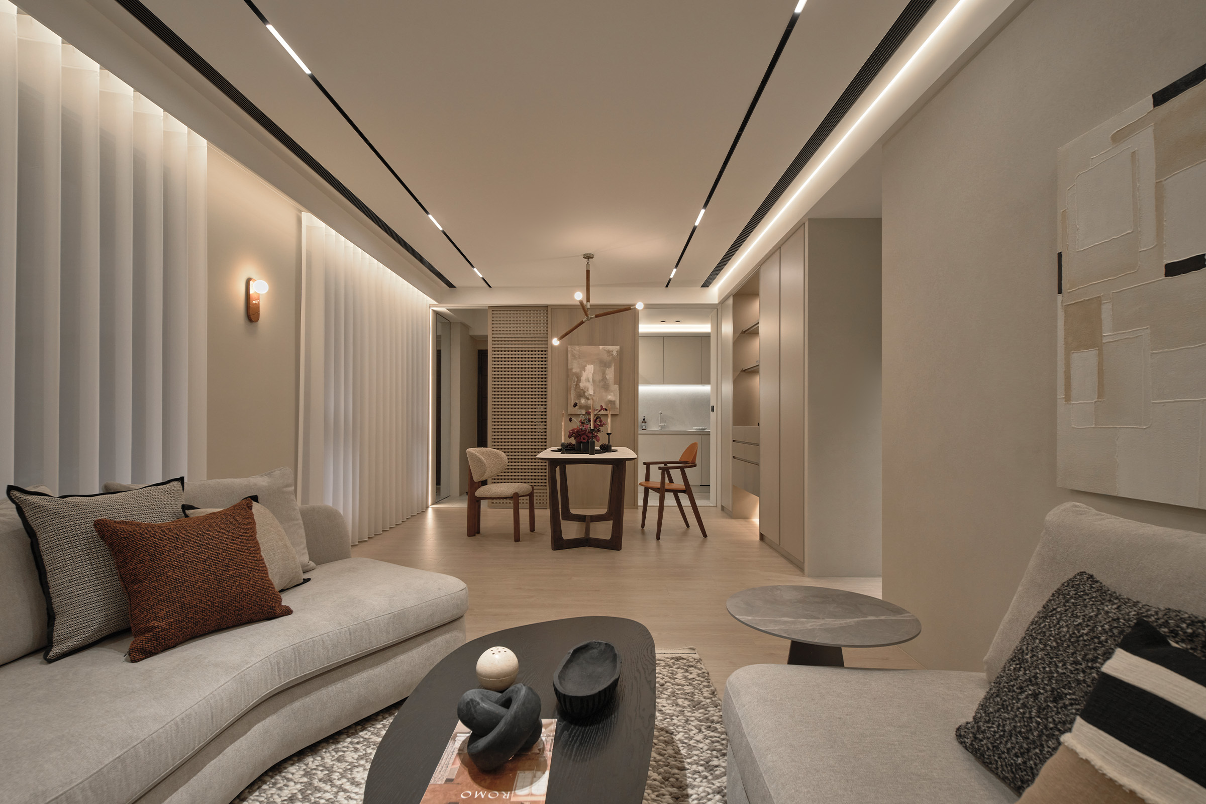 採光面選用大面積紗簾,讓戶外的自然光柔和滲入,白天明亮舒心,夜晚也成為療癒的氛圍場域。