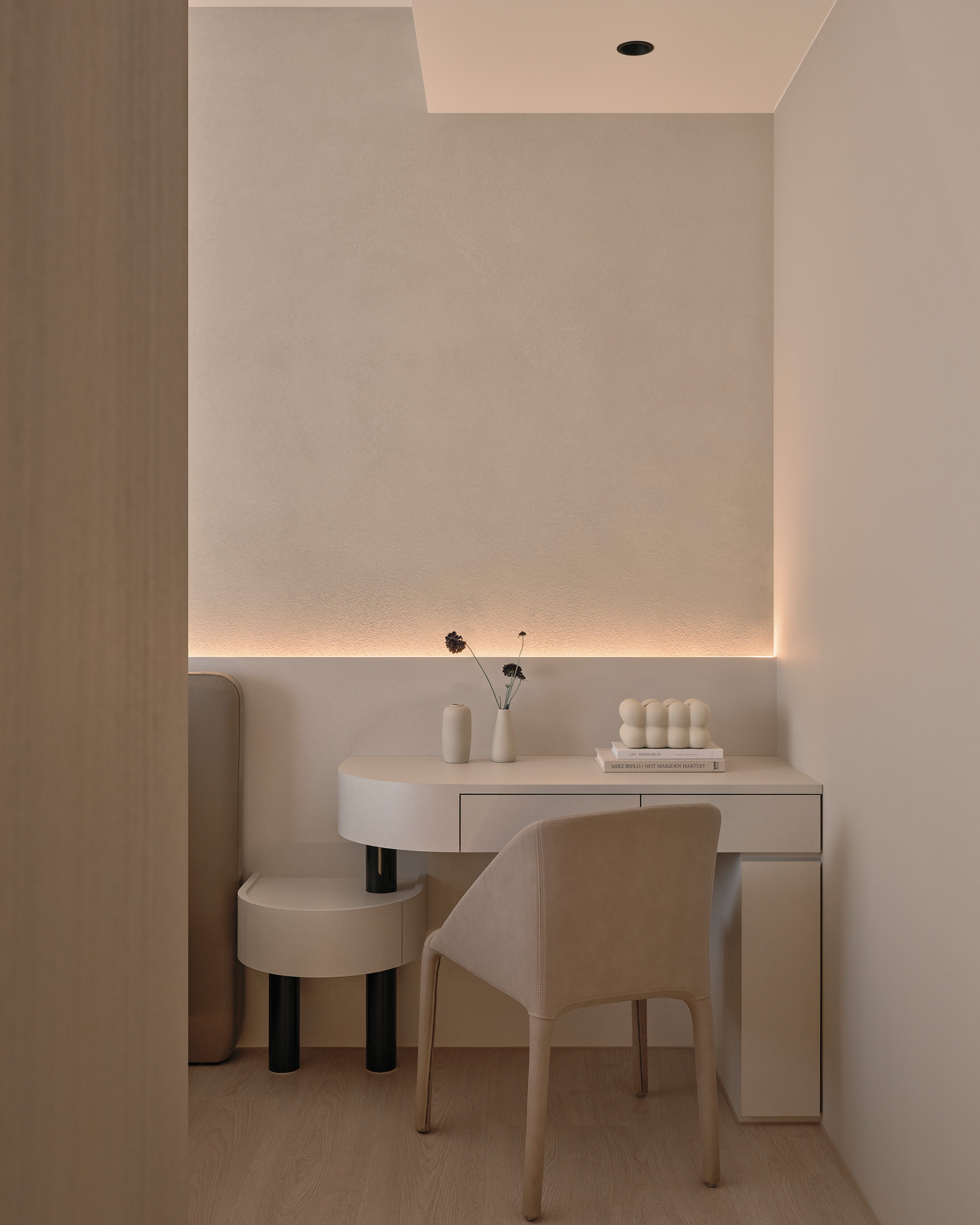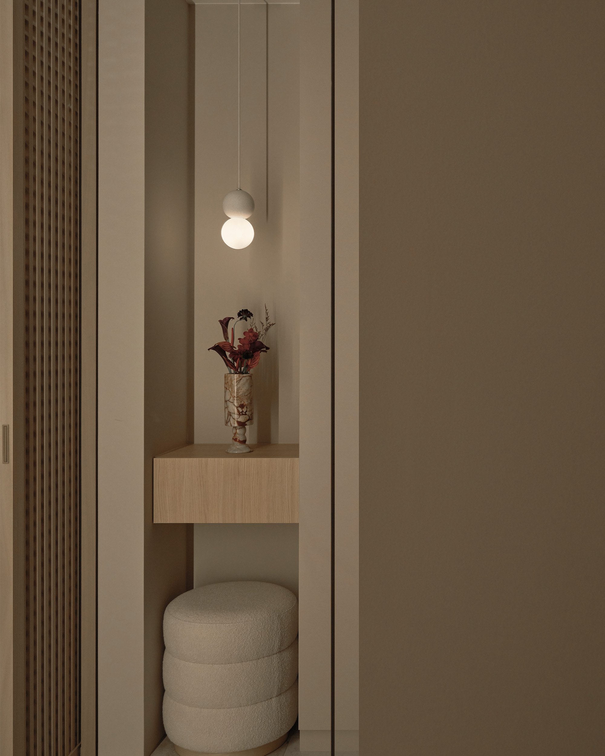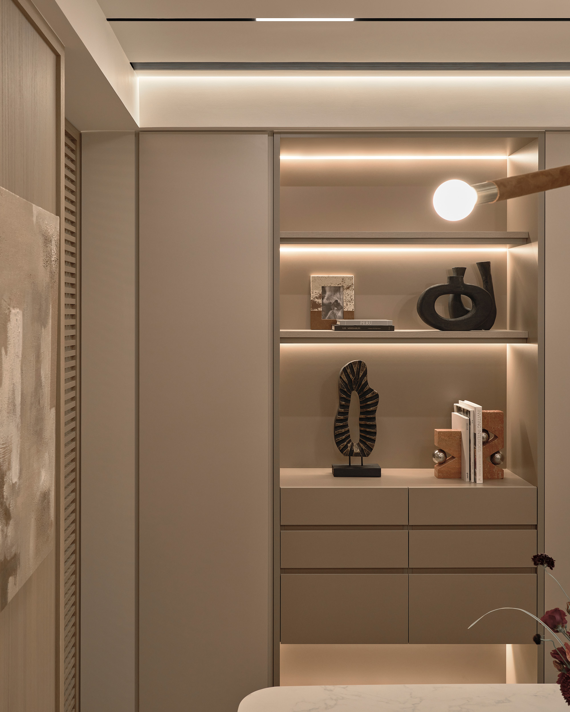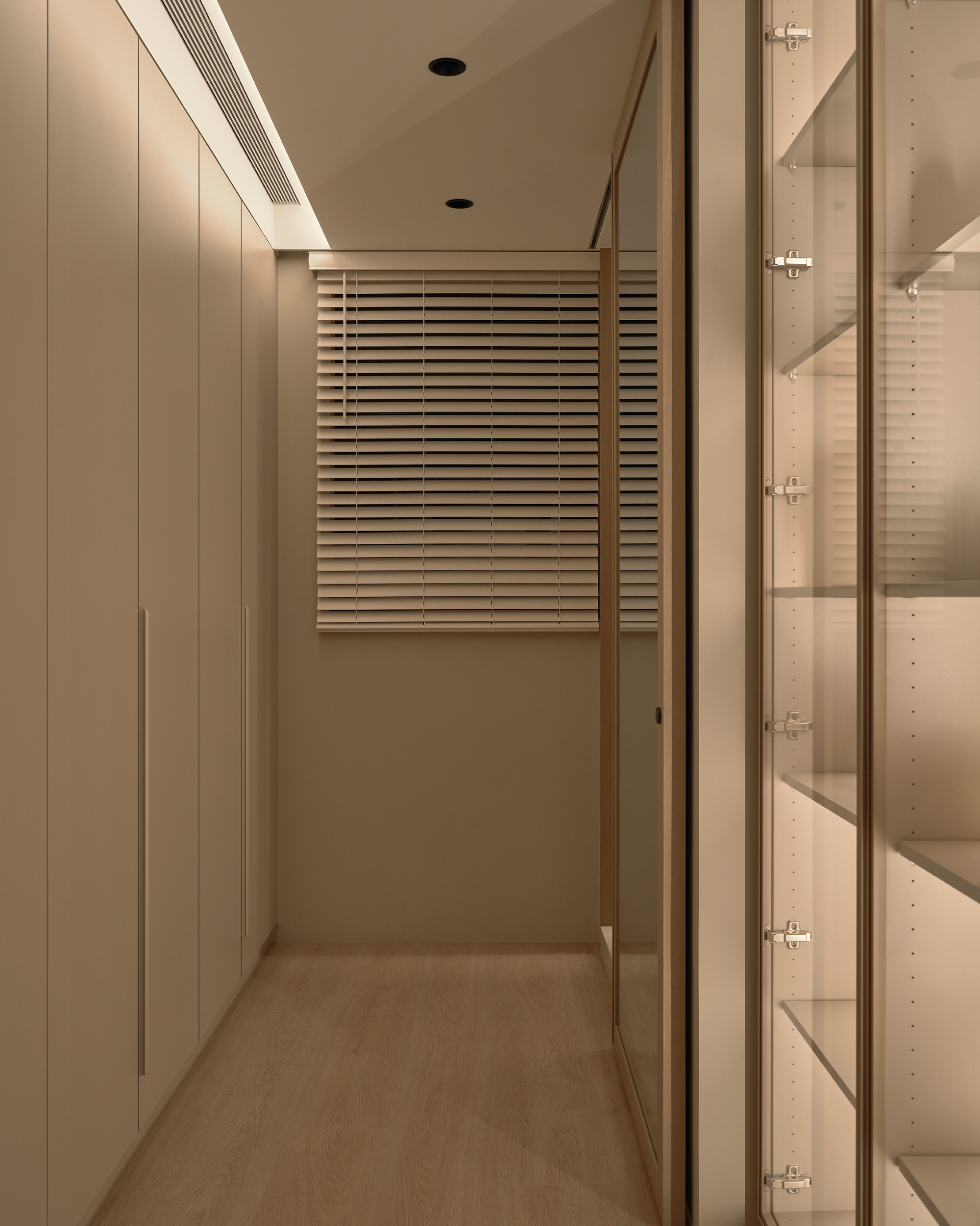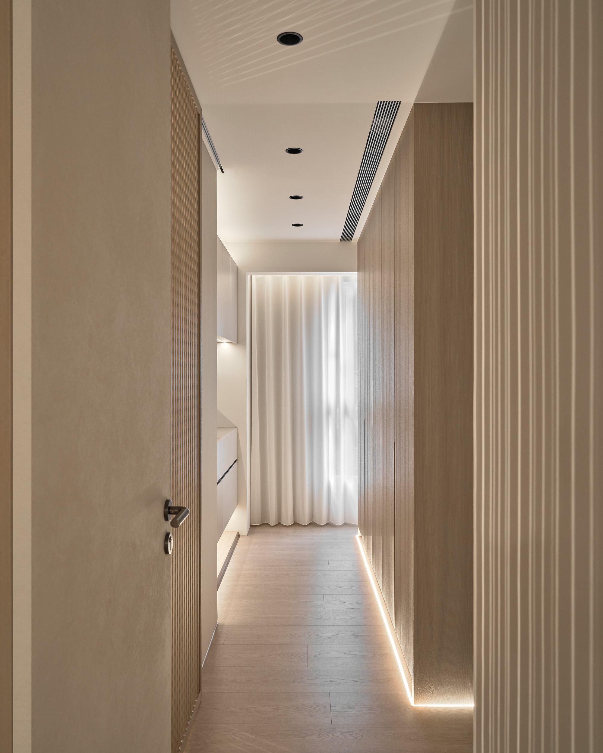 主臥床尾的收納櫃體,像一道低調的屏障,悄悄阻隔了公領域的視線,柔和廊道光線沿櫃面流動,拉長空間比例的視覺感。