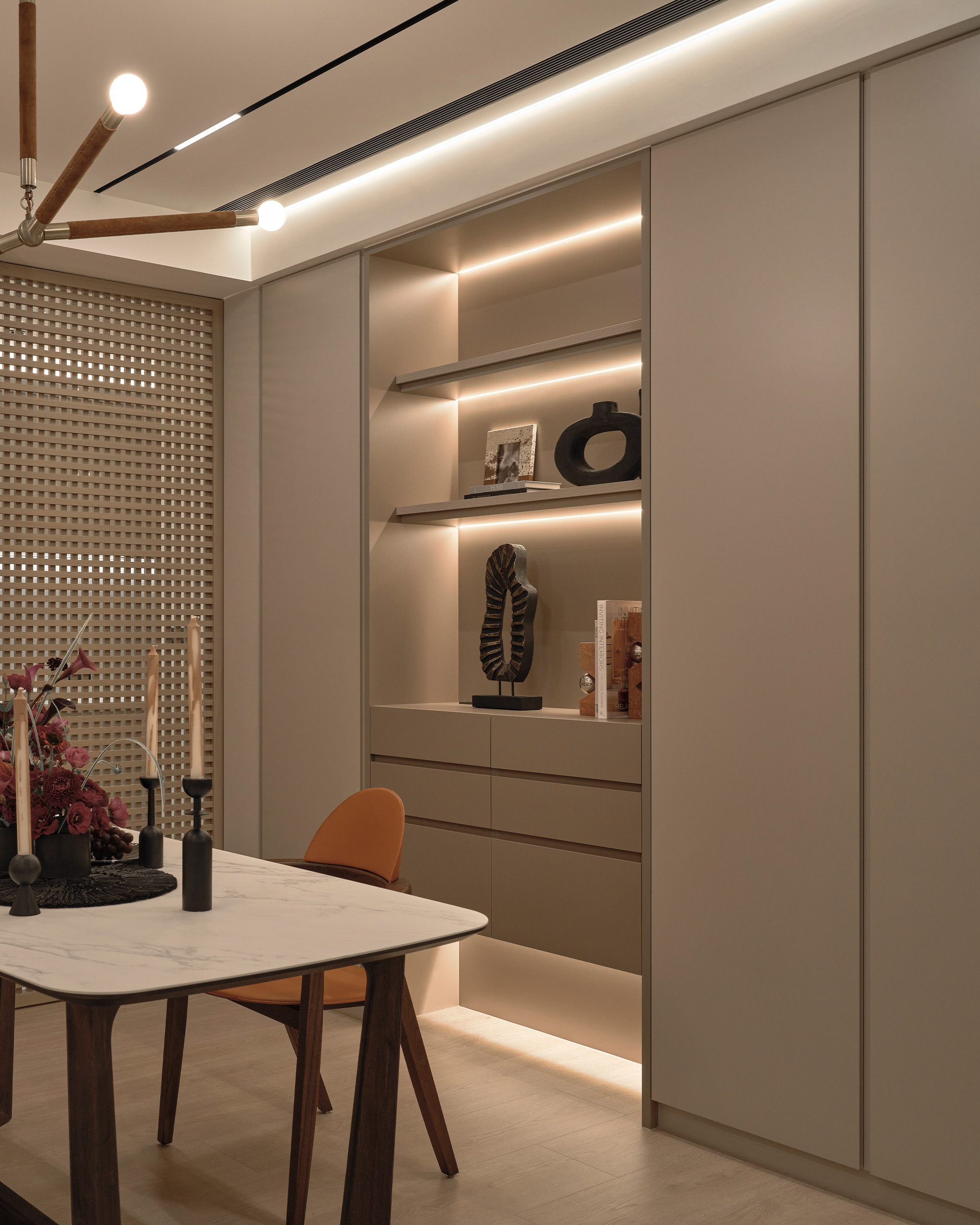 屋主對收納機能有著明確需求,因此將客餐廳的收納系統整合進餐邊櫃與訂製木質櫃體之中,讓生活物件各得其所,空間也因此維持清爽而有節奏的視覺表情。