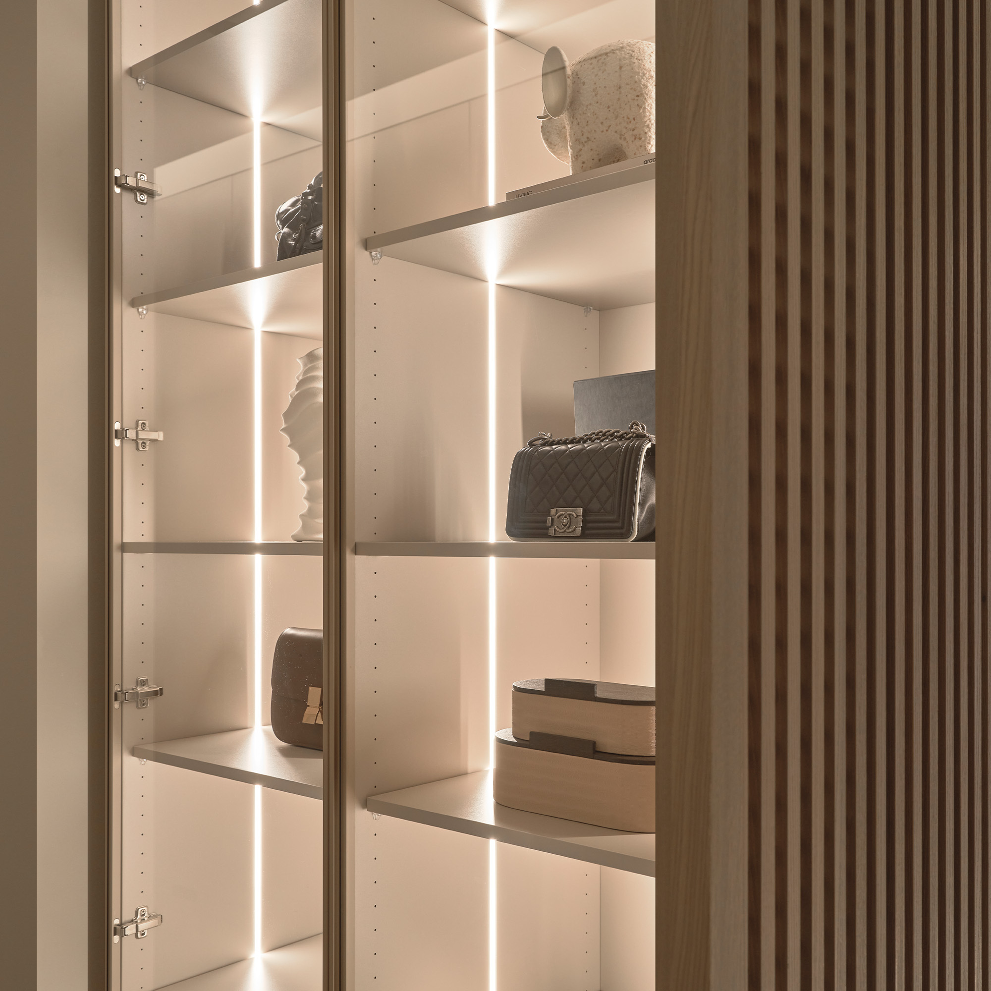 更衣室裡的玻璃展示櫃,燈光輕輕灑落在每一個包包與配件上,每件小物都有專屬位置,取放順手又賞心悅目。每天打開櫃門,挑選搭配的瞬間,讓日常穿搭也變成一種小小儀式。