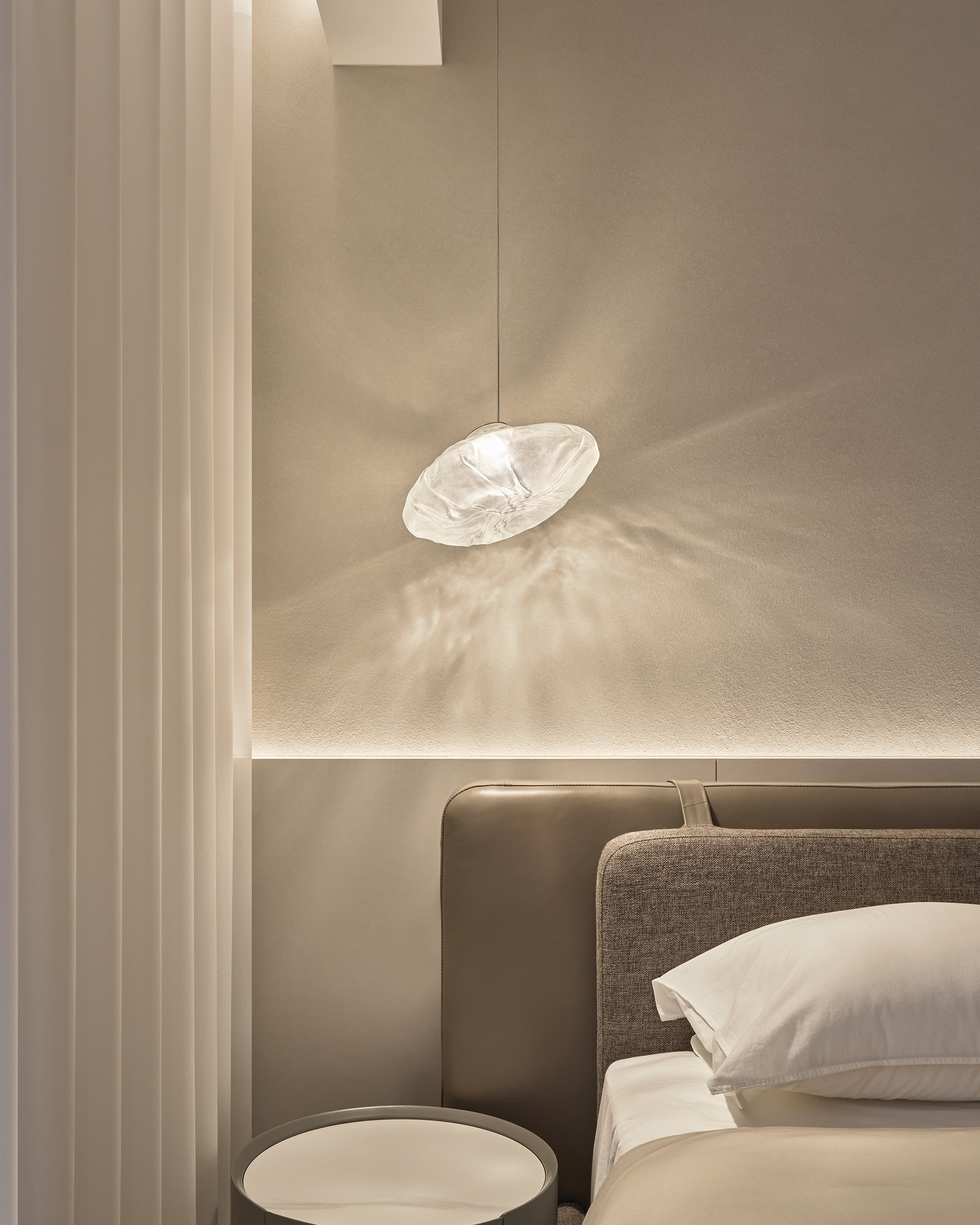 考量屋主夫妻生活作息不同,主臥採用分區式間接照明配置,將床側燈與環境燈分別獨立控制,讓一方休息時,另一方仍能自在活動,彼此互不干擾。