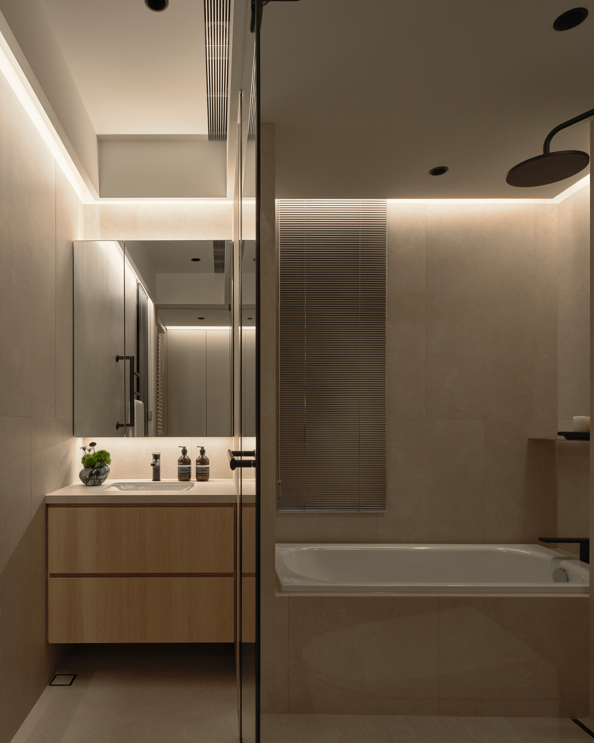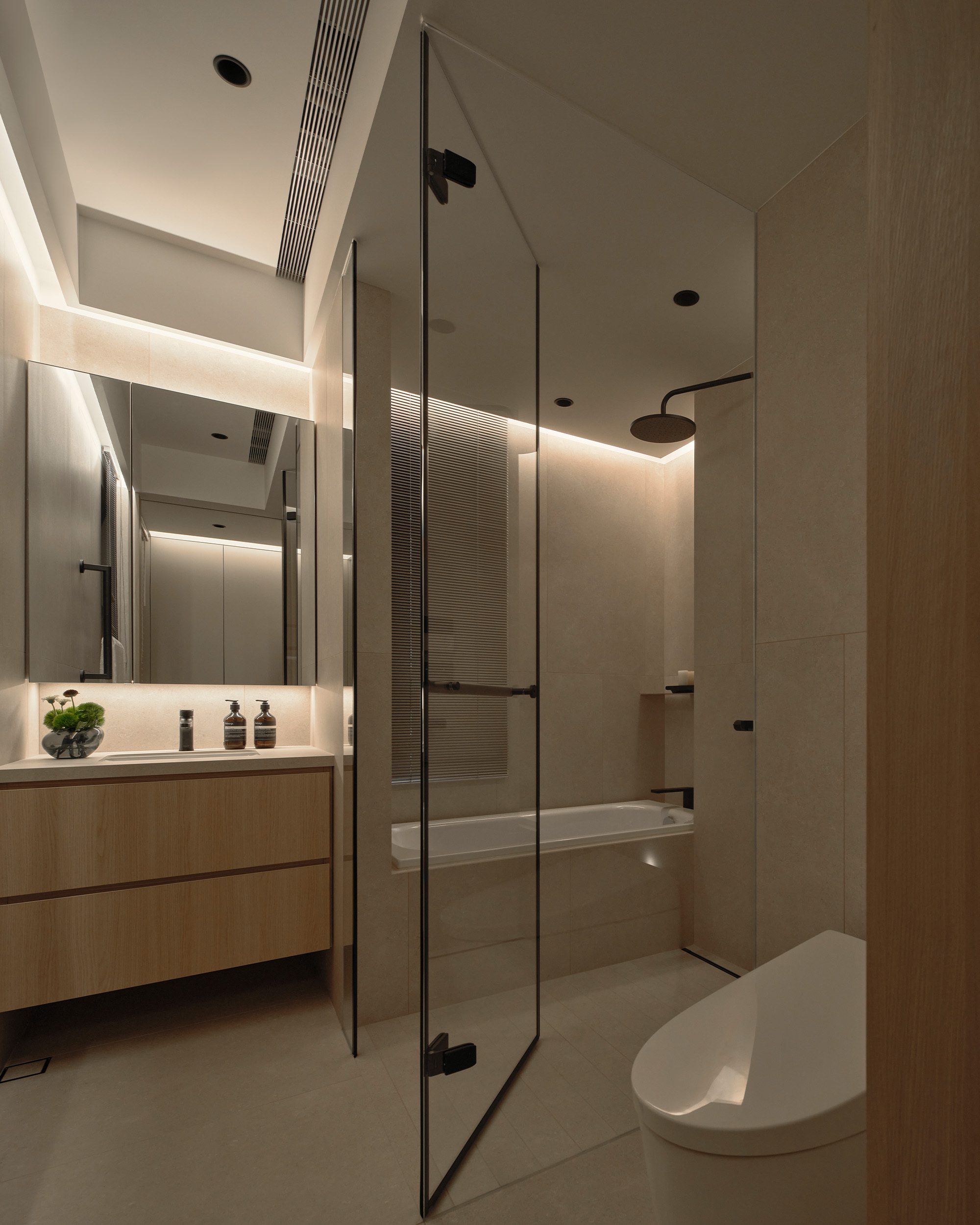 主衛浴則以乾濕分離為基礎,搭配完善收納與照明規劃,讓洗滌、保養與靜心形成穩定節奏。