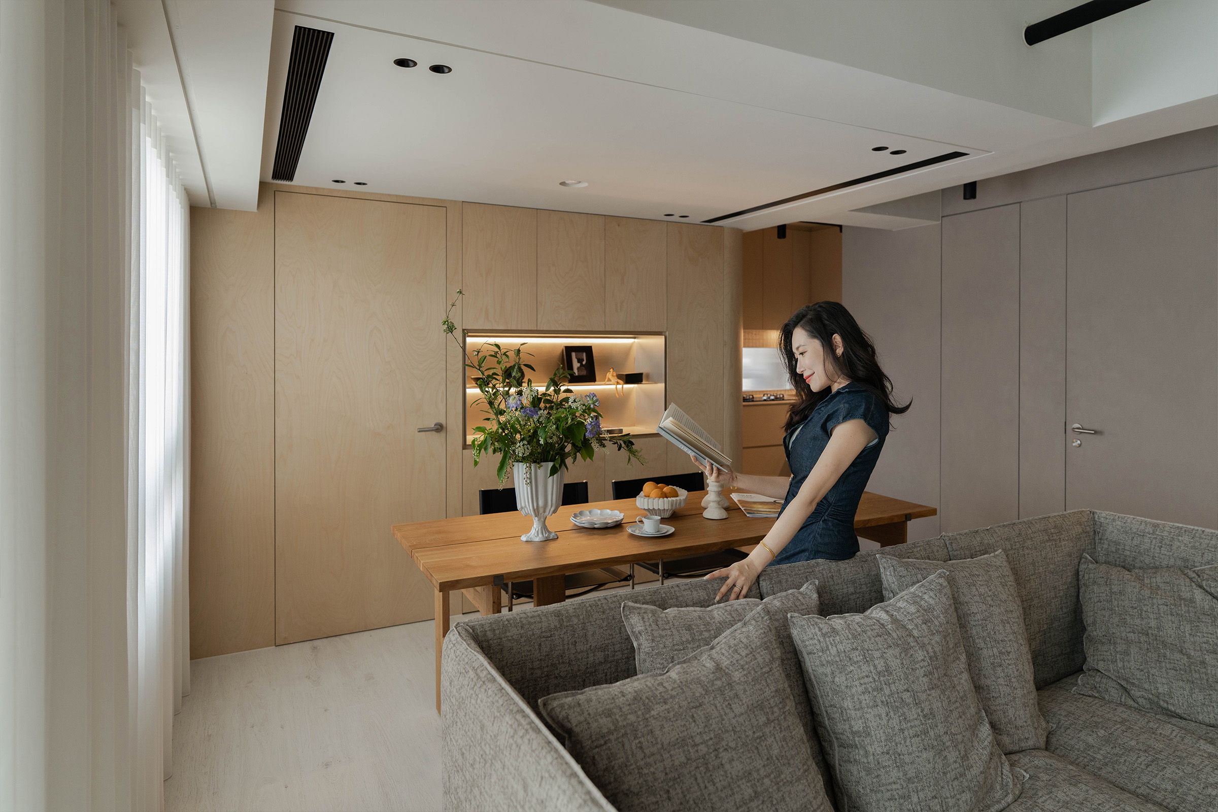 開放式客餐廳以灰階與淺木色作為空間基調,客廳放上一張Gervasoni的灰綠色沙發,溫柔地擁抱著每一次坐下,成為日常片刻最安靜的靠岸。短焦投影則取代了既定的電視牆,不只放大了空間感,也讓小宅的生活場景更為多元—— 白天是閱讀、晚上是觀影,週末亦是朋友聚會的舞台,當畫面投影上牆,牆面瞬間化為家的第二扇窗,在這裡匯聚了日常的每一個瞬間,於舒適與從容中自在綻放。